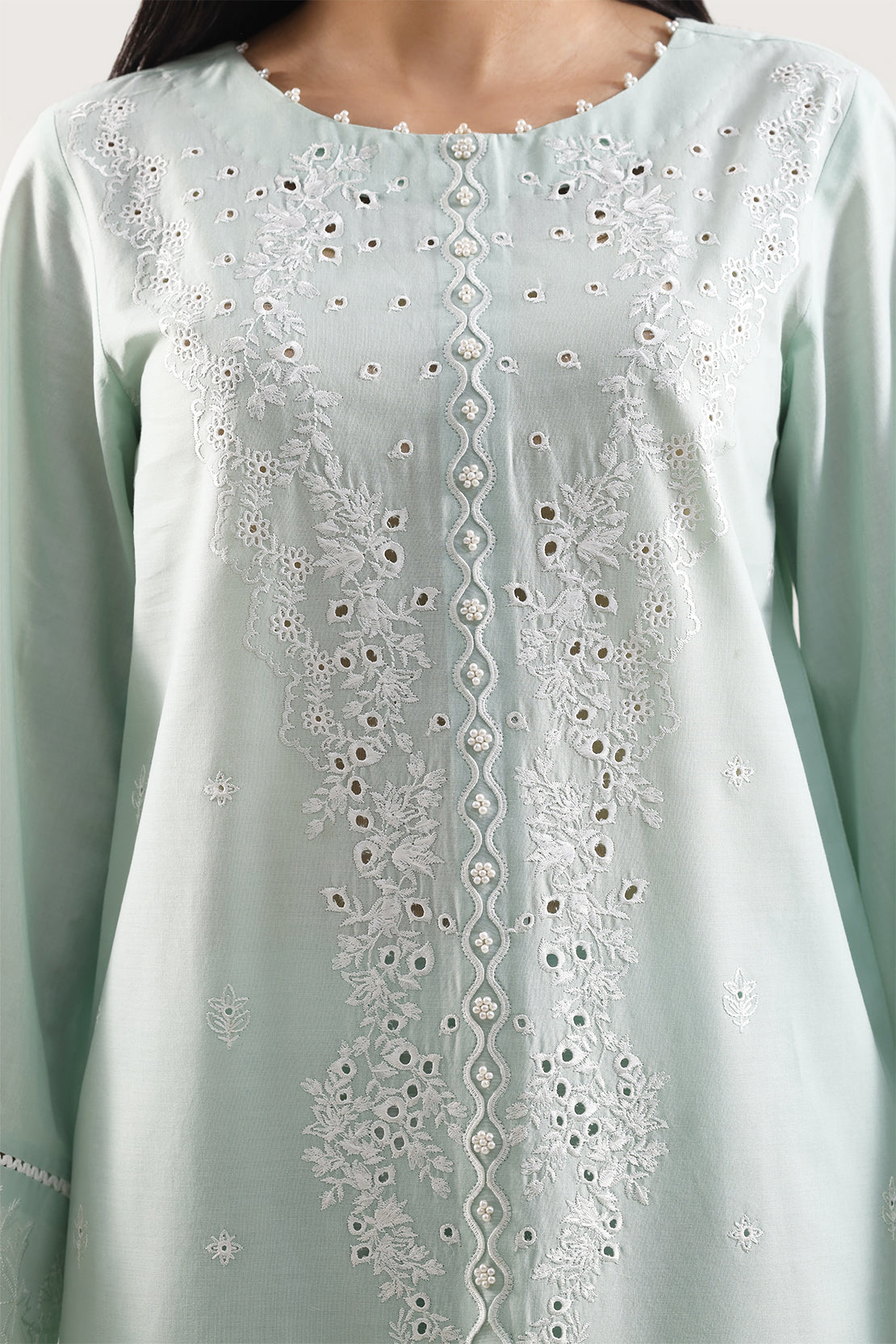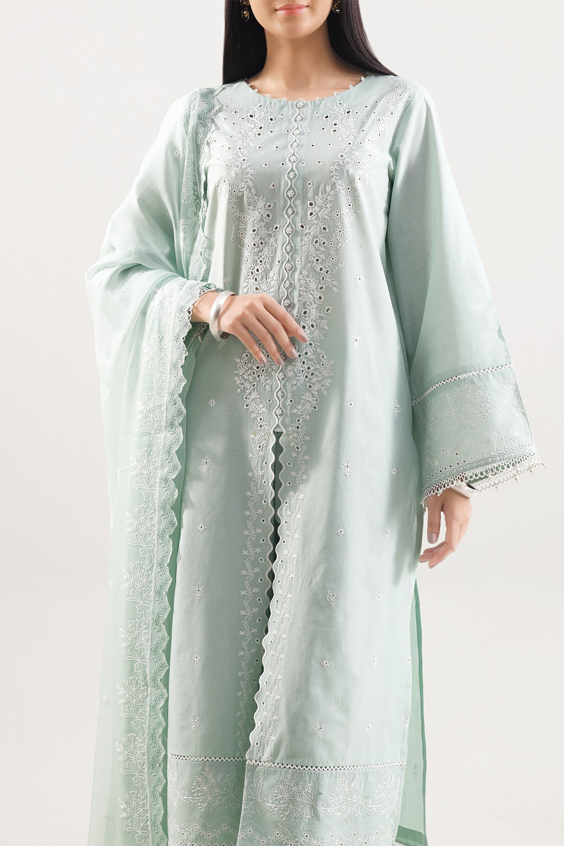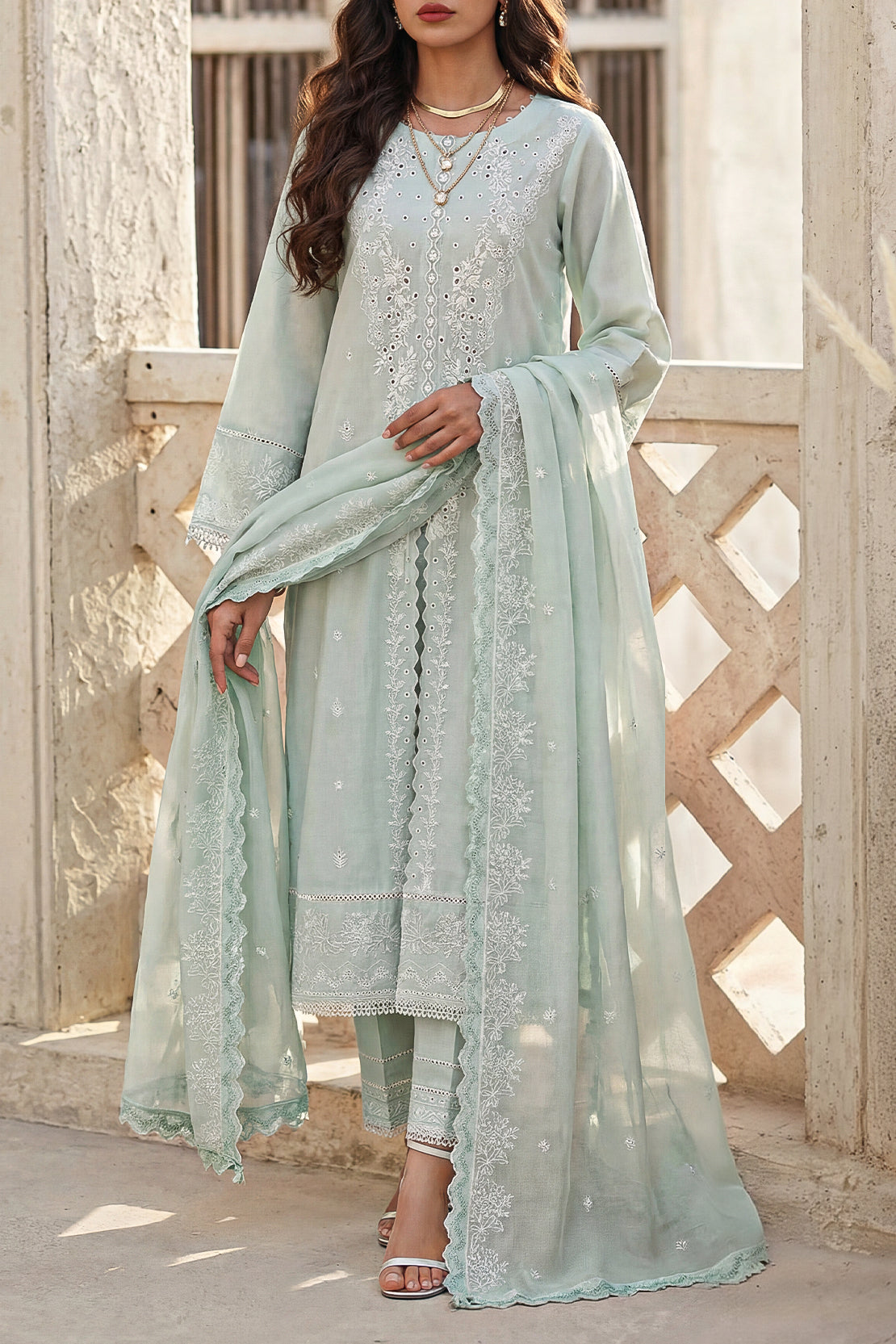 Exquisitely Crafted In Premium Cambric, This Unstitched Three‑Piece SAYA Ensemble Features A Solid+Embroidered Shirt With Elegant Tone‑On‑Tone Embroidery, Coordinated Cambric Trouser Fabric, And A Feather‑Light Chiffon Dupatta That Adds Graceful Draping. The Breathable Cambric Ensures Comfort And Easy Tailoring, While The Subtle Embroidery Elevates The Look With Delicate Sophistication. Versatile For Daytime Gatherings, Semi‑Formal Events Or Chic Everyday Wear, This Set Combines Utility, Comfort And Classic Style For The Modern Woman.