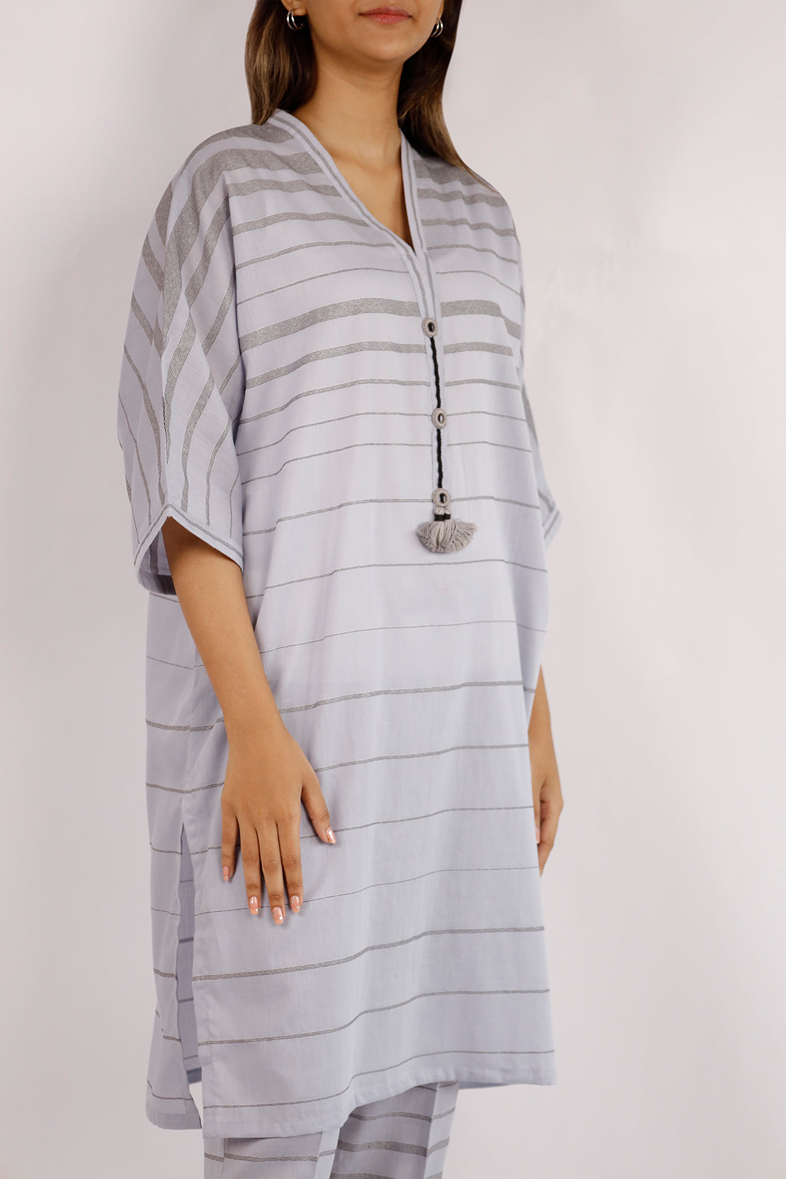 Enhance your everyday style with this cotton jacquard stitched 2-piece set in elegant lilac grey. The ensemble includes a ready-to-wear jacquard shirt paired with a matching stitched trouser, perfect for casual outings and semi-formal gatherings. Experience premium comfort and sophistication.