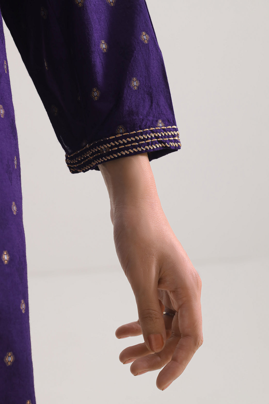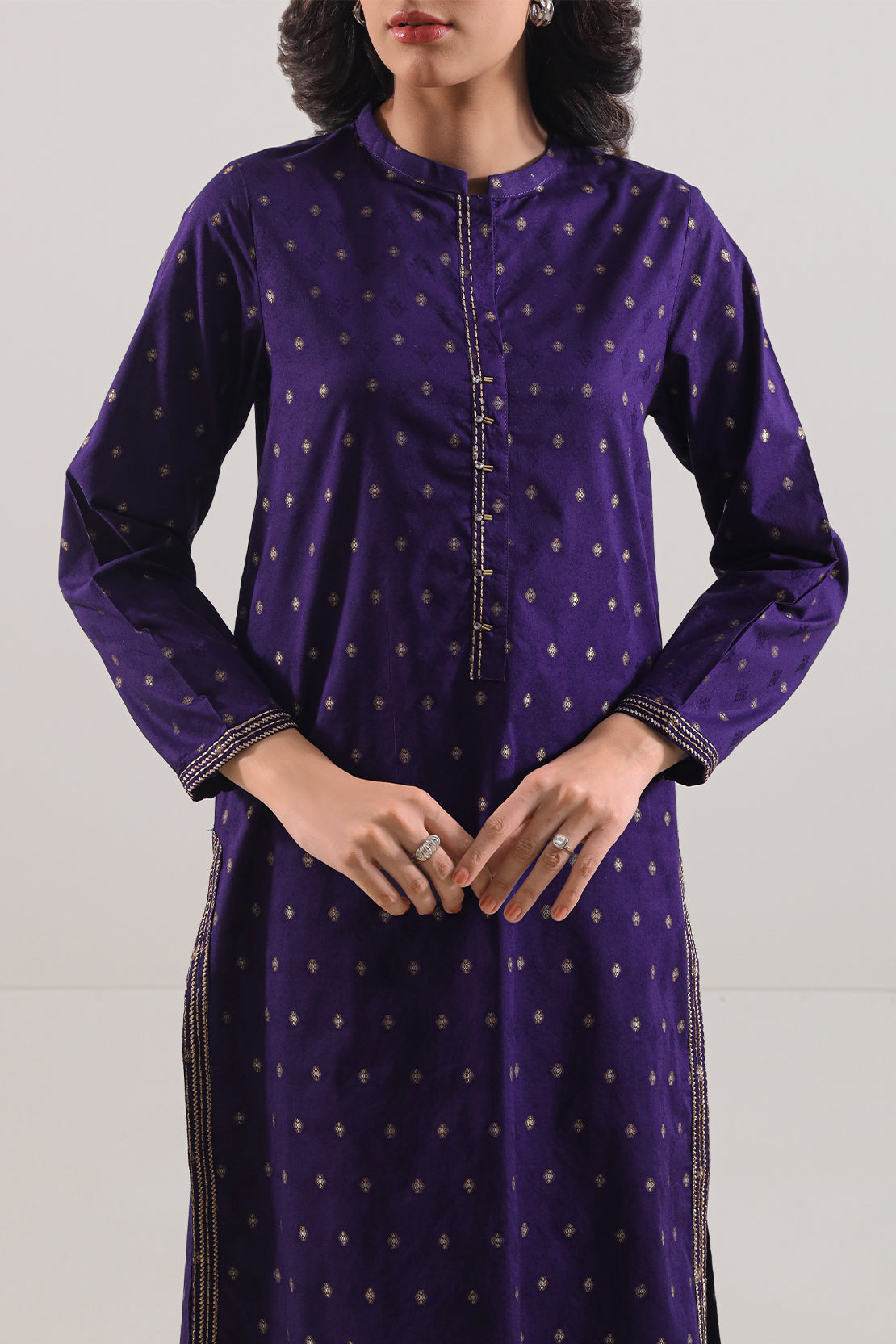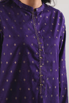 Refined Embroidered Cotton Jacquard Two-Piece Shirt & Trouser Set By SAYA, Expertly Crafted From Luxurious Cotton Jacquard Fabric That Balances Rich Texture With Breathable Comfort. The Shirt Features Elegant Embroidery Detailing Over A Bold Purple Hue, Creating A Statement Of Sophisticated Style Ideal For Semi-Formal Gatherings, Festive Occasions, Or Evening Soirees. The Matching Stitched Trouser In The Same Purple Tone Complements The Ensemble For A Cohesive And Polished Look. Premium Stitching, Ready-To-Wear Cut, And Natural Fibres Ensure Ease And Comfort, Making This Set A Perfect Blend Of Fashion, Utility, And Timeless Elegance.