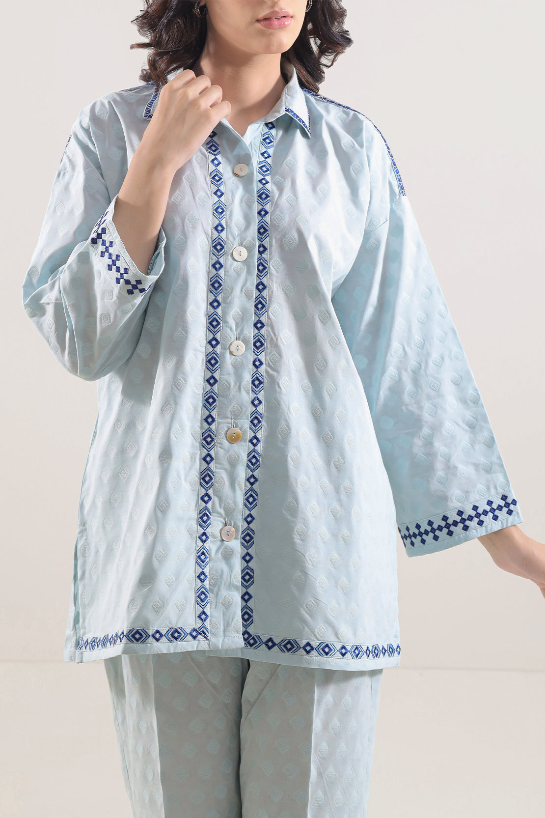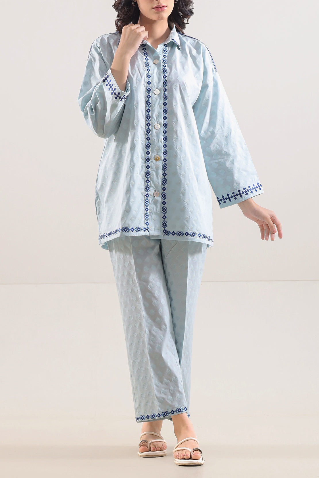 Elevate Your Everyday Style With This Embroidered Cotton Jacquard Stitched 2-Piece Set By SAYA, Crafted From Rich Jacquard Fabric That Offers Textural Depth And Durable Comfort. The Ready-To-Wear Shirt Features Structured Weave With Polished Embroidery Detailing, While The Trouser Provides A Seamless Fit And Practical Ease. Ideal For Smart-Casual Outings, Office Wear, Or Semi-Formal Events Where Understated Elegance Meets Functional Comfort.