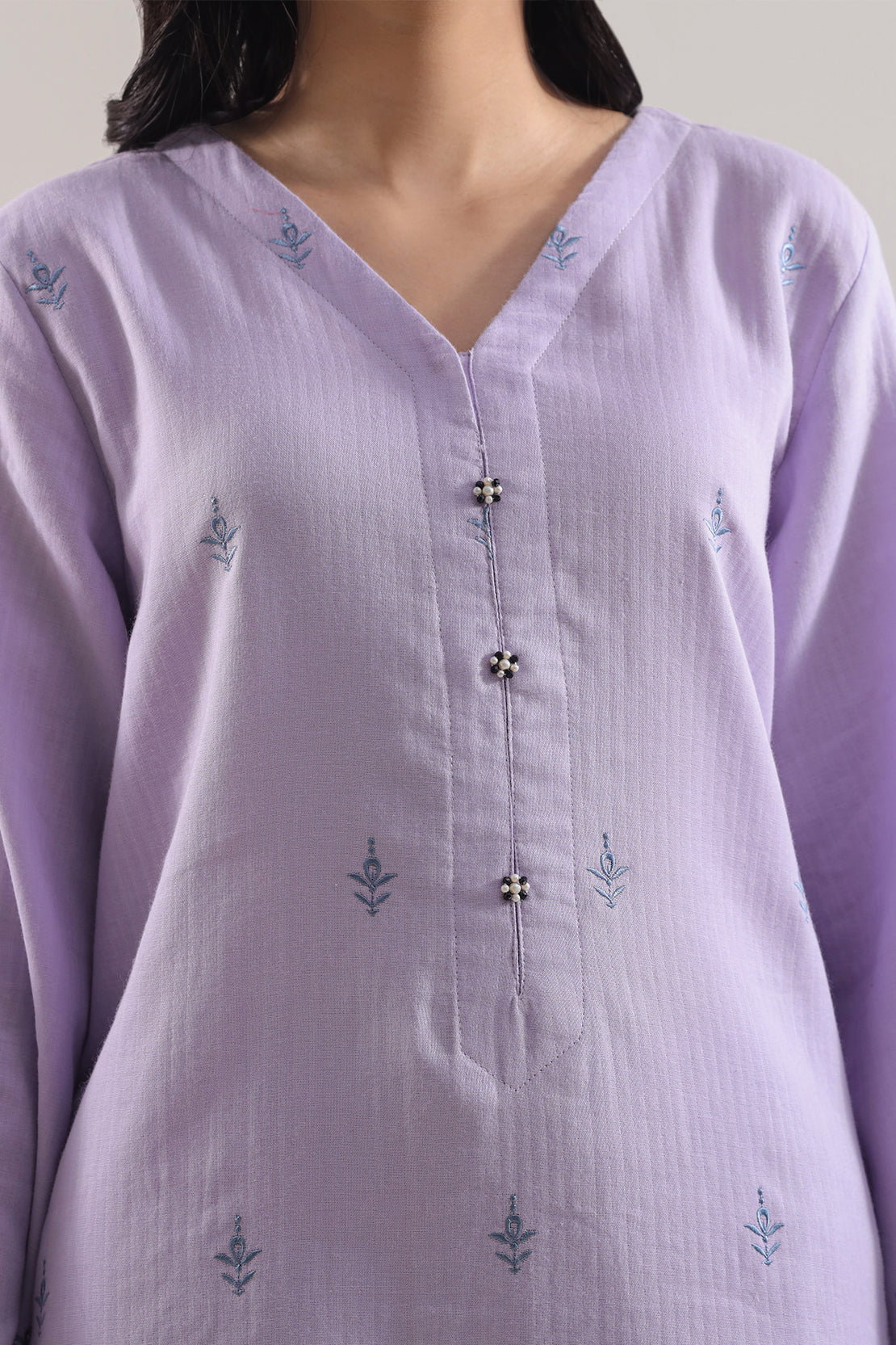 Solid Embroidered Cotton Two-Piece From SAYA In Soft Lilac Features A Ready-To-Wear Embroidered Shirt And Matching Trouser. Breathable Cotton Ensures Comfort And Durability, While The Solid Hue With Embroidery Adds Subtle Elegance. Perfect For Semi-Formal Events Or Everyday Wear When You Want A Refined Yet Relaxed Look.