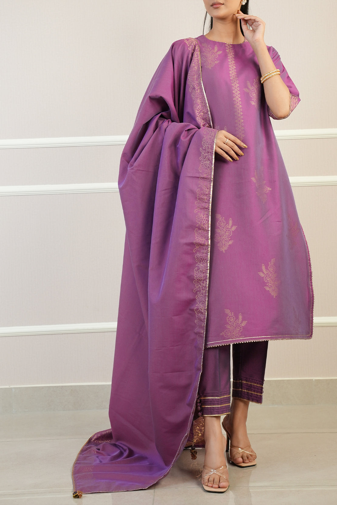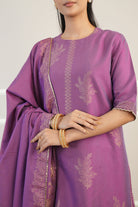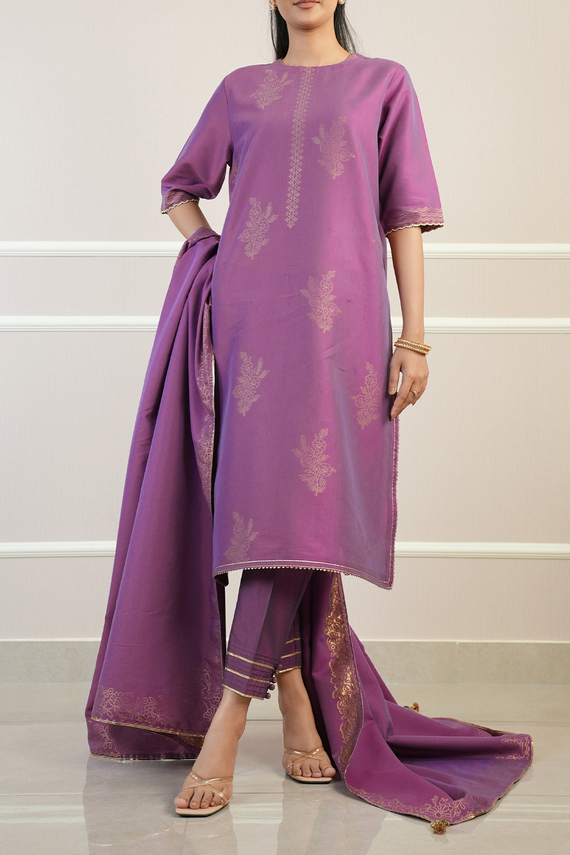 Elevate your wardrobe with Saya's Luxury Pret Cotton Jacquard Stitched 3-Piece ensemble. This set features a premium cotton jacquard shirt adorned with intricate, a matching jacquard dupatta, and dyed trousers. Designed for both comfort and elegance, it's perfect for formal occasions.
