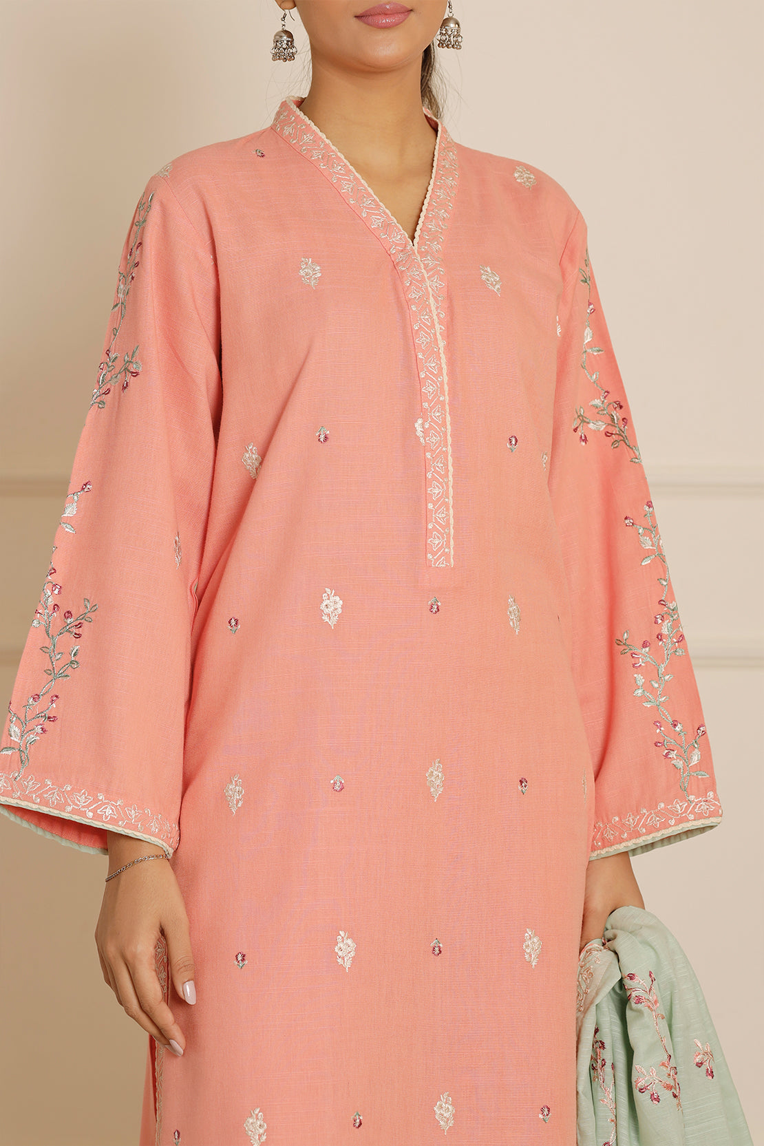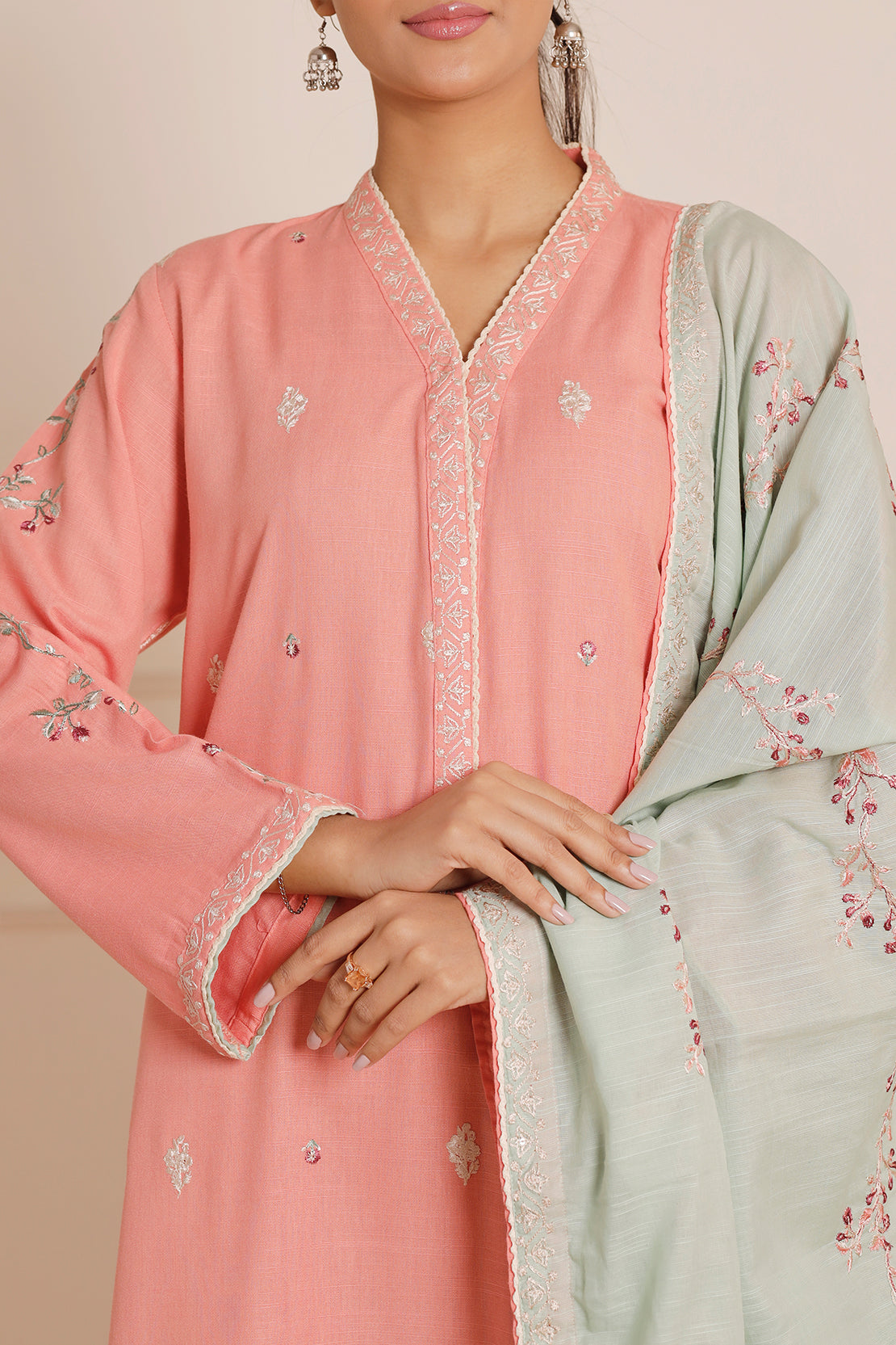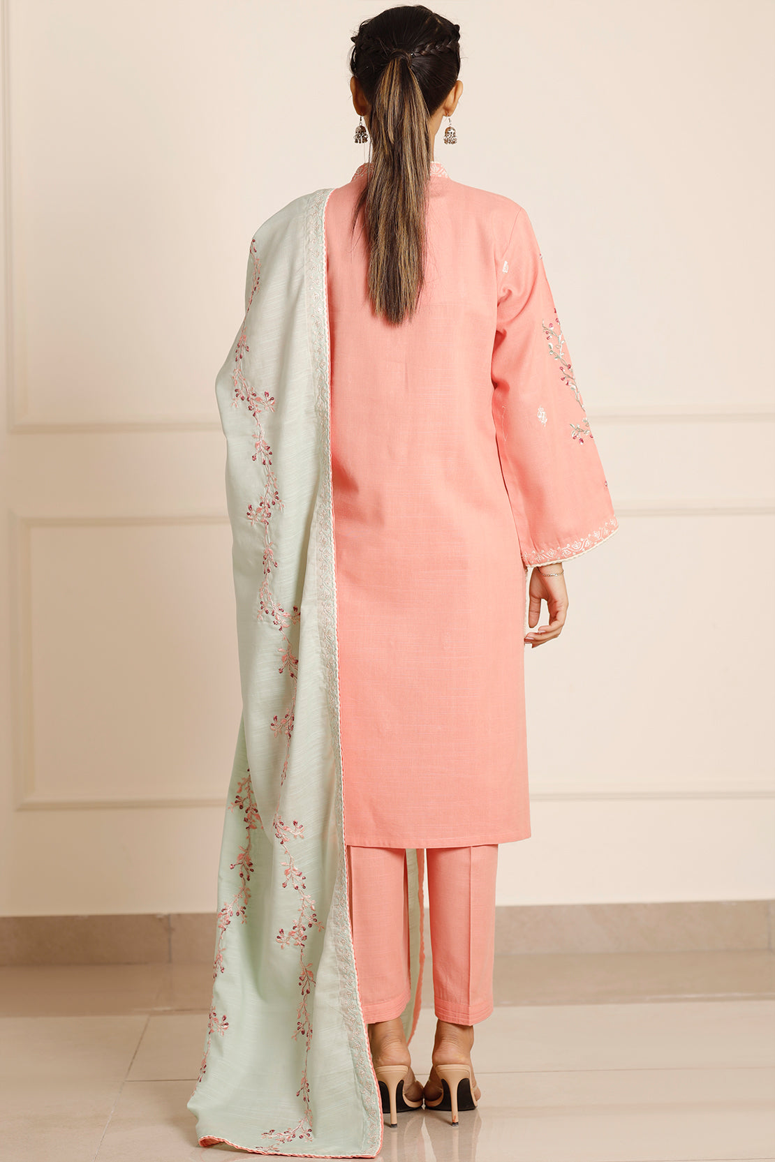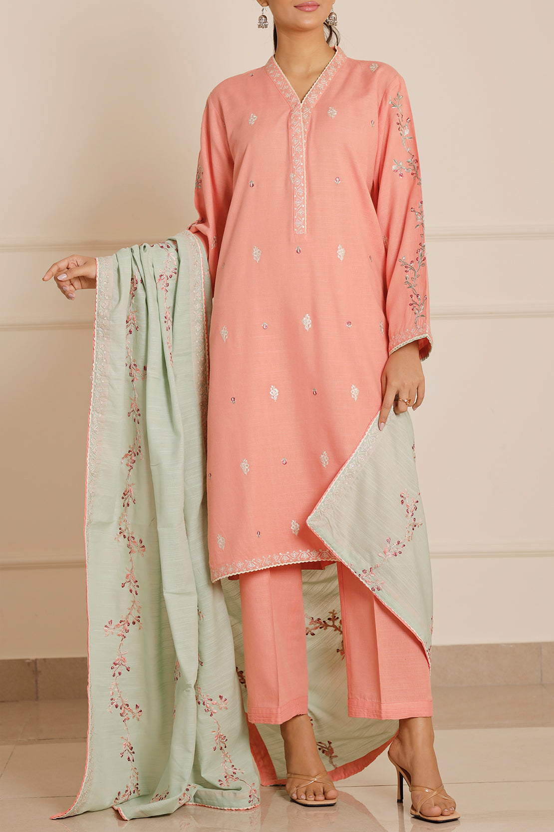 Enhance your wardrobe with this Solid Embroidered Cotton Viscose Stitched 3-Piece ensemble. Designed for elegance and comfort, this premium cotton-viscose outfit features delicate embroidery, ensuring a graceful look for any occasion. The soft, breathable fabric offers effortless wear, making it a must-have for your seasonal collection.