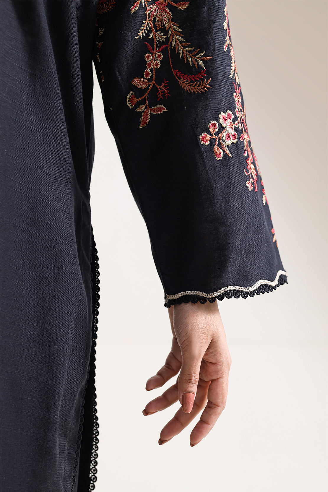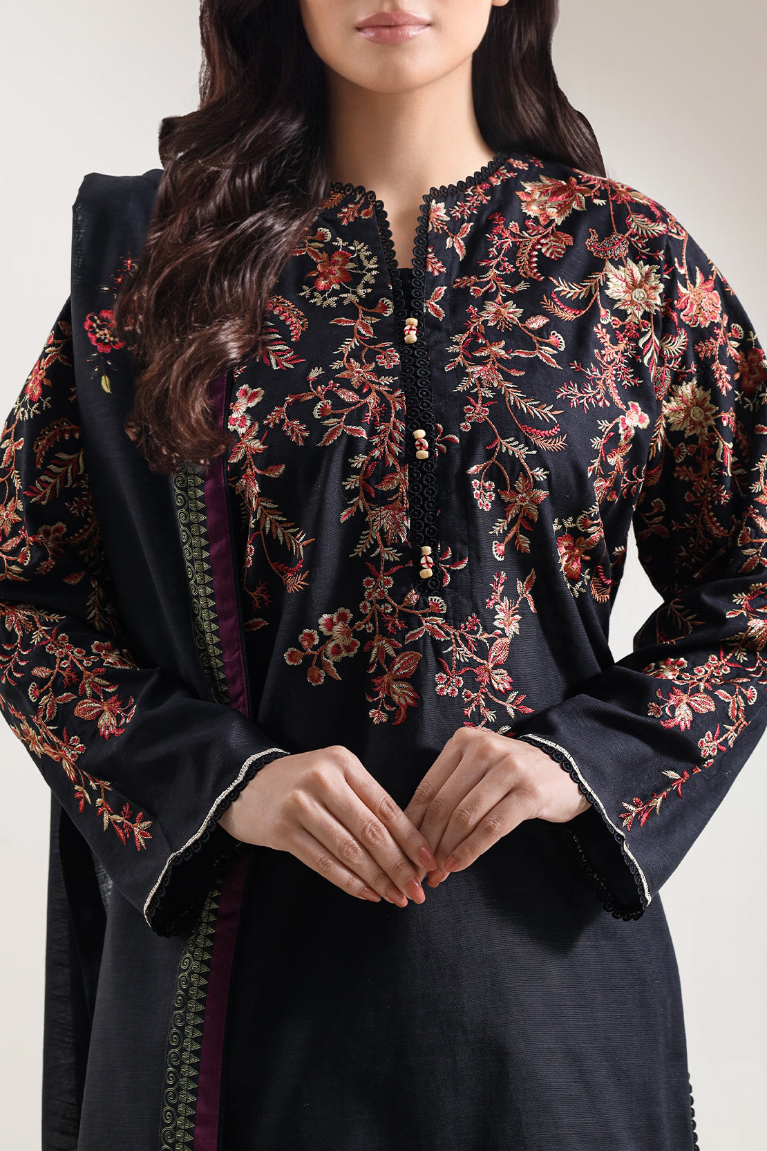 SAYA's Solid Embroidered Khaddar Stitched Three-Piece Set Features Meticulous Hand-Embroidered Details On Khaddar. Expertly Tailored For A Ready-To-Wear Fit, This Coordinated Ensemble Offers A Substantial Drape And Sophistication. Perfect For Autumn Weddings, Cultural Celebrations, And Distinguished Gatherings, It Embodies A Timeless Synthesis Of Artisanal Craftsmanship, Understated Elegance, And Effortless, Warm-Weather Style.