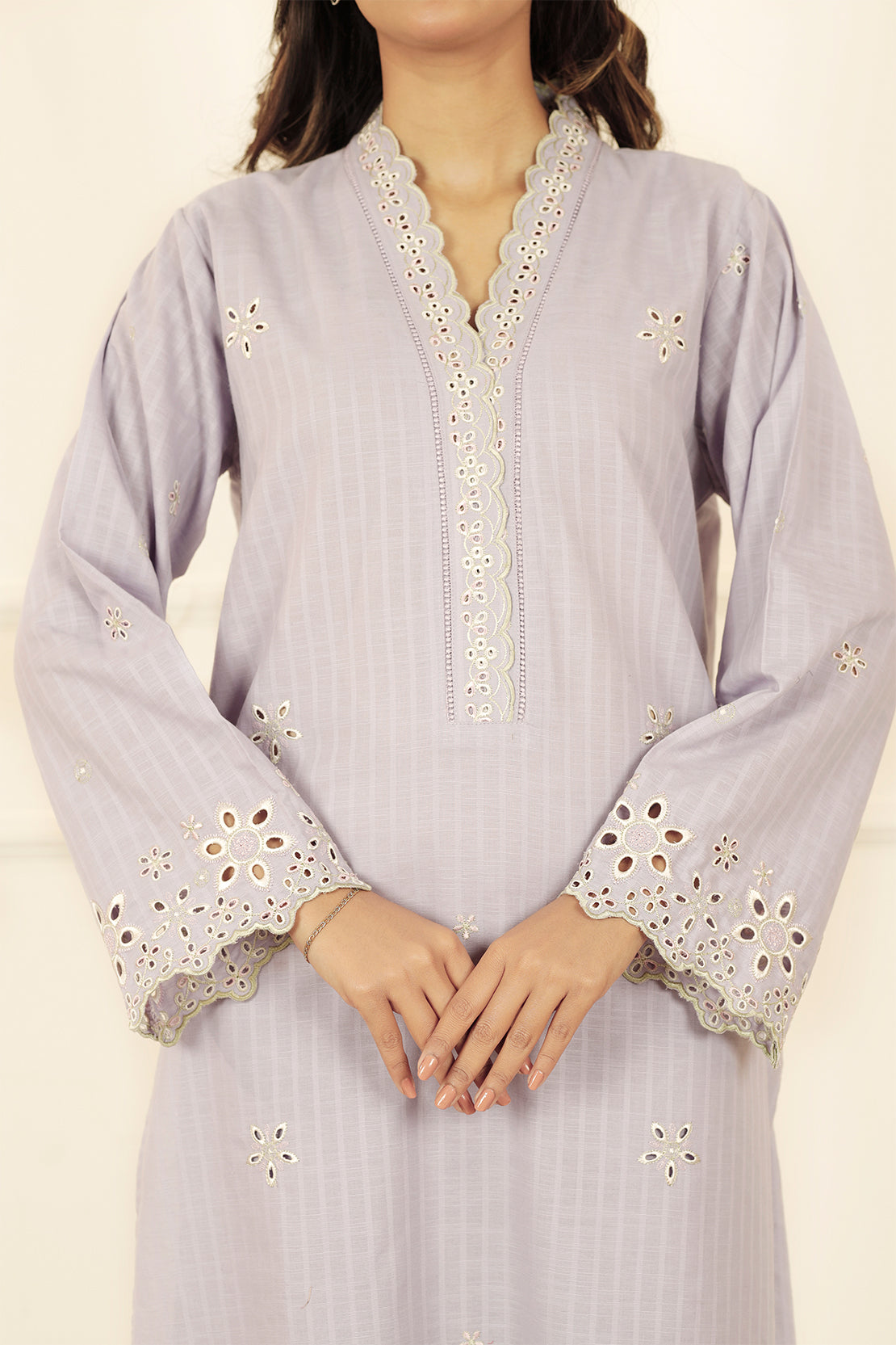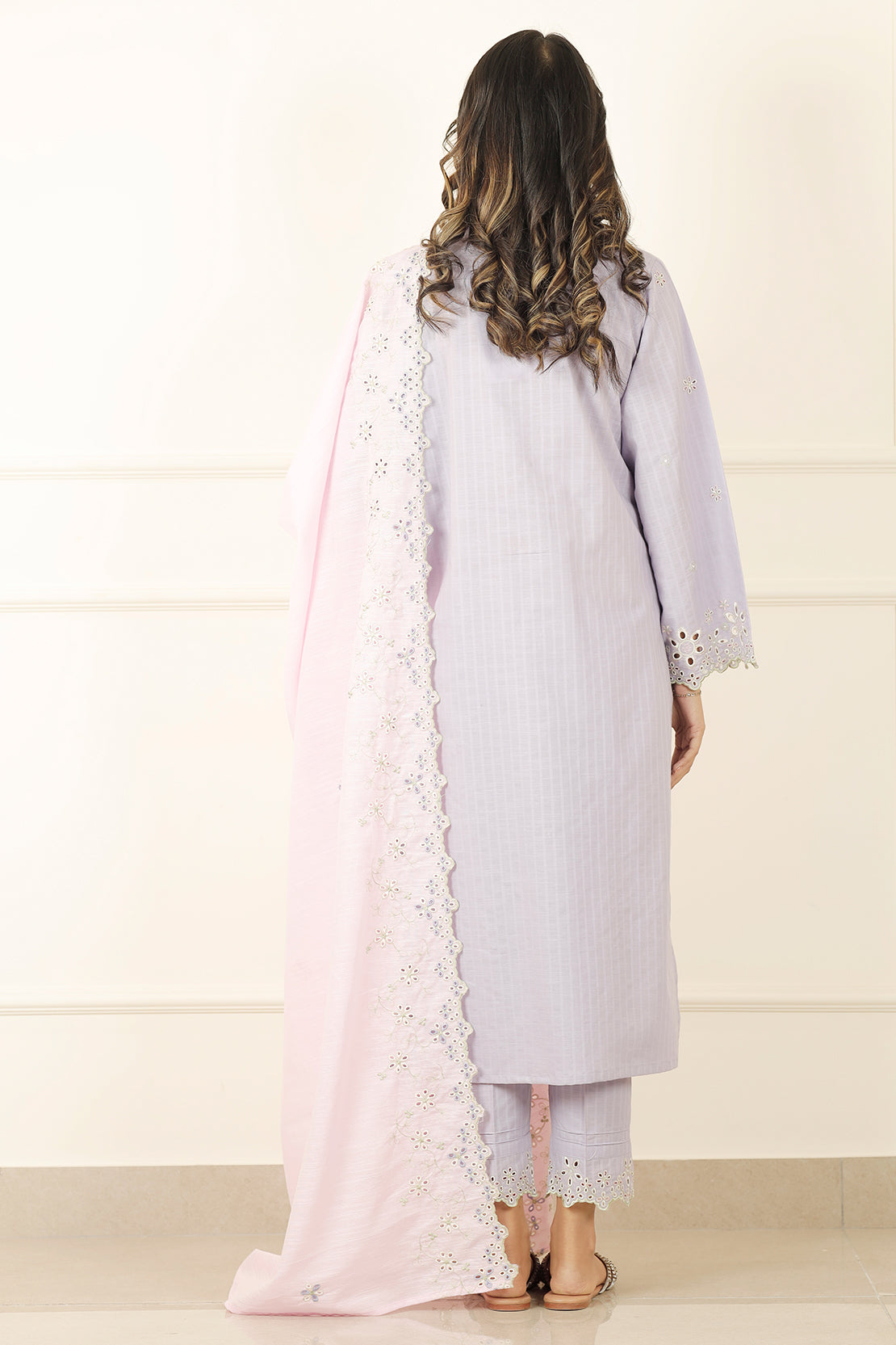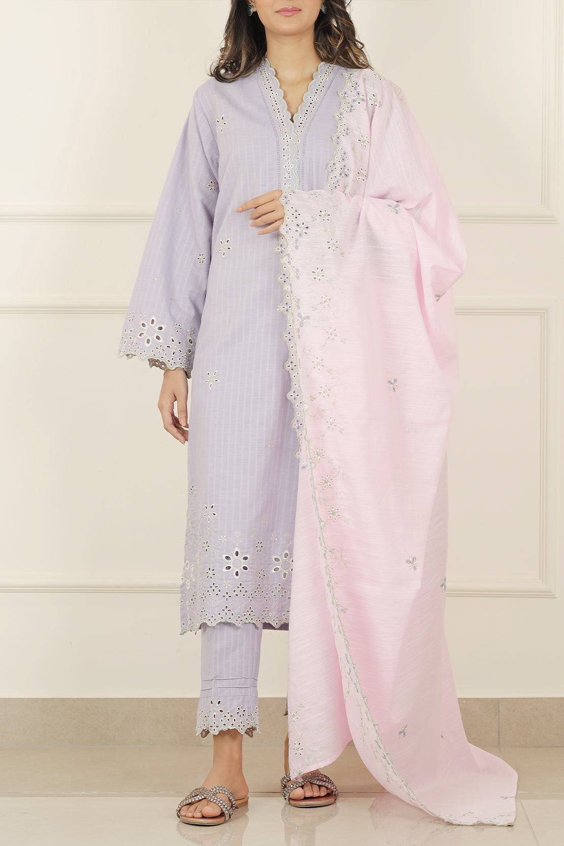Introducing Saya's Solid Embroidered Slub Cotton Stitched 3-Piece ensemble, a harmonious blend of elegance and comfort. This ready-to-wear set features a beautifully embroidered slub cotton shirt, dyed trousers, and a coordinating winter cotton dupatta. Crafted from premium slub cotton, this ensemble ensures breathability and durability, making it ideal for both casual and formal occasions.