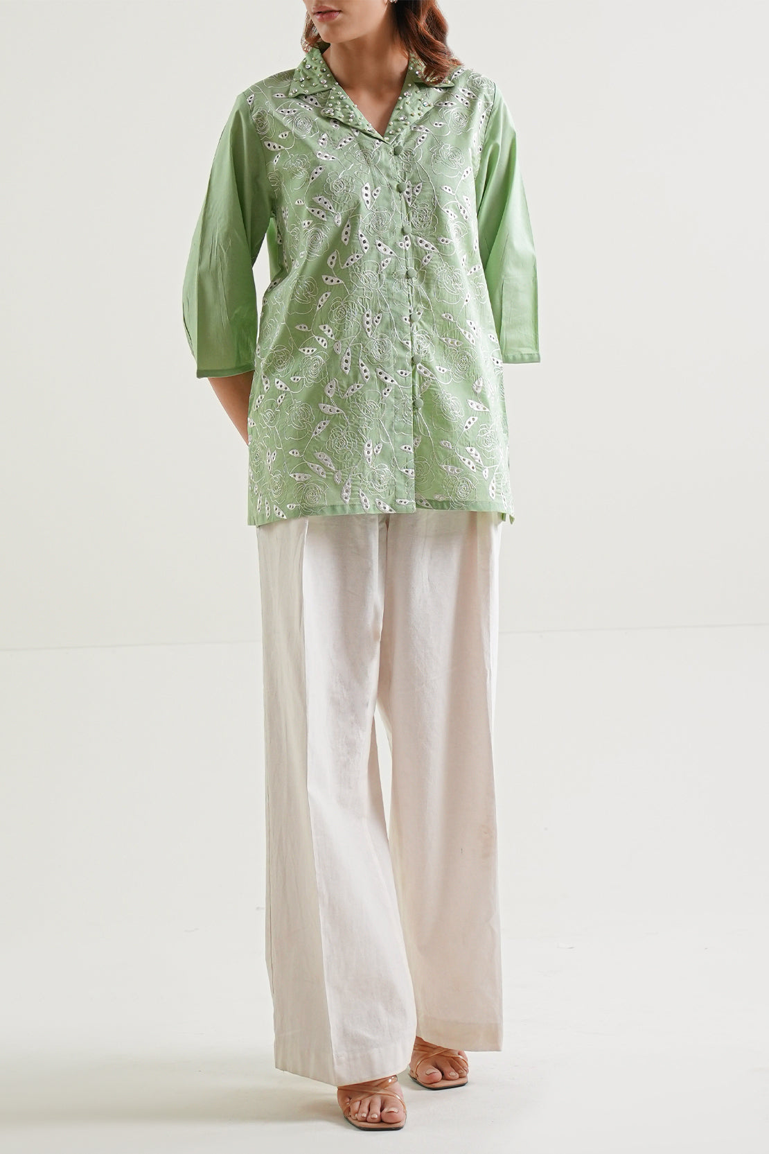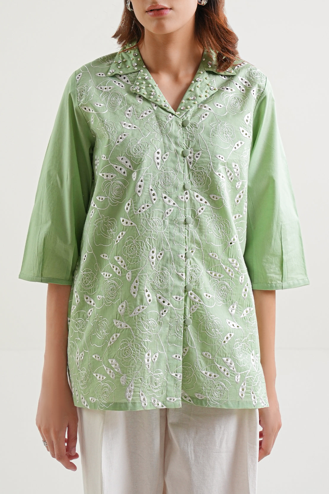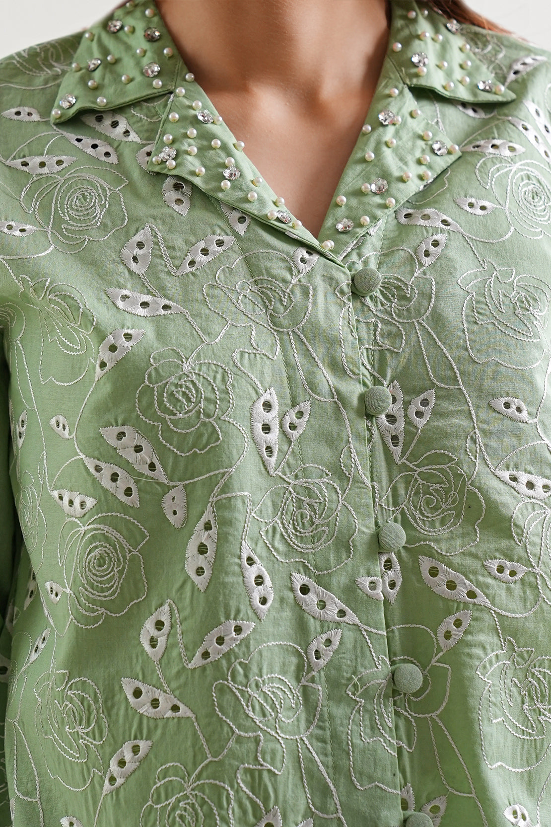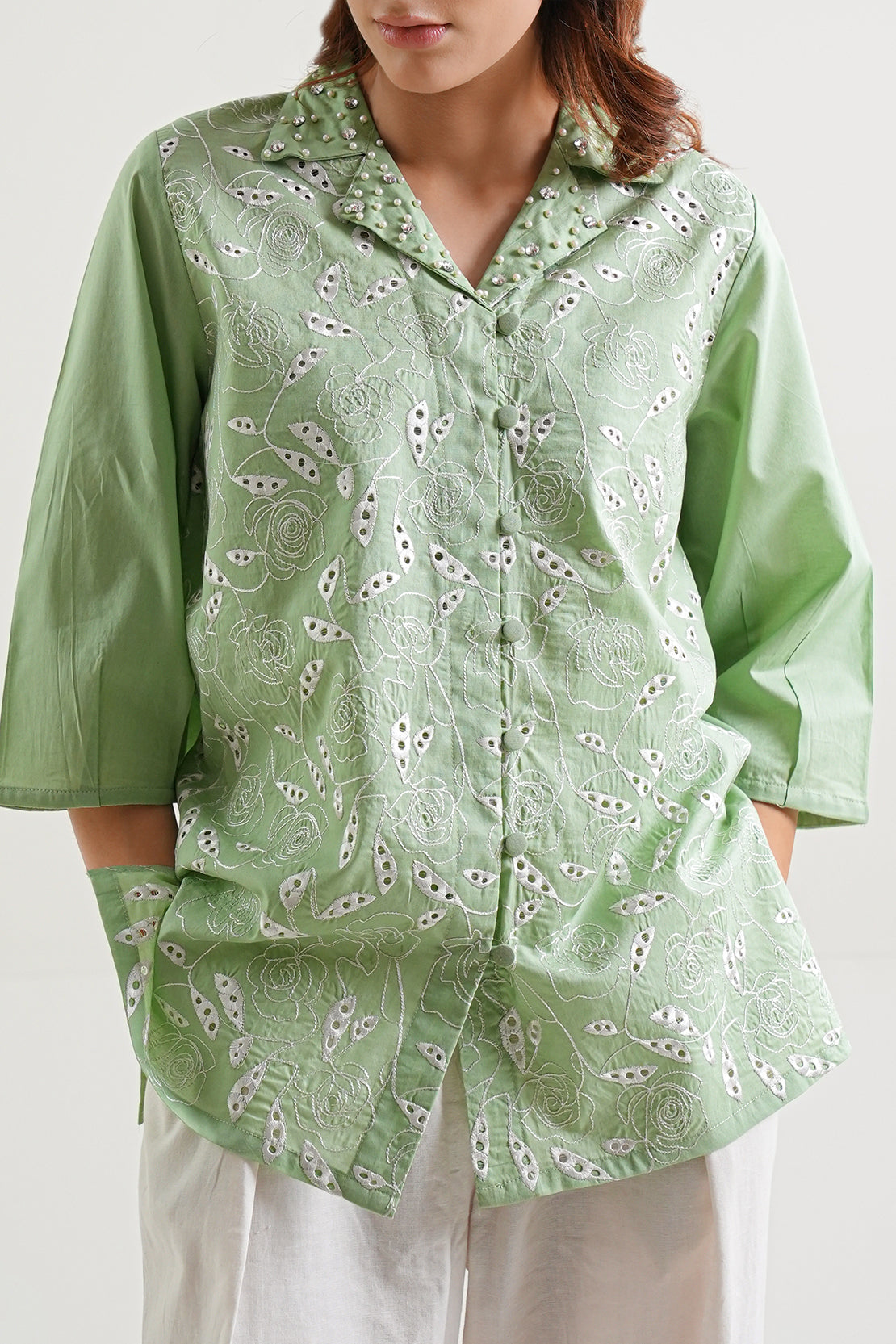 Solid Embroidered Cotton Stitched Shirt By SAYA Comes In A Refined Mint Green Shade. Made From Premium, Breathable Cotton With Subtle Tone-On-Tone Embroidery, It Offers Clean Lines, Crisp Collar, And Structured Silhouette. Designed As A Ready-To-Wear Piece, It Combines Practicality With Elegant Detailing. Ideal For Office Wear, Evening Dinners, Or Semi-Formal Events Where Understated Style Matters.