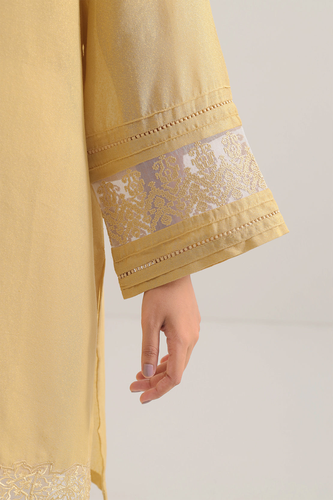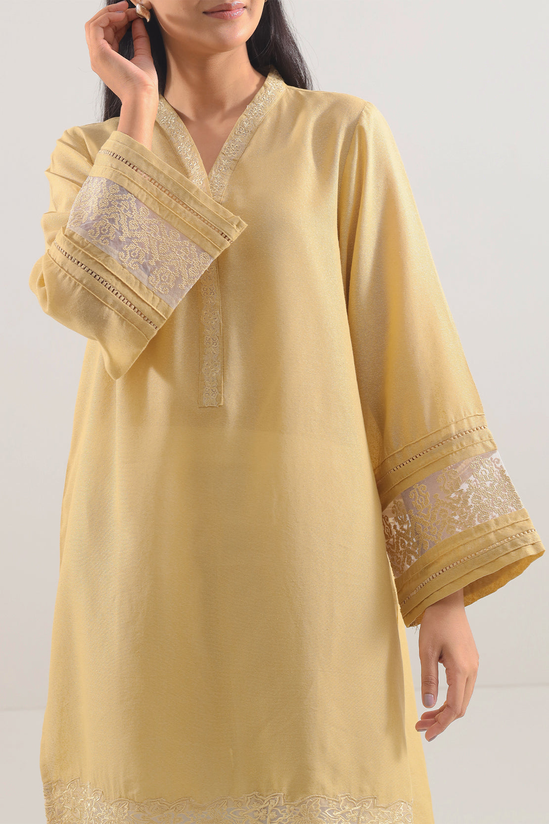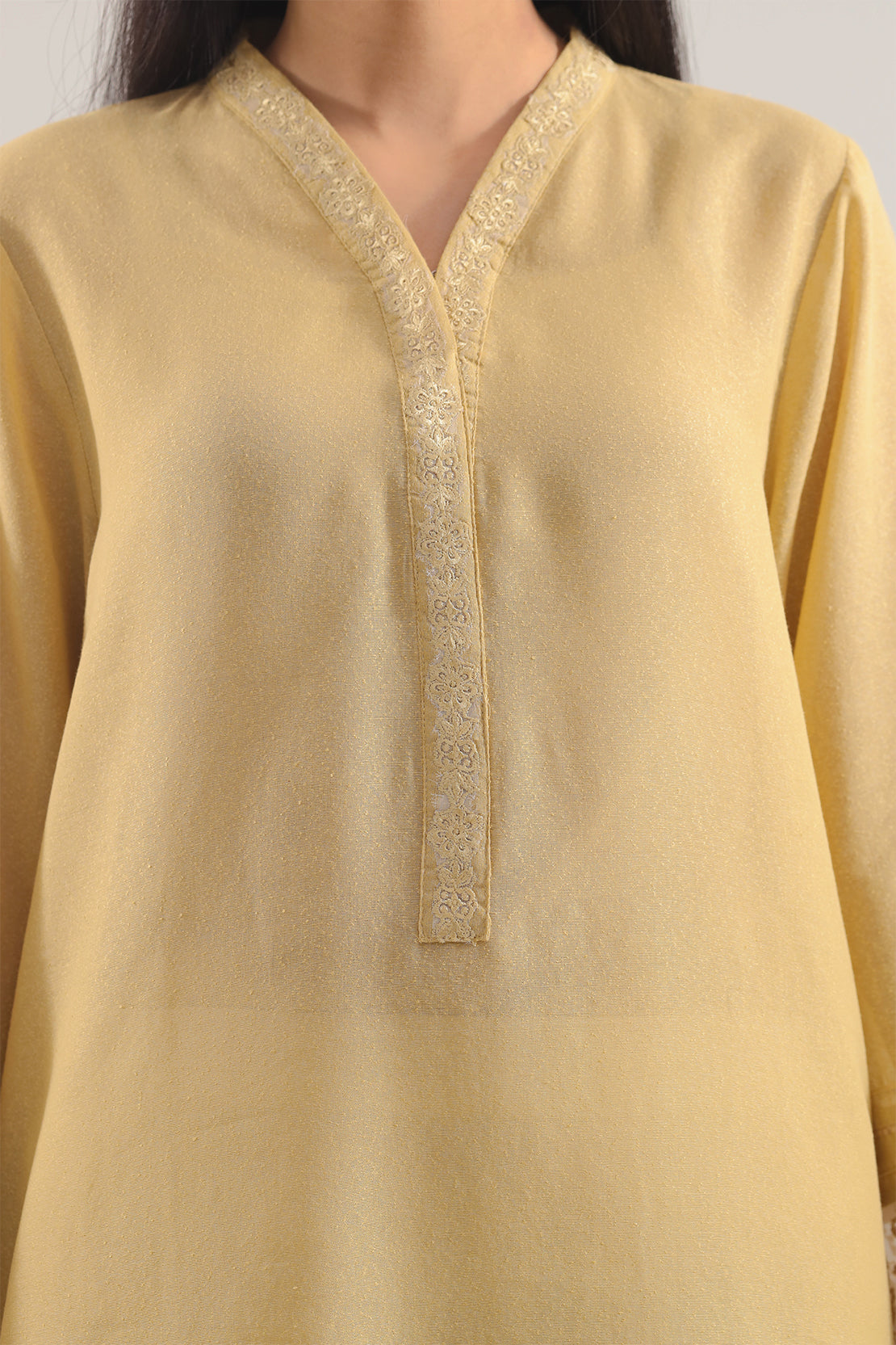 Solid Embroidered Karandi Stitched Shirt By SAYA Crafted From Premium Karandi Fabric — A Thick, Textured Cotton Blend Known For Its Warmth And Luxurious Feel. The Yellow Hue Brings A Bright, Cheerful Vibe, While The Delicate Tonal Embroidery Adds A Touch Of Sophistication Without Overpowering. Tailored With Clean Seams, A Sharp Collar, And A Smooth Finish, This Shirt Balances Practicality And Style With Poise. A Must-Have Piece That Elevates Your Look In Cooler Seasons With Distinct Elegance.
