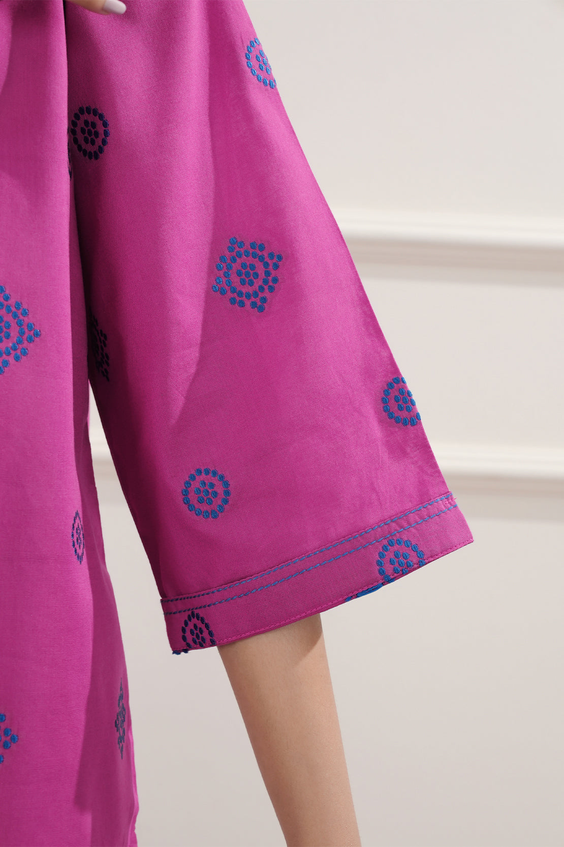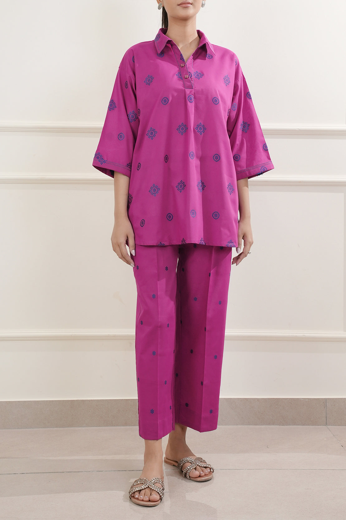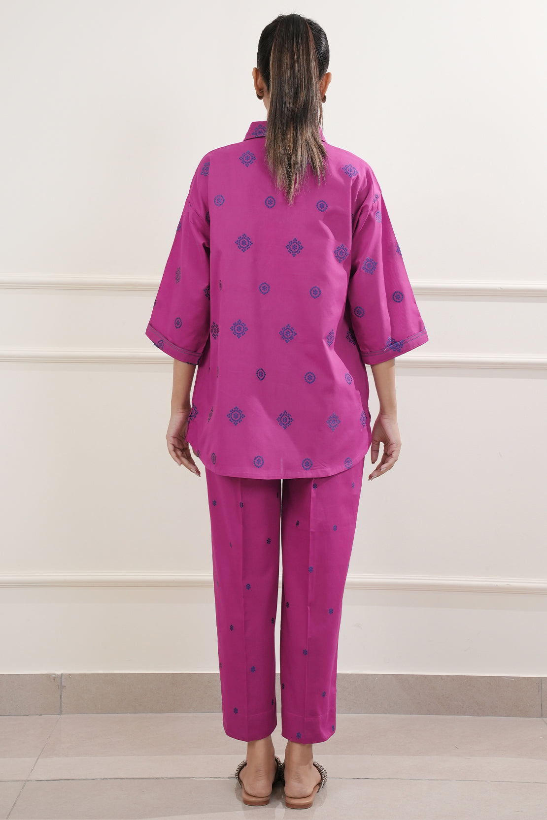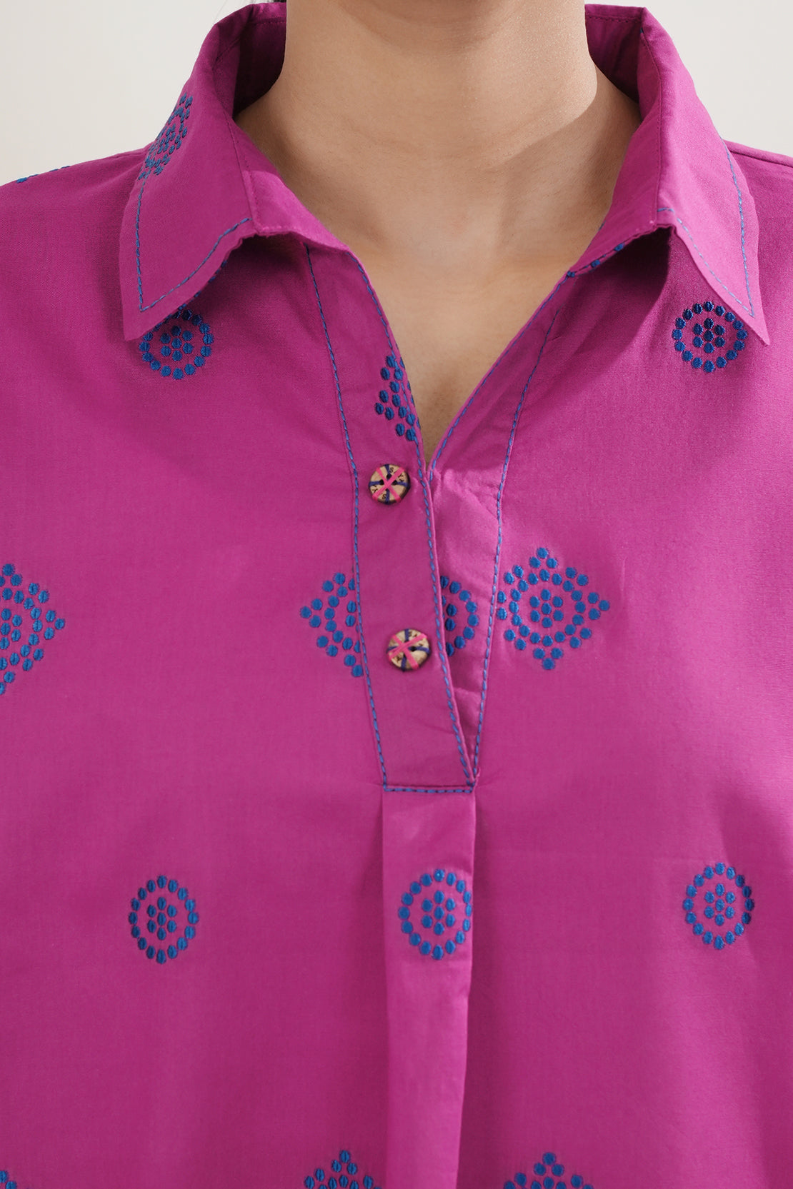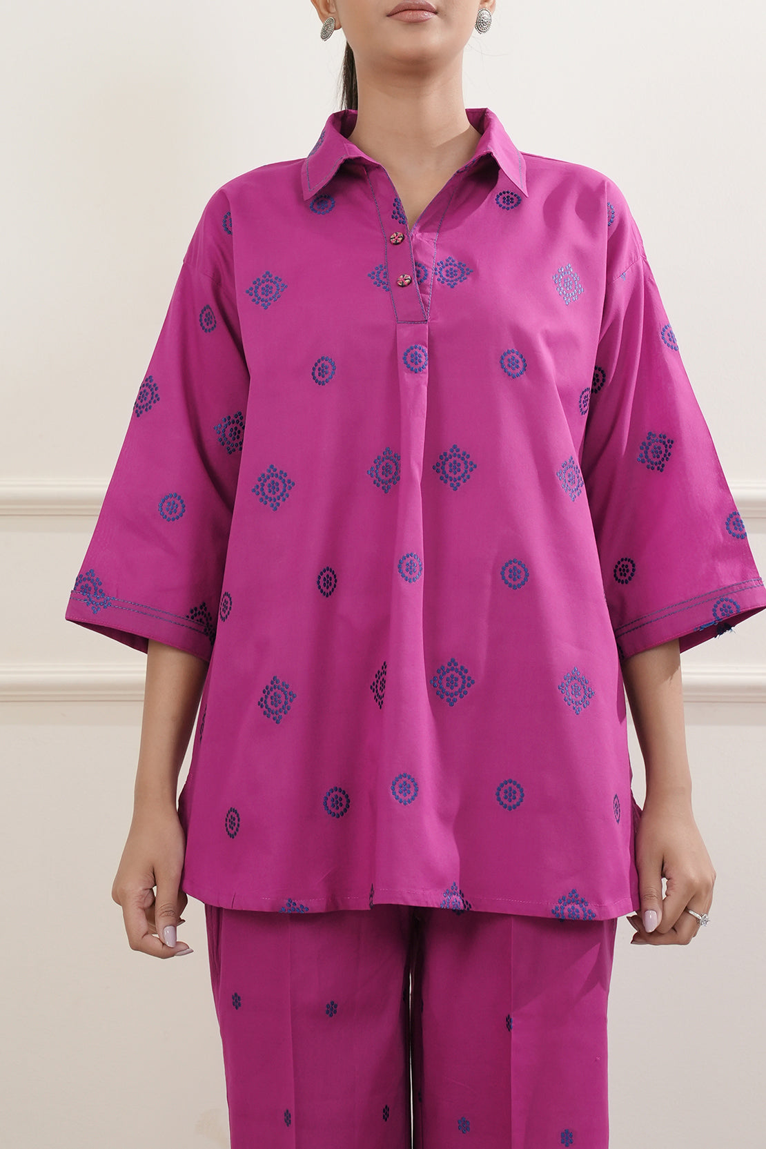 Introducing Saya's Jacquard Cotton Stitched Shirt, a harmonious blend of elegance and comfort. This ready-to-wear piece is crafted from premium cotton jacquard fabric, offering a luxurious texture and feel. The shirt features a rich magenta hue, adding a vibrant touch to your wardrobe. Its tailored stitching ensures a flattering fit, making it suitable for both casual and formal occasions.