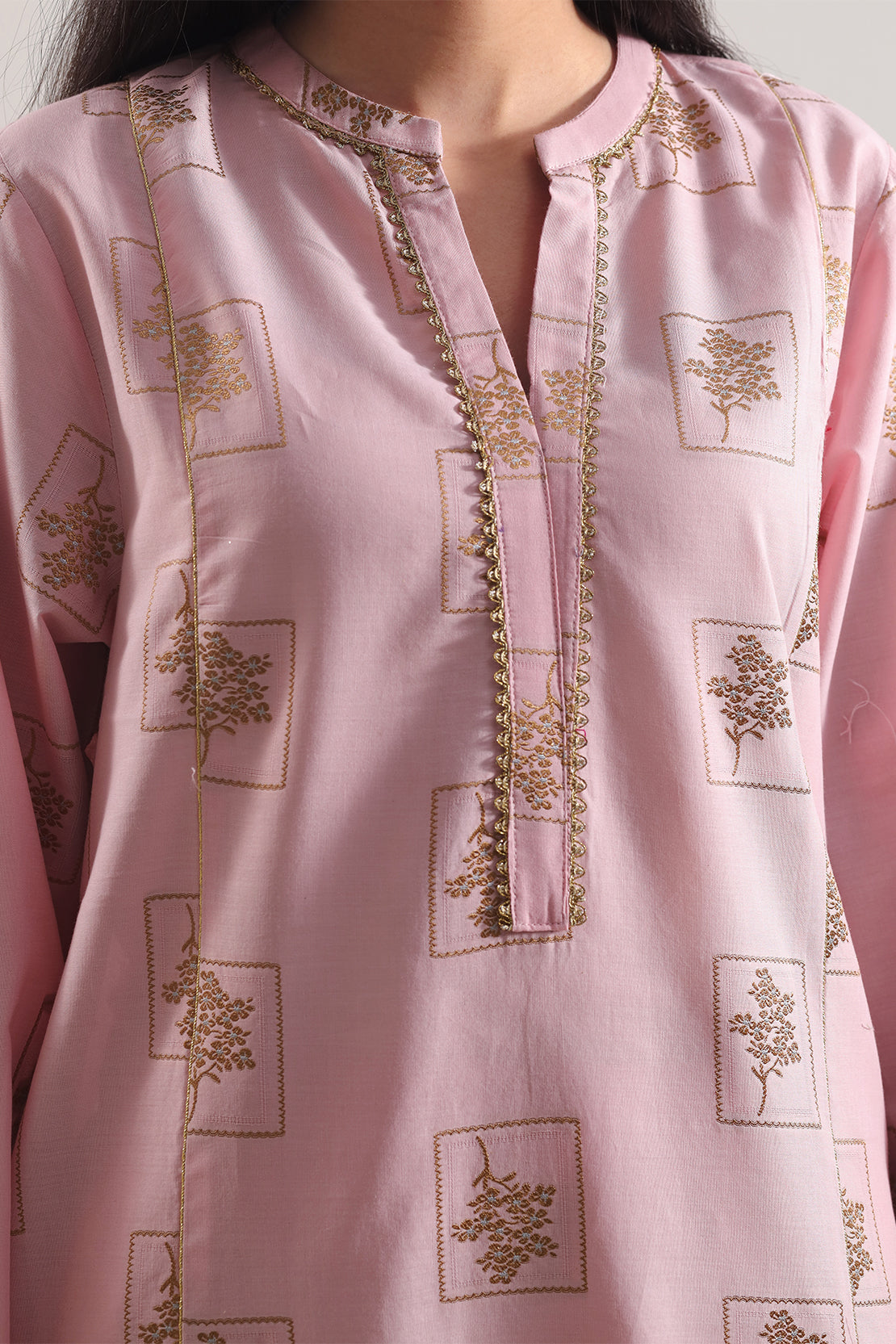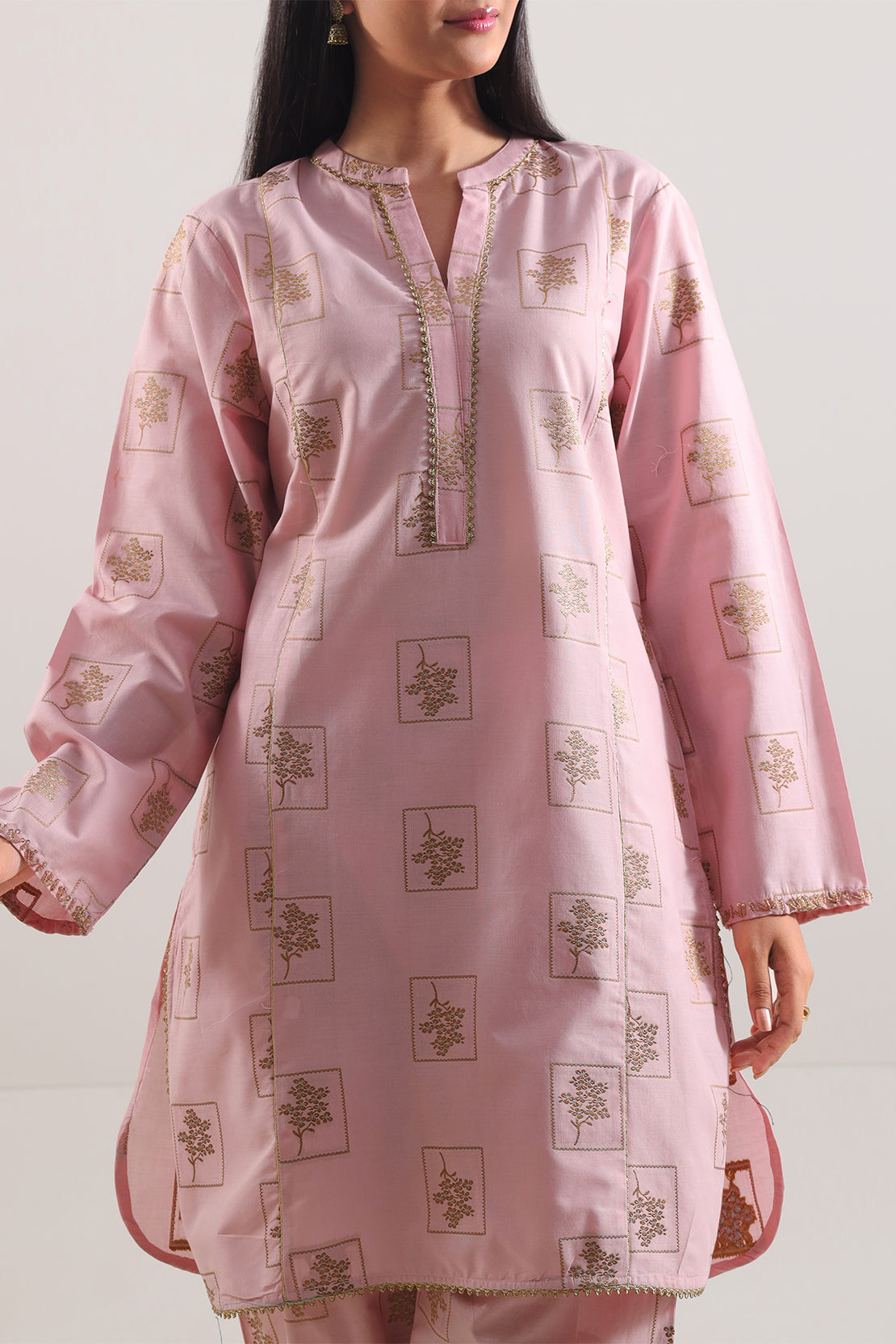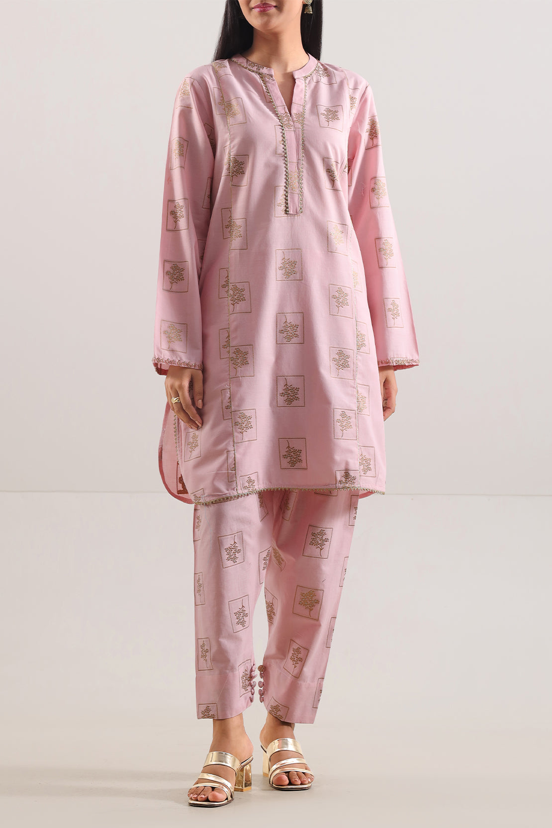 Pink Cotton Jacquard Two-Piece From SAYA Includes A Ready-To-Wear Shirt And Trouser. The Jacquard Weave Adds Elegant Texture, While Breathable Cotton Ensures Comfort. Soft Pink Tone With Clean Tailoring Makes It Perfect For Semi-Formal Outings, Day Events, Or Stylish Casual Looks.