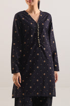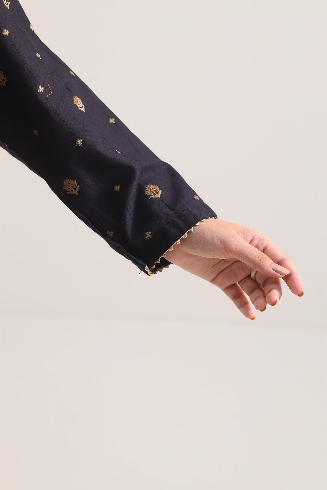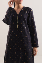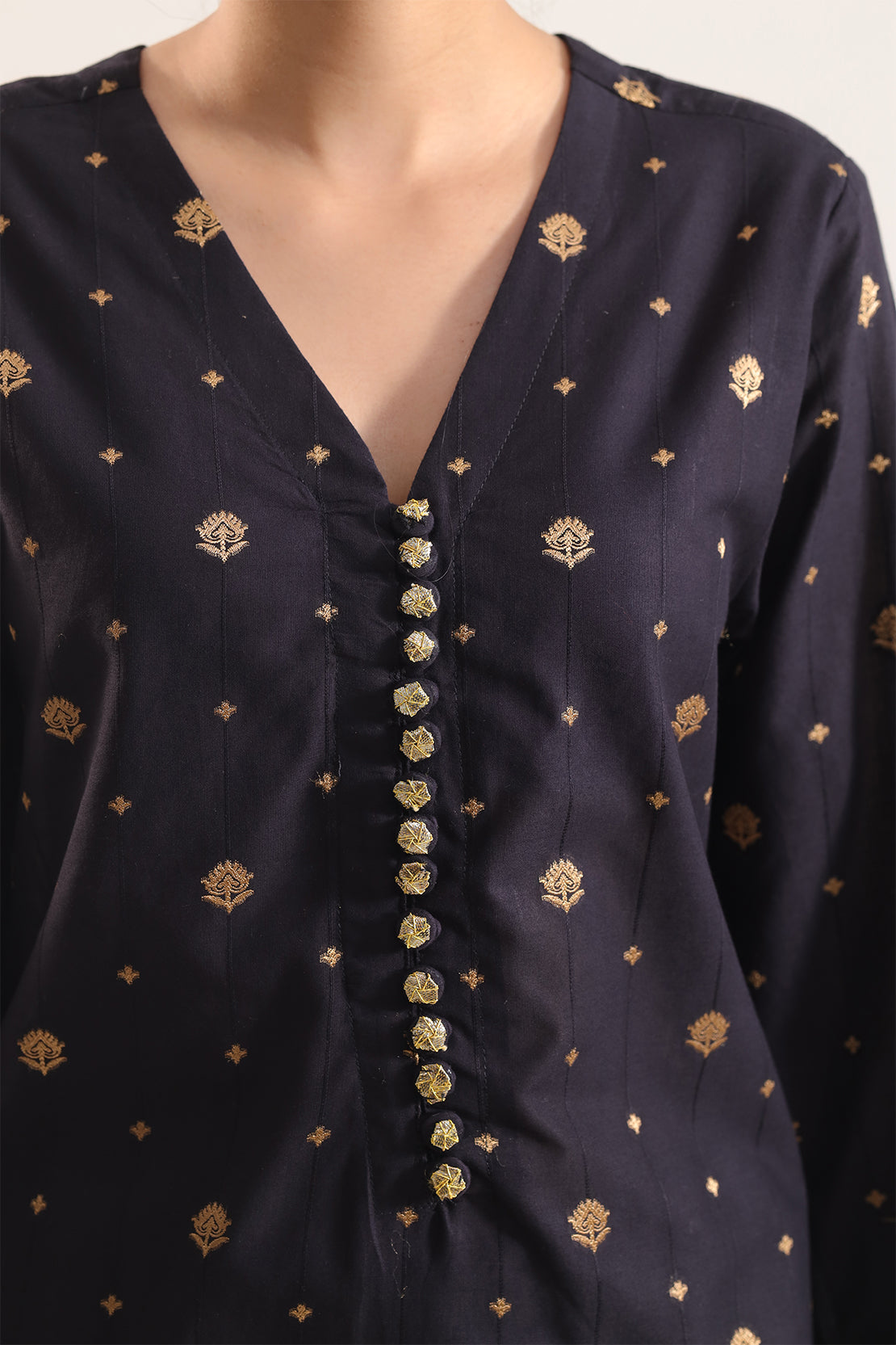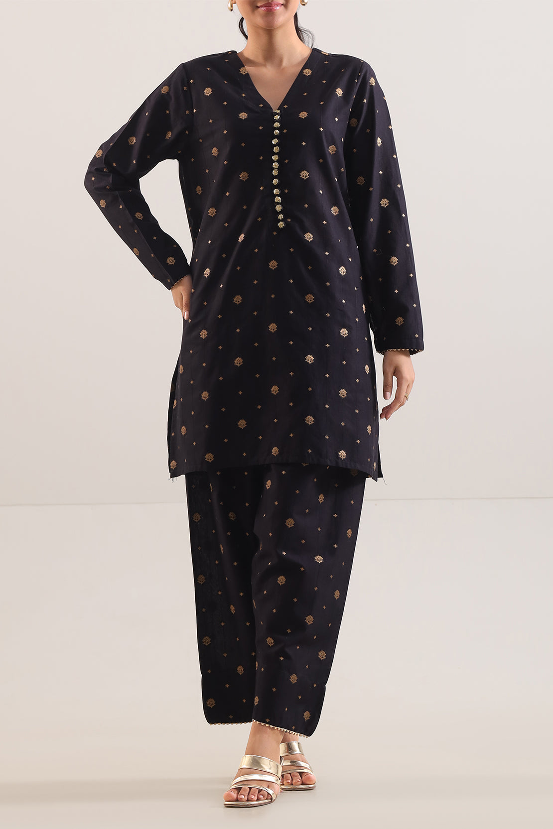 Cotton Jacquard Stitched Two-Piece Set By SAYA, Made From Rich, Textured Cotton Jacquard Fabric That Offers Both Style And Breathability. The Shirt Comes Ready-To-Wear In A Deep Black Hue With An Intricate Woven Pattern, Perfectly Paired With Coordinating Trousers For A Sophisticated, Matching Look. Designed For Semi-Formal Gatherings Or Polished Daywear, With Fine Stitching And A Polished Finish That Elevates Everyday Comfort. This Ensemble Blends Subtle Elegance, Durability, And Versatility—A True Wardrobe Staple.