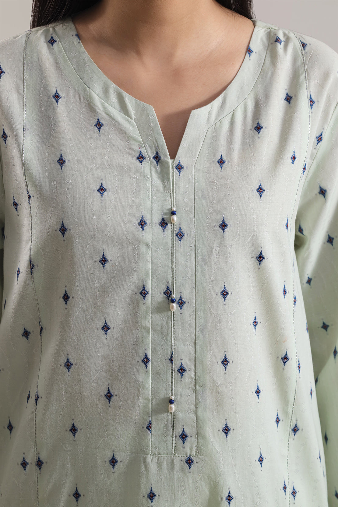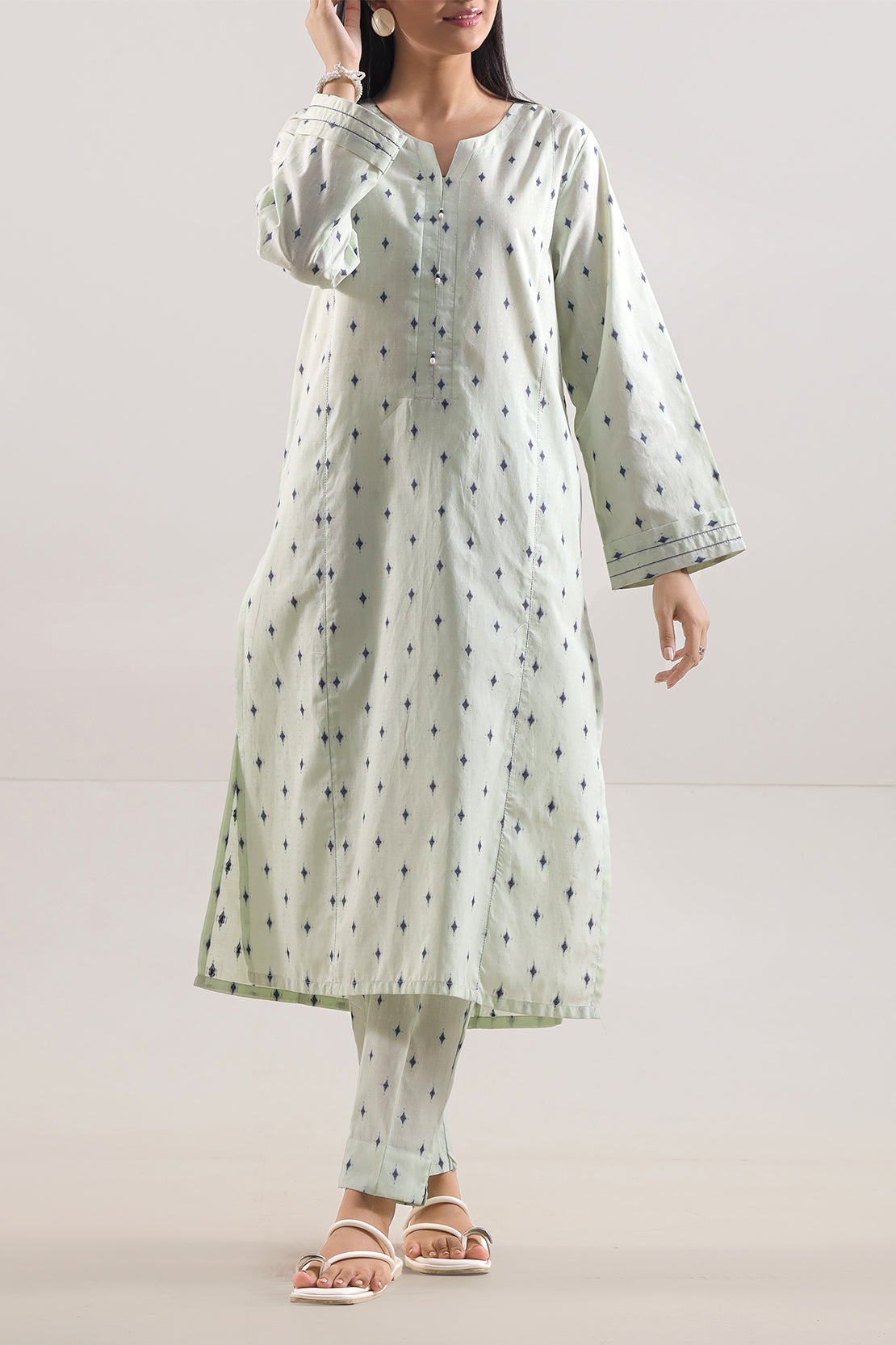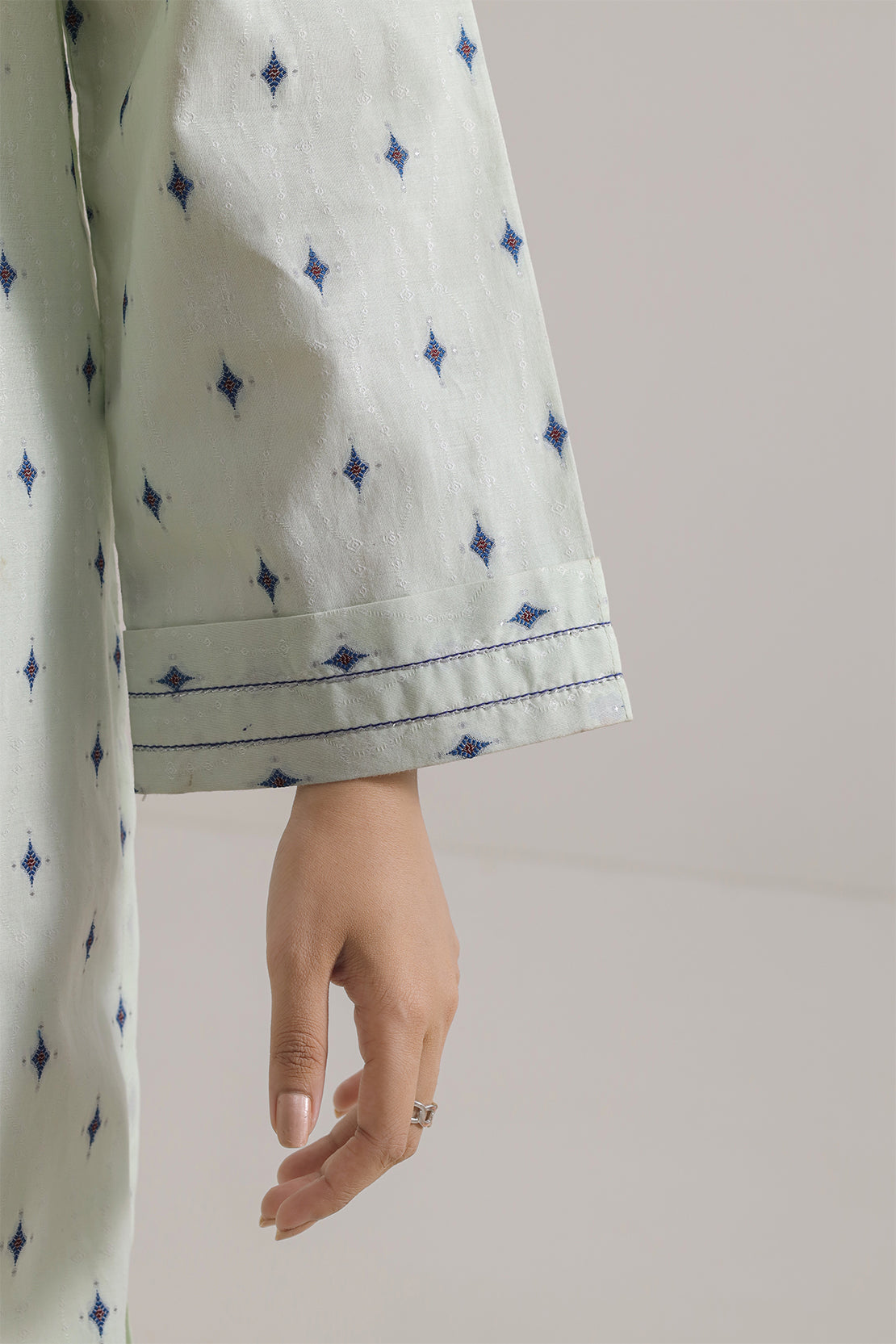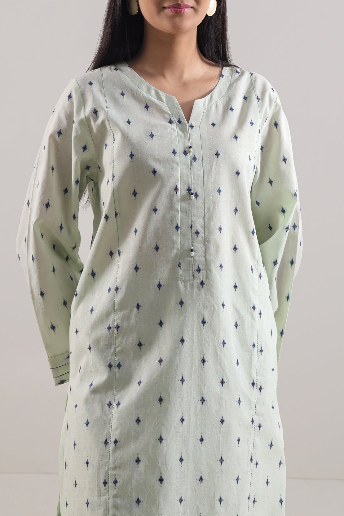Mint Green Cotton Jacquard Two-Piece From SAYA Includes A Ready-To-Wear Shirt And Trouser. Shirt Offers Elegant Texture With Jacquard Weave, While Trouser Is Cut For Comfort And Clean Style. Breathable Cotton Material Makes It Ideal For Semi-Formal Events, Daywear, Or Casual Evenings. Fresh Mint Hue Brings Calm Sophistication To Your Wardrobe.