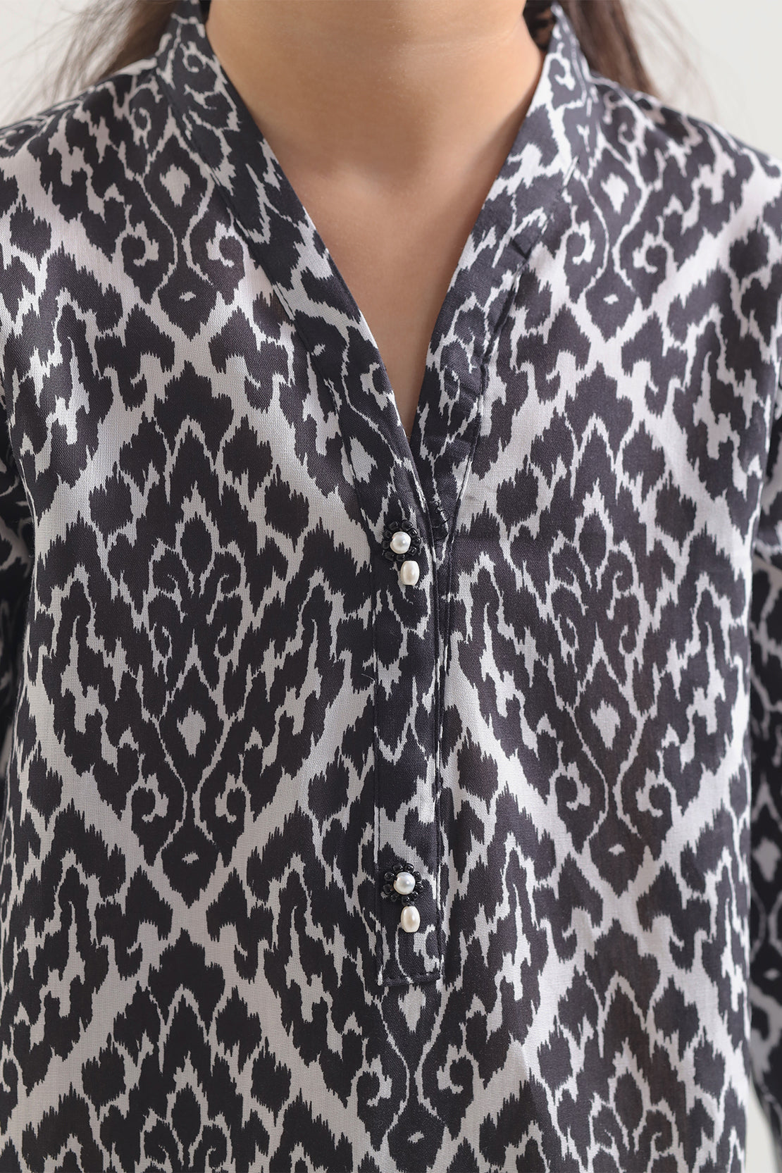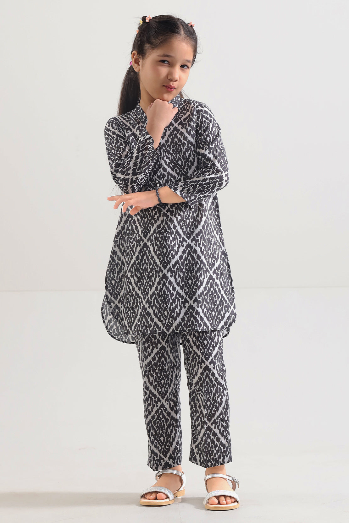 SAYA Printed Lawn Stitched Two-Piece Shirt And Trouser Set For Kids In Black Featuring Premium Lawn Fabric With Stylish Print Design Throughout Shirt And Trouser That Adds Chic Contrast. Ready-To-Wear Ensemble Delivers Clean Stitching And Polished Finishing For Comfortable Wear And Refined Appearance. Light And Breathable Material Offers Comfort During Playful Days, School Events Or Festive Occasions Where Stylish Simplicity Meets Practicality.