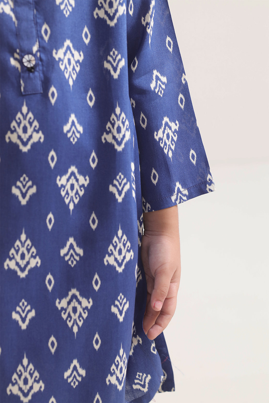 Playful Yet Polished, This SAYA Printed Silk-Touch Stitched Shirt & Trouser Set For Kids In Serene Blue Offers A Sweet Blend Of Comfort And Style. The Silk-Touch Fabric Feels Sumptuously Smooth Against The Skin, Creating A Soft Drape That Moves With Ease. A Delicate Print Pattern Adds Cheerful Personality Without Overpowering The Design. Meticulous Stitching And Clean Seams Ensure Durability And A Neat Finish For Active Days. Ideal For Family Occasions, Celebrations, Or Smart Casual Days, This Two-Piece Lets Young Ones Shine With Breathable Ease And Refined Charm.