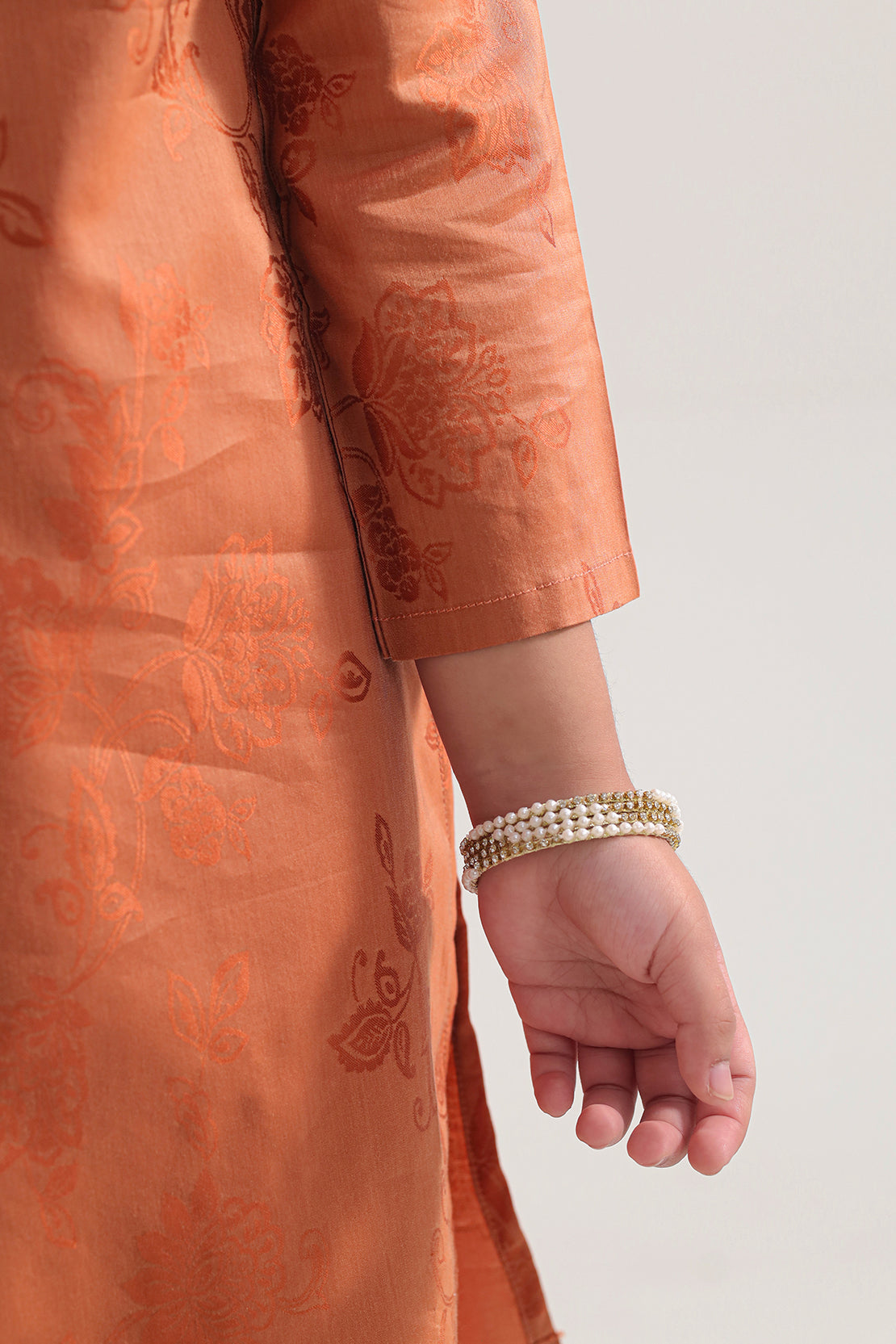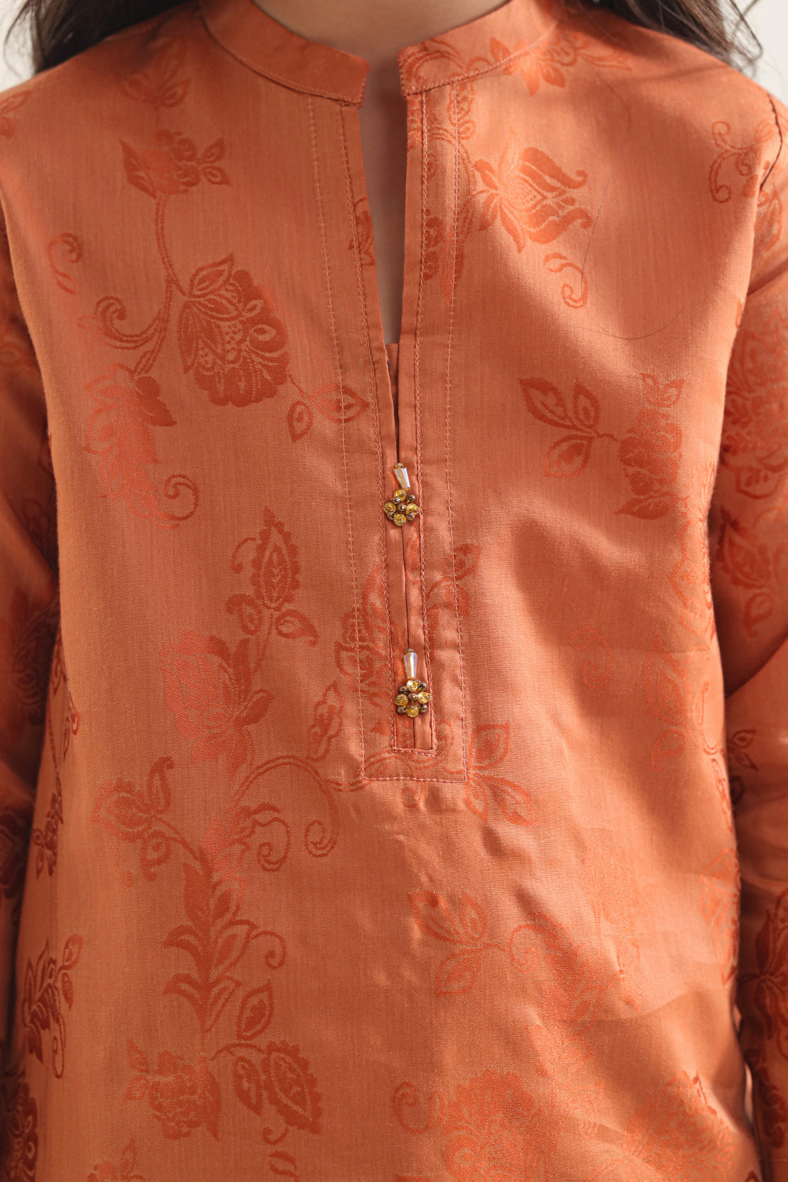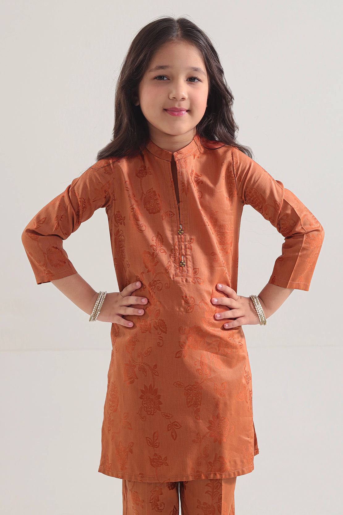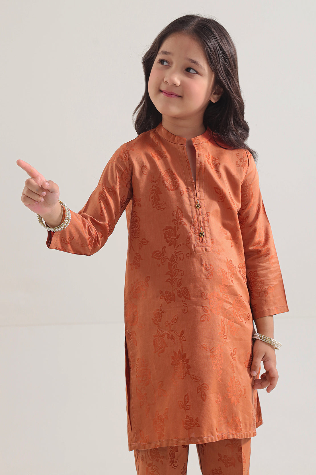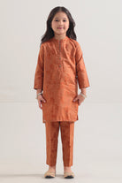 SAYA Stitched Cotton Jacquard Shirt And Trouser For Kids In Rust Featuring Premium Jacquard Fabric With Rich Texture And Elegant Weave. Shirt And Trouser Offer Clean Stitching And Polished Finishing That Elevate Everyday Wear With Stylish Appeal. Breathable Cotton Ensures Comfort During Playful Days, Family Outings Or Festive Moments Where Practicality Meets Refined Style.