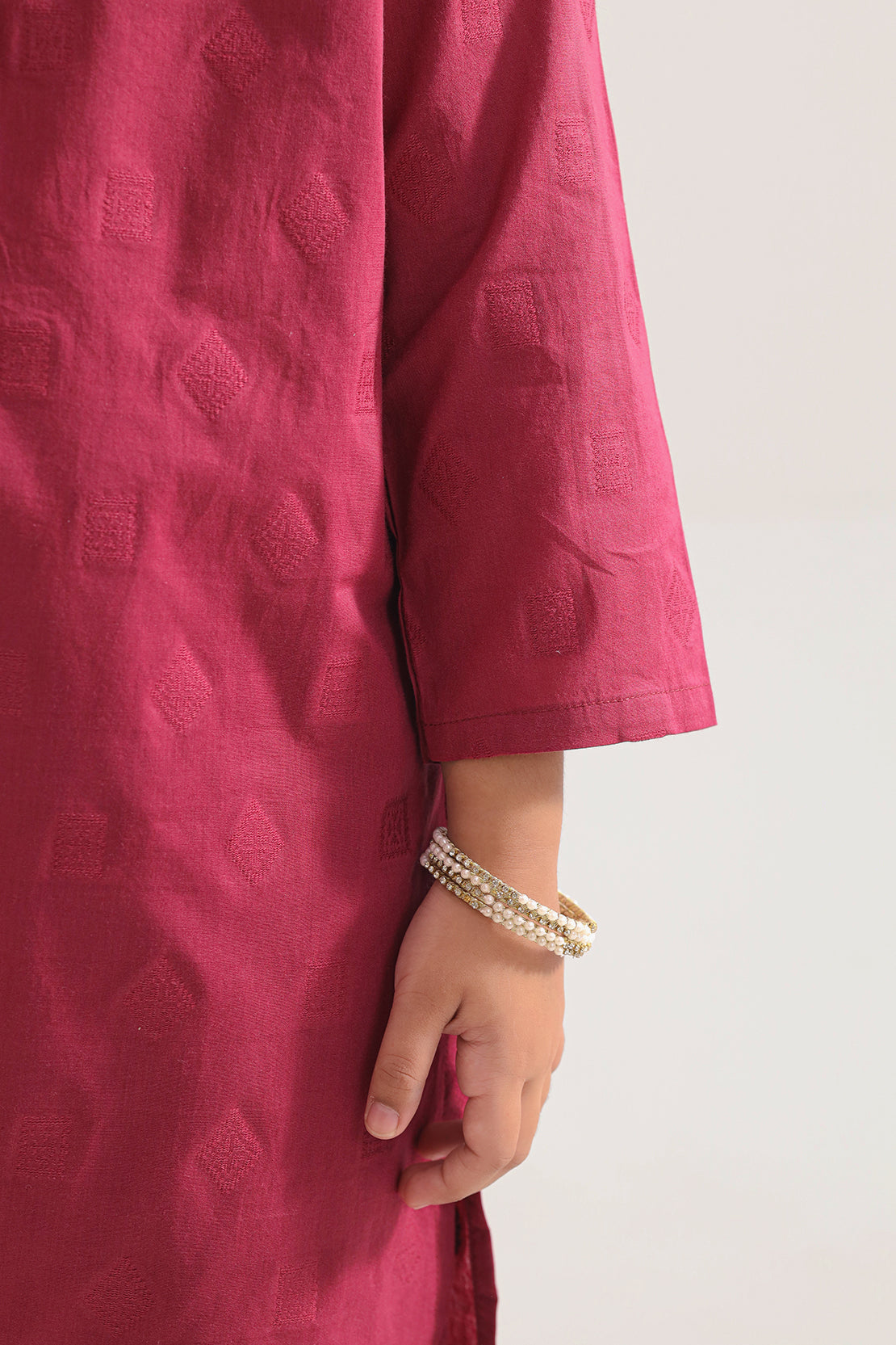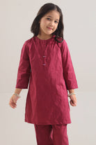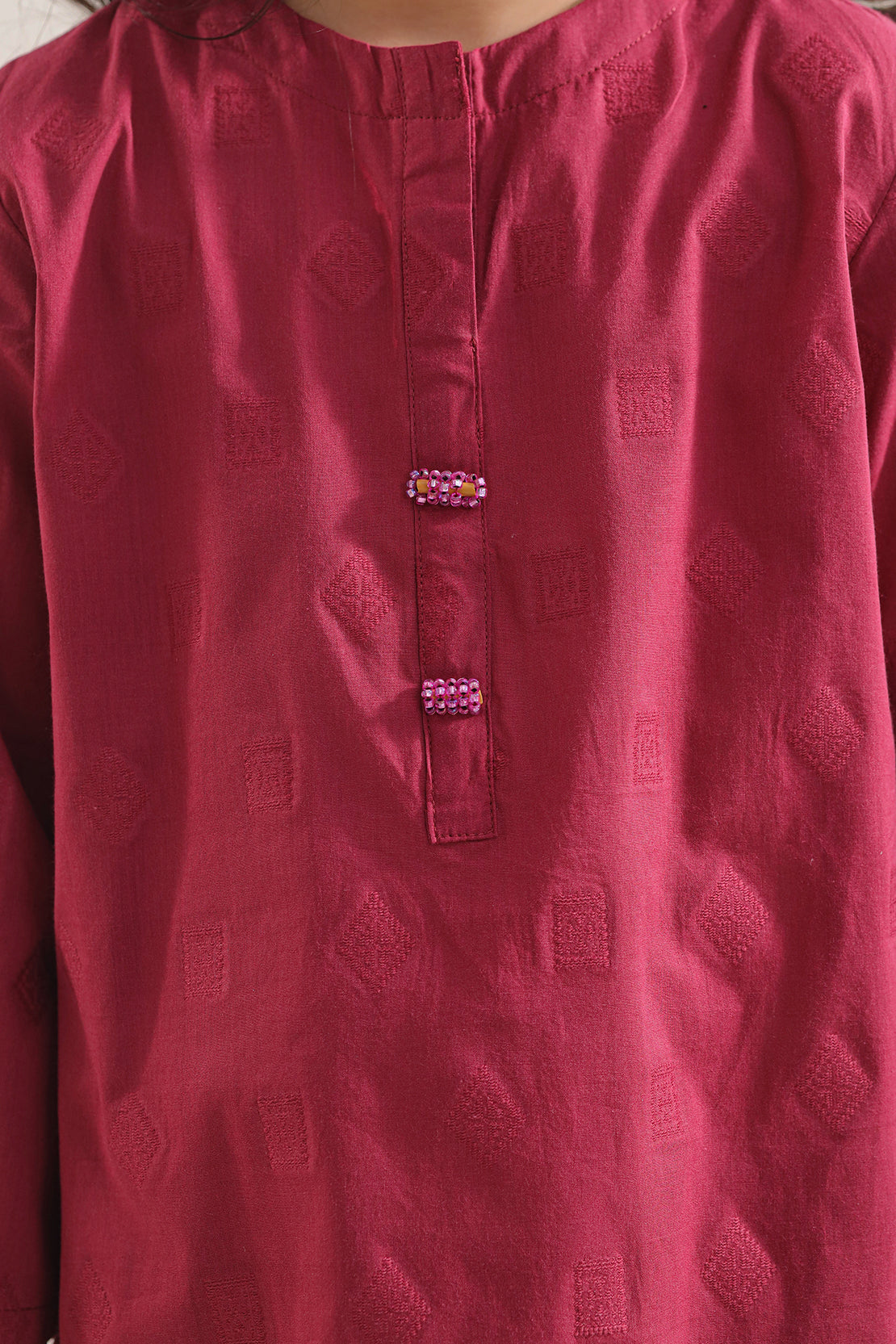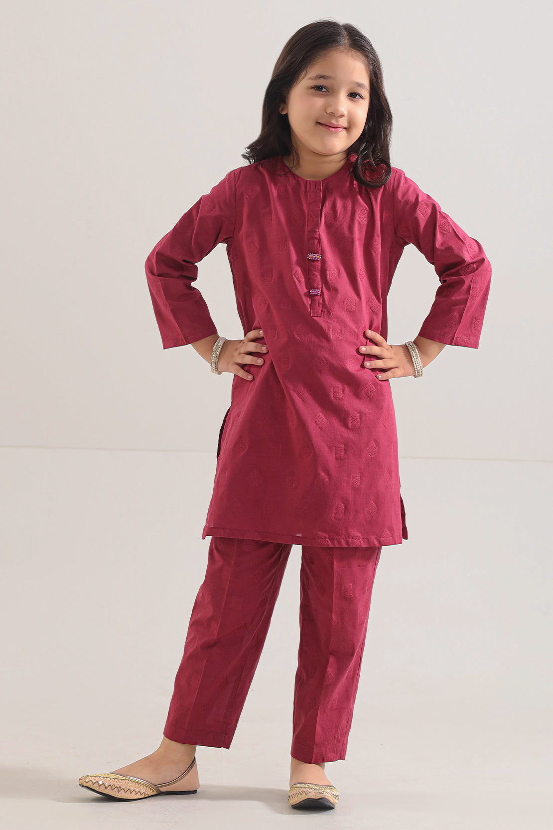 SAYA Stitched Cotton Jacquard Two-Piece Shirt And Trouser For Kids In Maroon With Premium Jacquard Fabric Offering Rich Texture And Refined Weave. Shirt And Trouser Deliver Elegance With Clean Stitching And Polished Finishing That Elevates Everyday Outfits. Breathable Cotton Ensures Comfort During Active Play, Family Outings Or Festive Moments Where Stylish Appeal Meets Practical Wear.
