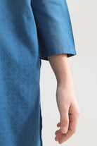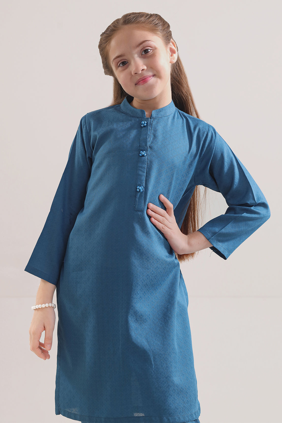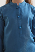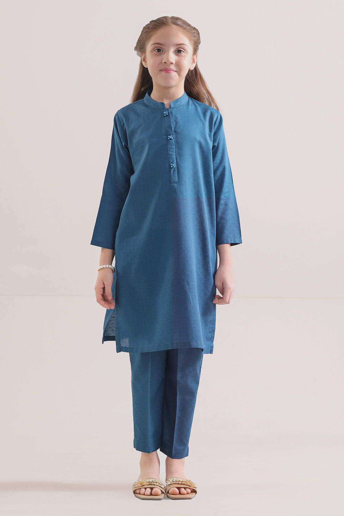 SAYA Stitched Lawn Jacquard Shirt And Trouser Set For Kids In Teal Featuring Premium Lawn Jacquard Weave That Offers Soft Texture And Breathable Comfort. Shirt With Subtle Pattern Adds A Touch Of Elegant Style; Coordinated Trouser Complements With Clean Stitching And Comfortable Silhouette. Ready-To-Wear Ensemble Perfect For School Days, Family Outings Or Festive Occasions Where Practicality Meets Youthful Charm.