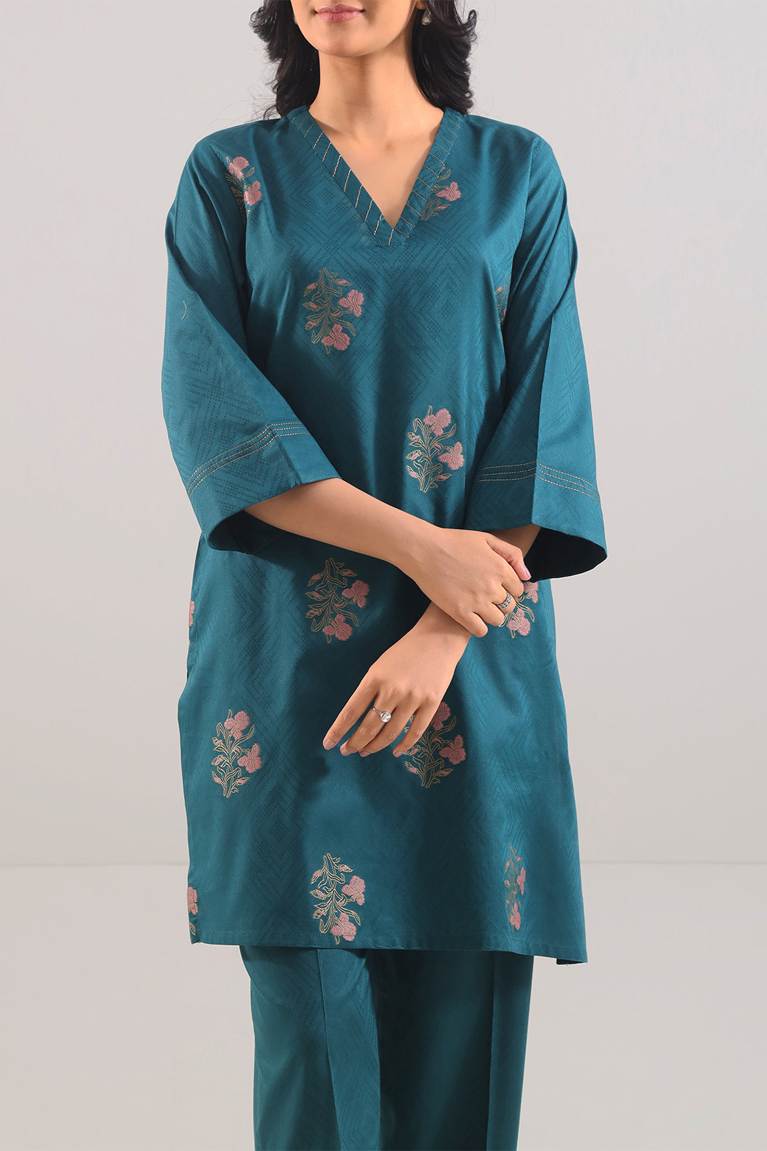 Redefine Grace With This Elegant Two-Piece By SAYA, Crafted In Premium Cotton Jacquard Fabric. The Shirt Features A Subtle Textured Pattern, Radiating Sophistication And Comfort. The Matching Trouser Completes The Look With Seamless Stitching And A Polished Finish. Ideal For Both Formal And Semi-Casual Occasions, This Ensemble Blends Quality, Comfort, And Timeless Style With Effortless Refinement.