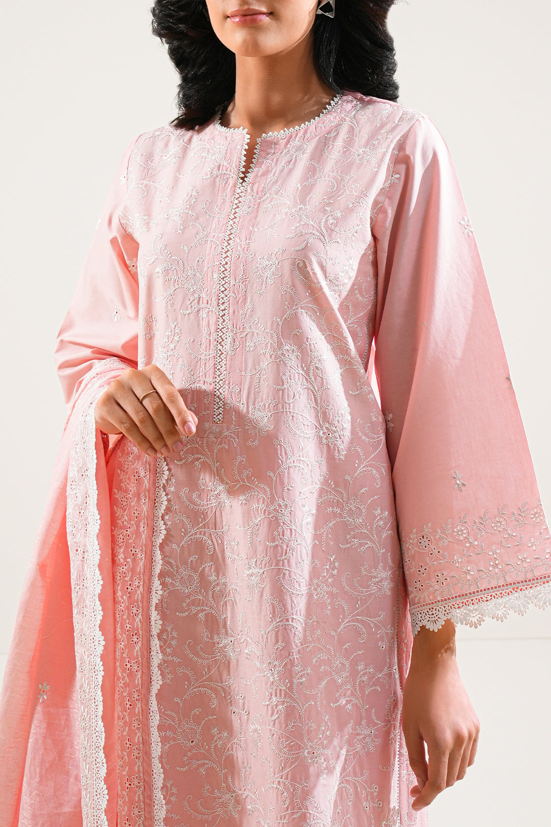 Crafted From Cambric Fabric, This 3-Piece Suit By SAYA Offers A Light, Crisp Texture That Feels Soft Against The Skin And Breathes Well — Making It Perfect For Warm Weather Or Daily Wear. The Embroidered Shirt Adds Refined Detailing Without Overpowering The Clean Silhouette, Offering A Touch Of Elegance That Elevates The Suit Beyond Everyday Basics. The Coordinated Trousers And Matching Dupatta Round Off The Ensemble, Delivering A Balanced, Polished Look — Suitable For Casual Outings, Office Wear, Or Semi-Formal Gatherings.