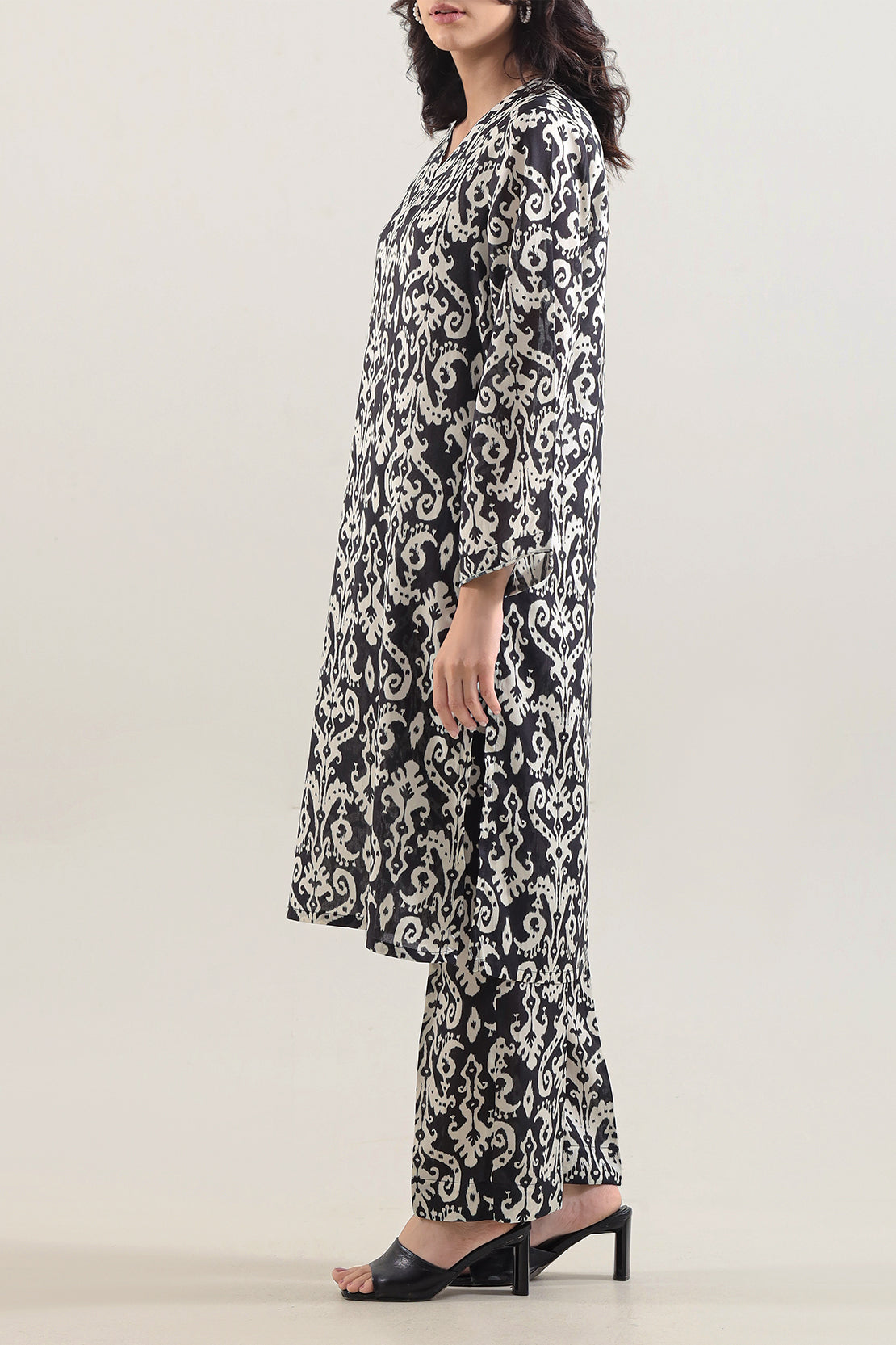 Step Into Refined Daywear With This Elegant Ready To Wear Set From SAYA, Crafted In Arabic Lawn Fabric That Offers Breathability And Ease. The Shirt Features A Sophisticated Arabic Inspired Print Across A Light Neutral Base, Finished With Clean Tailoring And Neat Hemlines. Paired With A Tailored Trouser In A Coordinated Tone, The Ensemble Delivers Polished Comfort Ideal For Everyday Elegance, Casual Meetings Or Festive Gatherings.