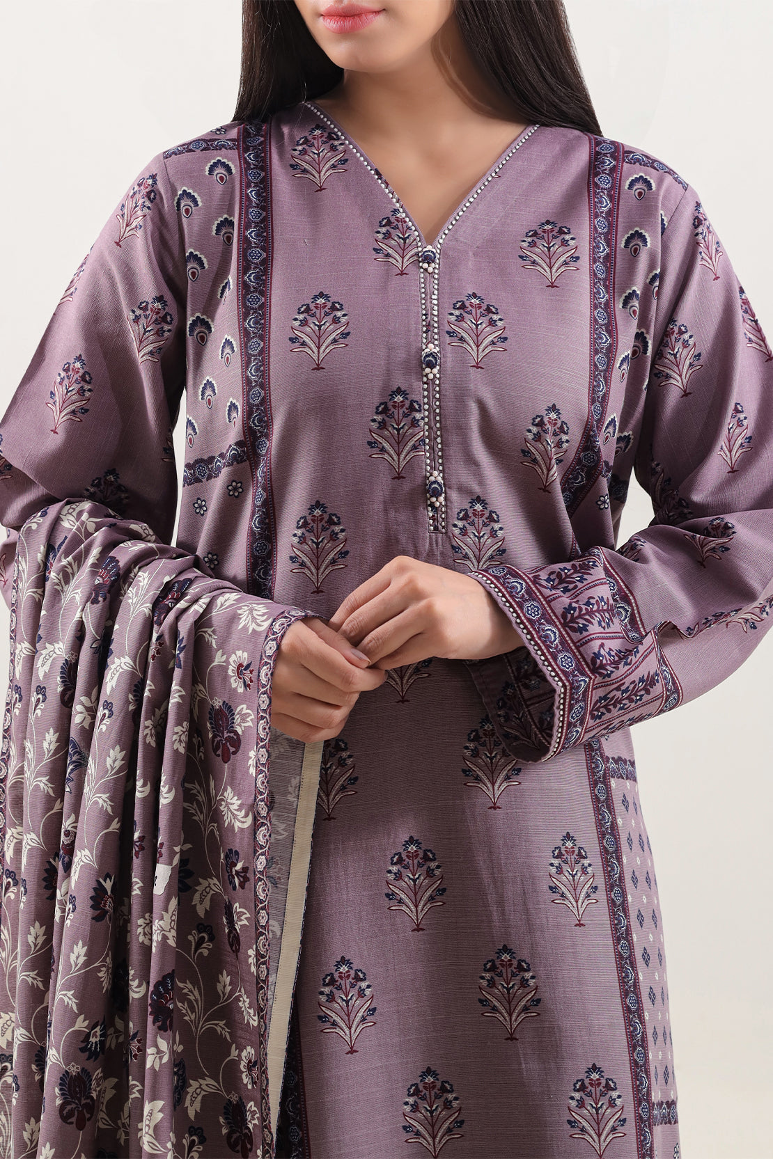 SAYA's Printed Khaddar Stitched Three-Piece Set Features A Contemporary All-Over Design On Textured, Breathable Fabric. Expertly Tailored For A Ready-To-Wear Fit, This Coordinated Ensemble Includes A Shirt, Trouser, And Dupatta. Perfect For Autumn And Winter Gatherings, Cultural Events, And Casual Outings, It Delivers A Unique Blend Of Rustic Charm, Substantial Comfort, And Modern Style.