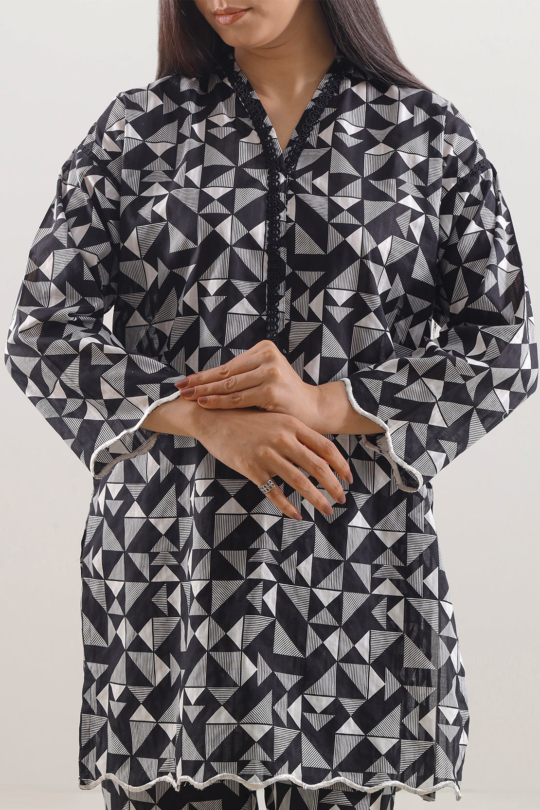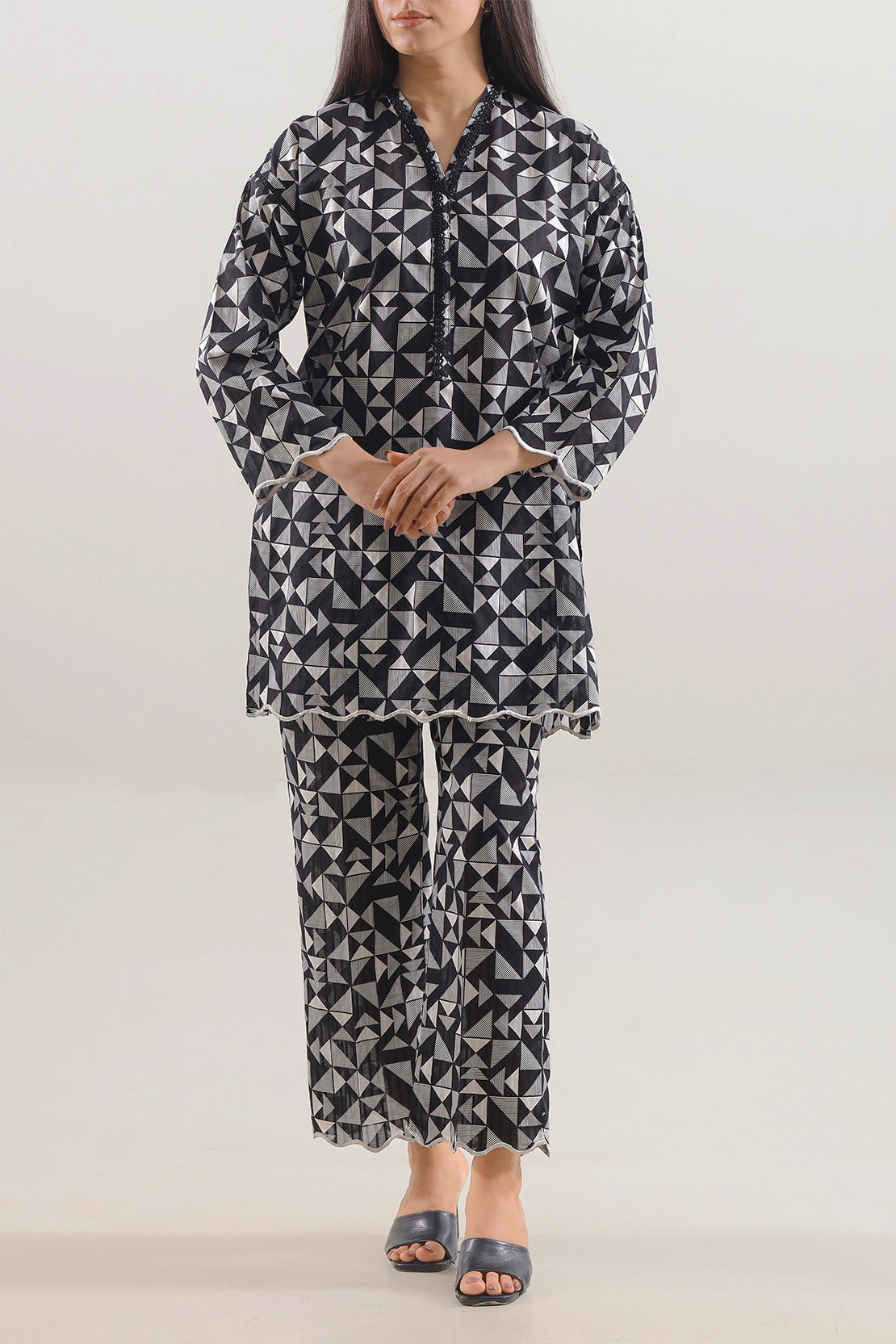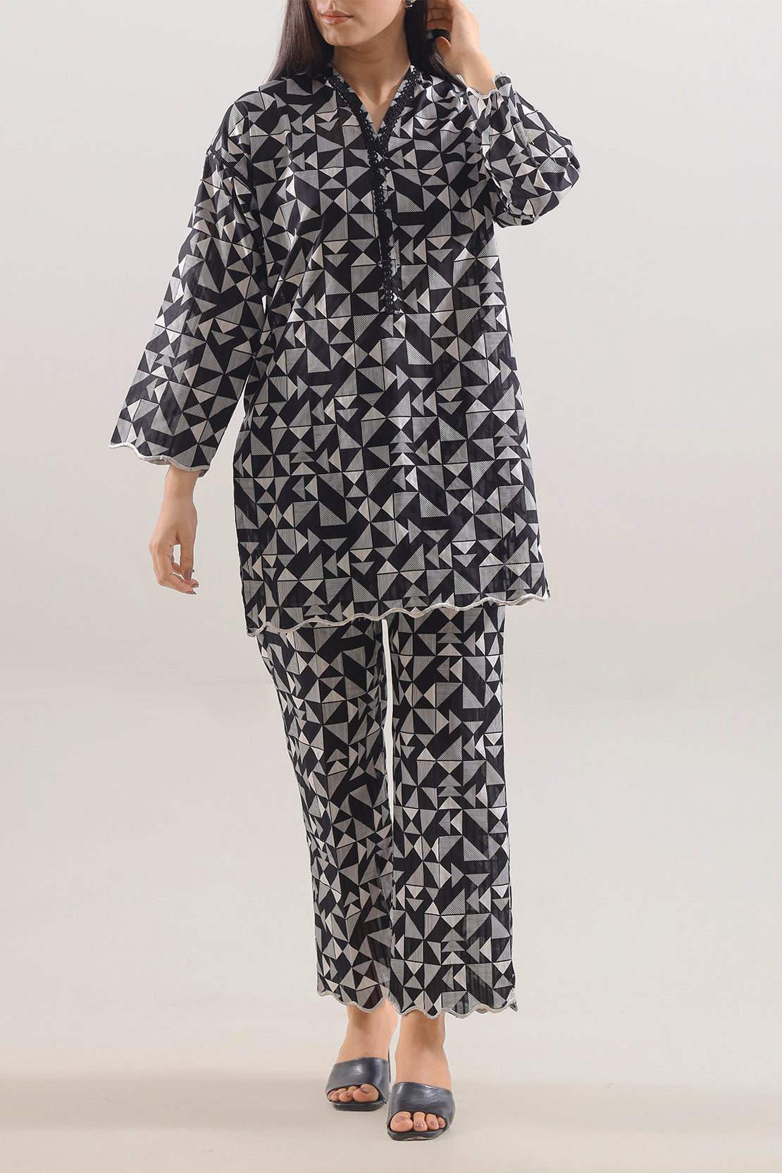 Elevate Your Daytime Look With The SAYA Printed Lawn 2-Piece Set, Skillfully Crafted In Ultra-Soft Lawn Fabric That Breathes Easily And Drifts With Grace. The Shirt Boasts A Subtle Print In Muted Tones, Accentuated By Neat Stitching And Crisp Seams For A Polished Silhouette. The Matching Trouser Is Tailored In A Straight Cut To Offer Fluid Movement Without Sacrificing Shape. Ideal For Casual Gatherings, Garden Parties, Or Warm Weather Festivities, This Ensemble Harmonizes Fabric Quality, Design Details, Print Appeal, And Practical Style Effortlessly.