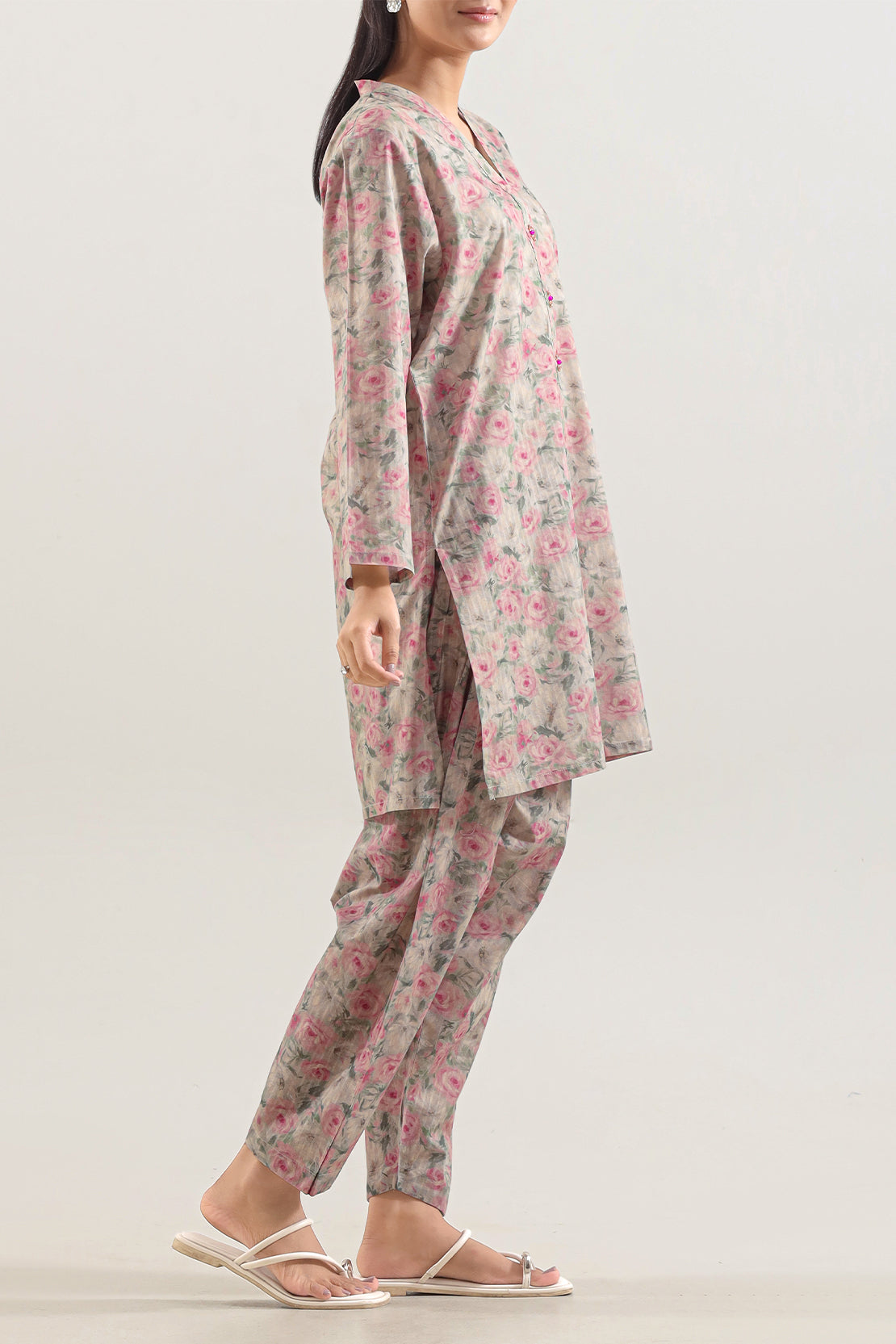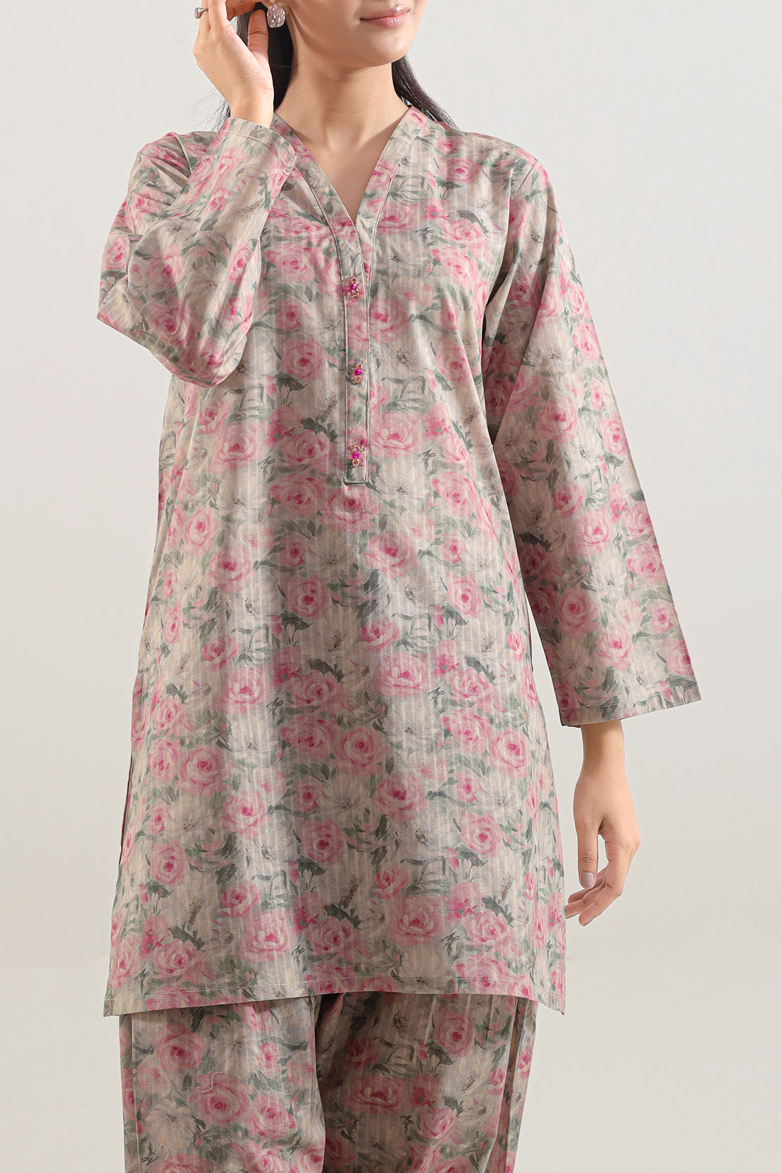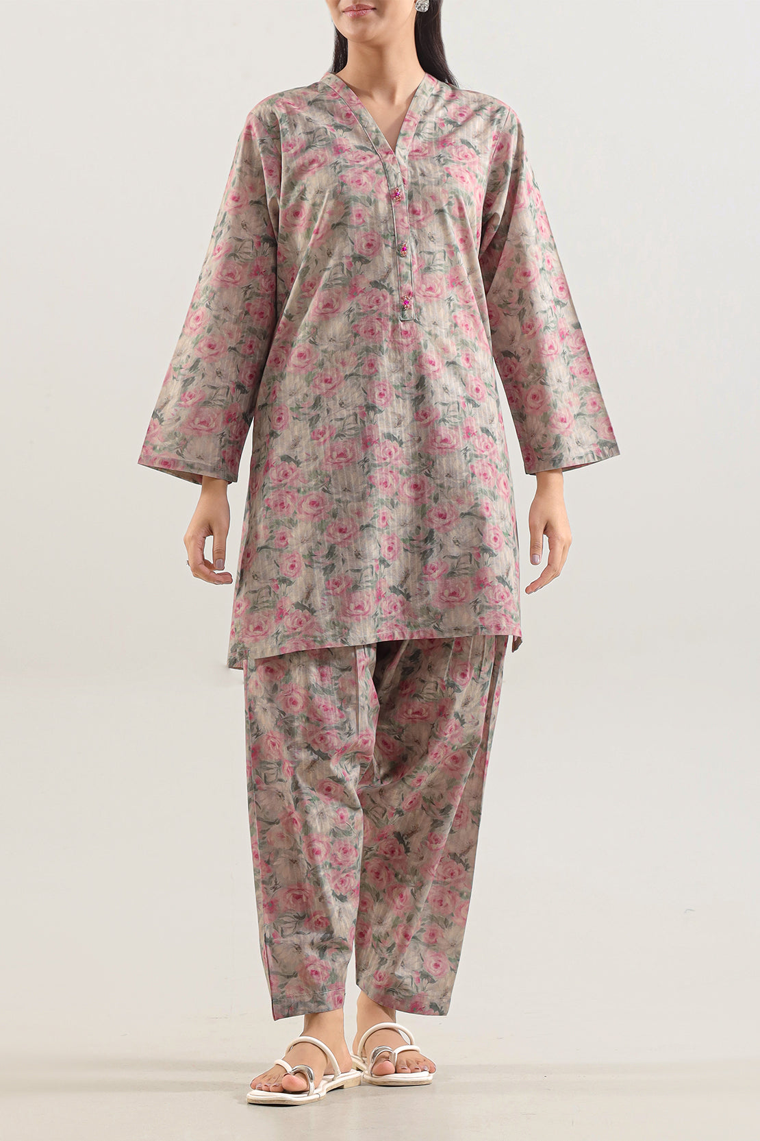 Embrace Understated Elegance With The SAYA Printed Self-Strip Lawn Stitched Two-Piece Set. Meticulously Tailored From Premium Lawn Fabric, Prized For Its Delicate Texture And Breathable Comfort, This Ensemble Delivers Effortless Grace For Any Daytime Affair. It Features A Subtle Self-Strip Print, Weaving A Sophisticated Pattern That Offers Visual Interest While Maintaining A Refined, Versatile Aesthetic. Designed For A Flawless, Ready-To-Wear Fit, This Coordinated Shirt And Trouser Set Is An Ideal Choice For Luncheons, Garden Parties, And Casual Gatherings, Seamlessly Blowing Timeless Style With Modern Comfort.