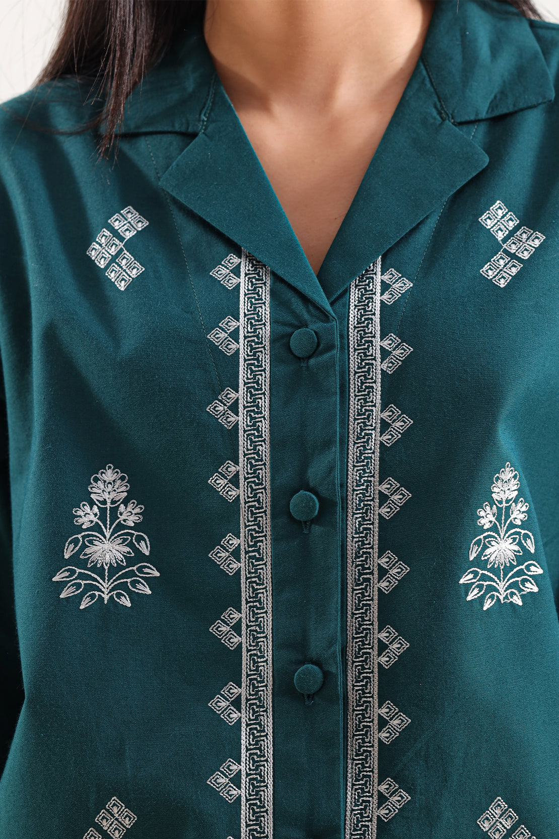 SAYA Solid Embroidered Poplin Stitched 2-Piece Shirt & Trouser Is Crafted From Smooth, Lightweight Poplin Fabric — Known For Its Crisp Weave, Soft Hand Feel And Breathable Comfort. The Shirt Features Subtle Tone-On-Tone Embroidery That Enhances The Solid Base Without Overpowering It, While The Matching Trouser Offers A Clean Silhouette And Easy Wear. This Ensemble Is Ideal For Semi-Formal Occasions, Office Wear Or Elegant Everyday Style.