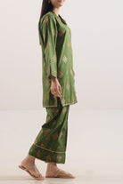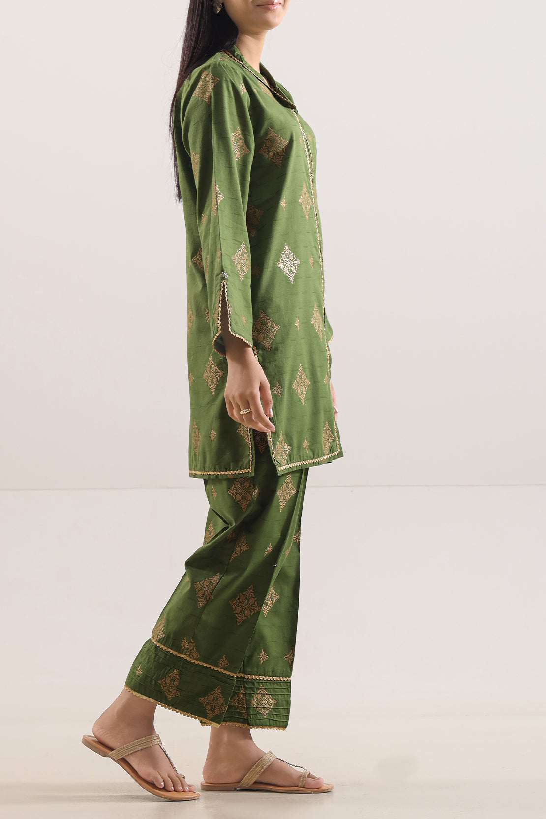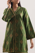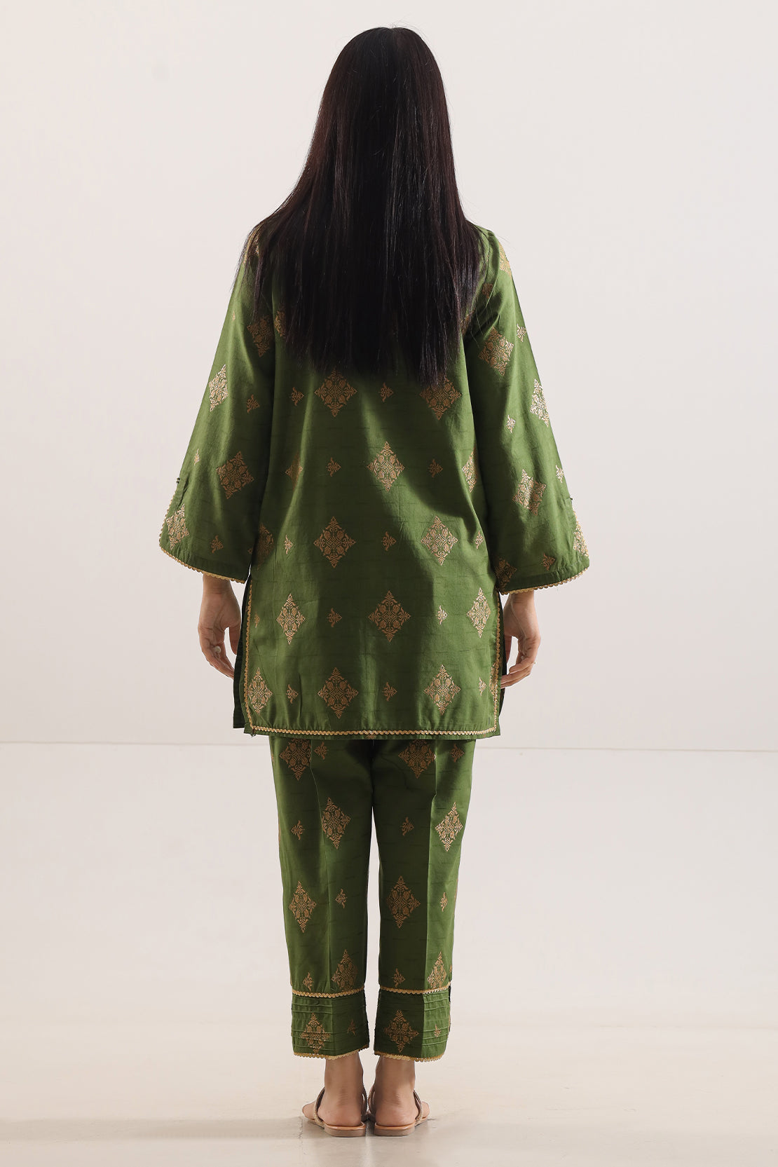 Elevate Your Ready-To-Wear Ensemble With This Exquisitely Crafted Cotton Jacquard 2-Piece From SAYA. Featured In Elegant Moss Green, The Premium Cotton Jacquard Fabric Offers A Subtle Woven Texture That Seamlessly Blends Breathable Comfort With Refined Structure. The Coordinated Ready-To-Wear Shirt And Trouser Deliver Effortless Elegance And Harmonious Styling—Perfect For Polished Daywear Or Understated Semi-Formal Moments.