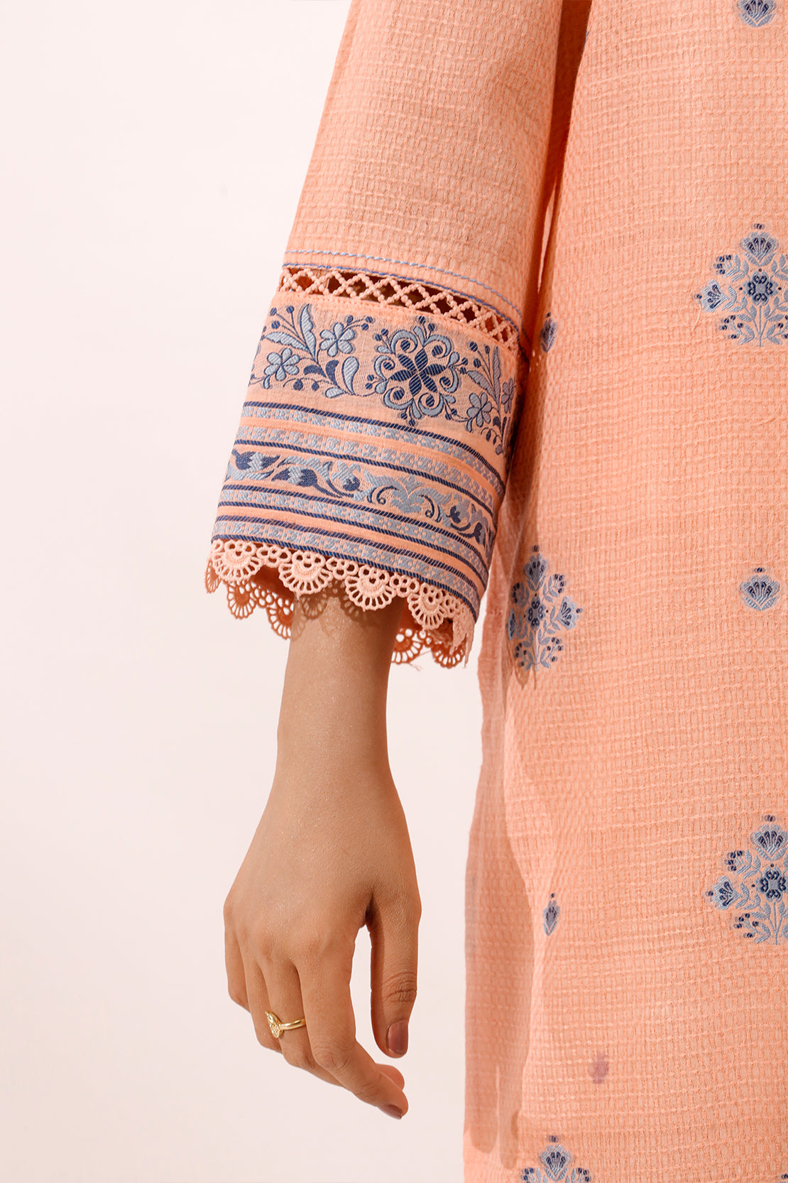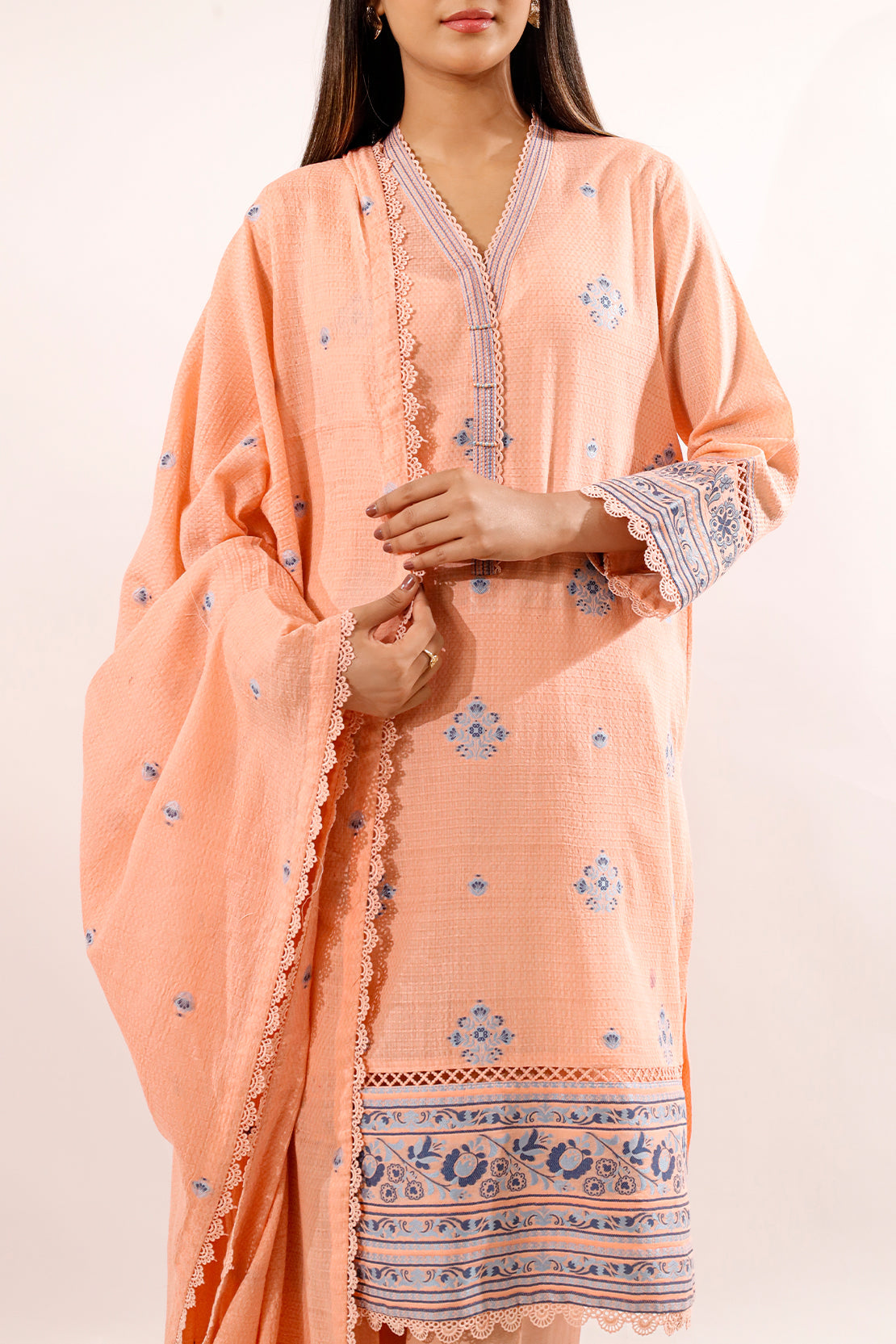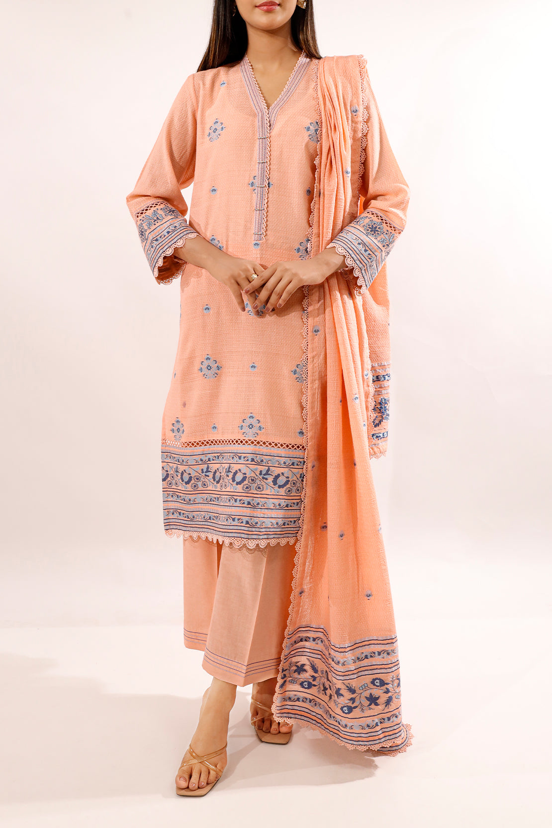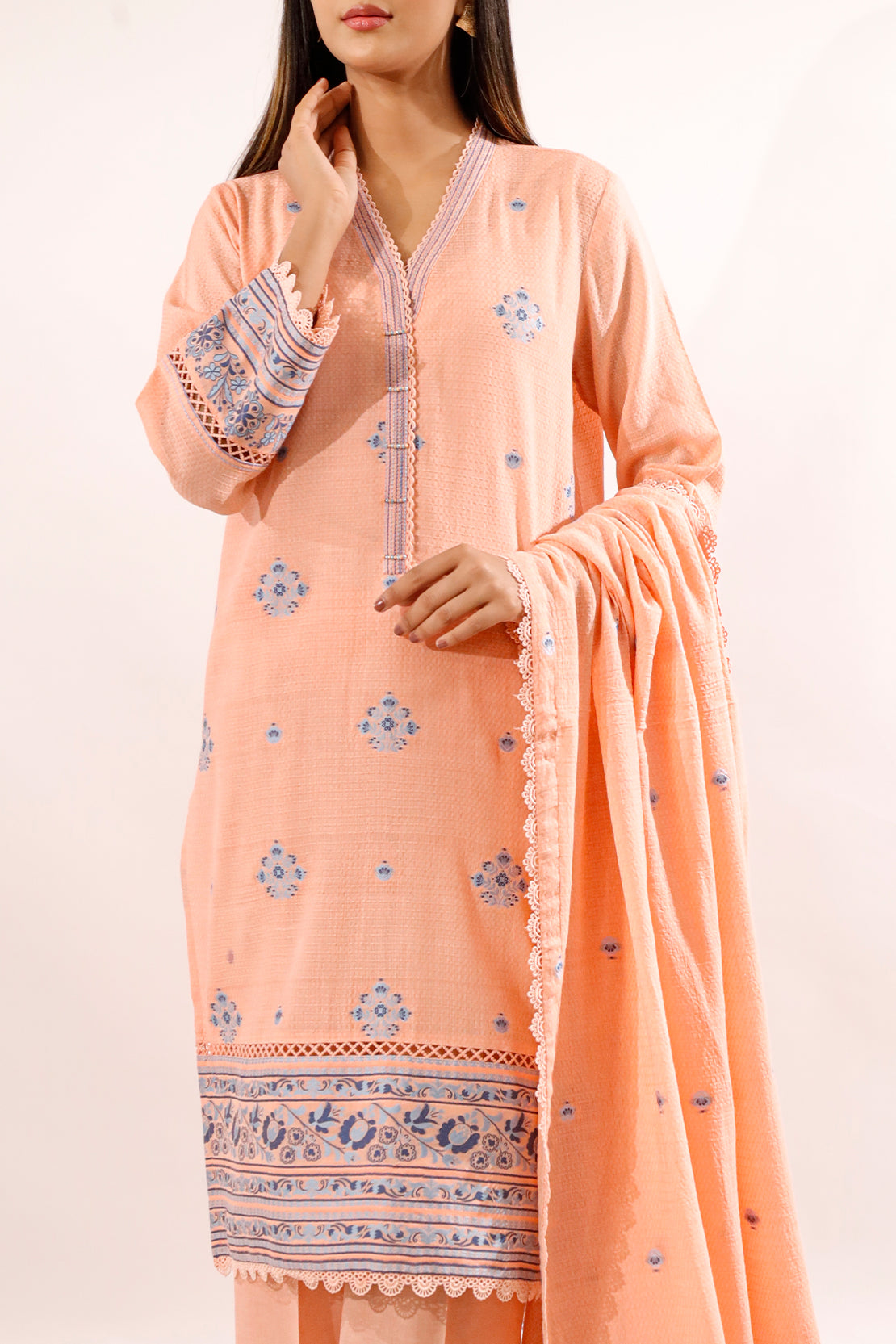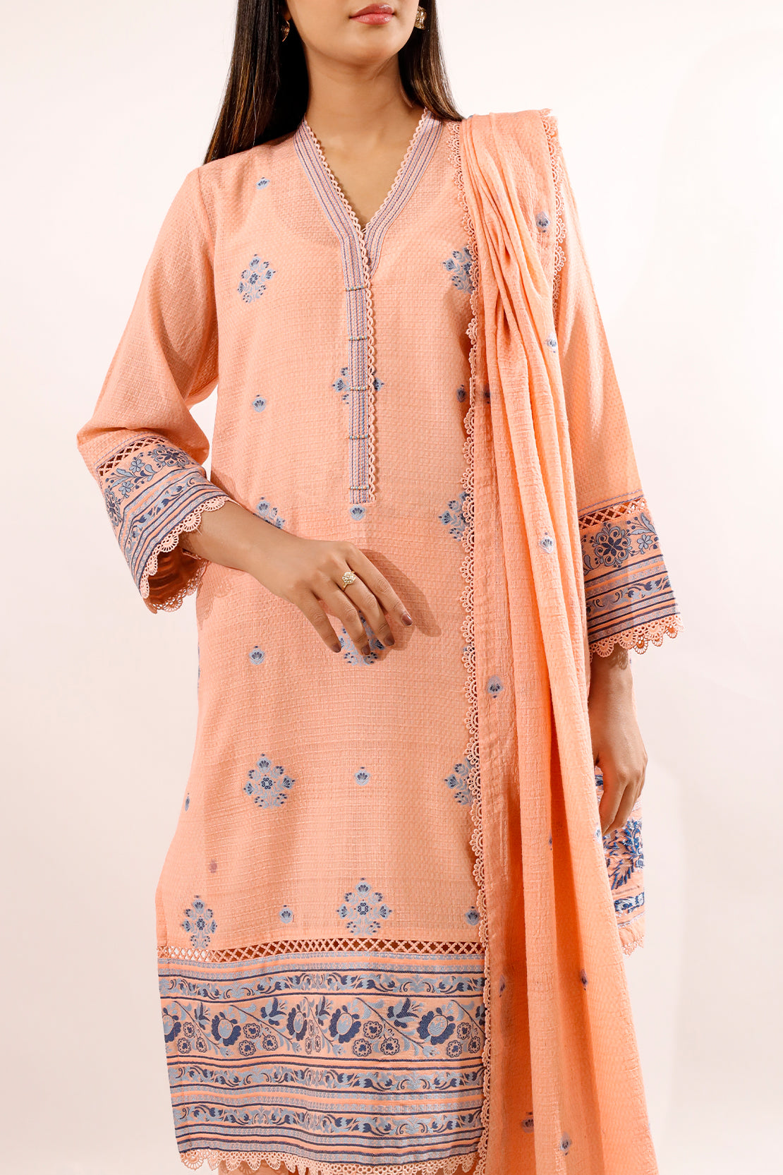Unstitched Jacquard Cotton 3-Piece By SAYA Arrives In A Refined Peach Hue. The textured cotton jacquard fabric brings this set an elegant weave with subtle depth, while still remaining breathable and comfortable. This ensemble includes ample shirt panels ready for bespoke tailoring, a matching trouser piece, and a coordinating dupatta to complete the the look. Ideal for festive evenings, semi-formal events, or tailored daywear, it combines sophistication with customization freedom.