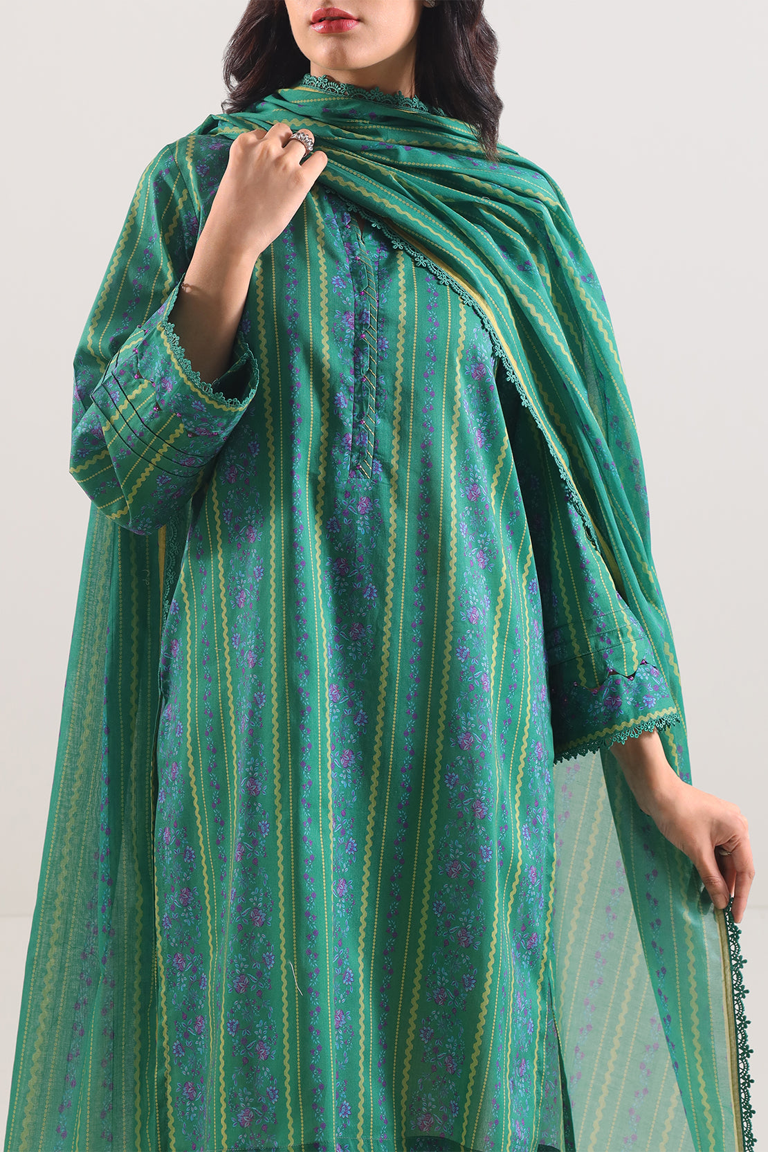 Elevate Your Summer Wardrobe With This Elegant Green Unstitched Printed Lawn 3-Piece By SAYA. Crafted From Soft, Breathable Lawn Fabric, It Comes With A Generous Printed Shirt Panel Measured For Tailoring Precision, A Flowing Printed Lawn Dupatta That Adds Movement, and A Dyed Cambric Trouser Piece for Structure and Comfort. This Set Is Tailoring-Ready and Perfect for Creating Casual Daywear, Refined Festive Attire, or Personalized Summer Ensembles That Blend Comfort With Timeless Style.
