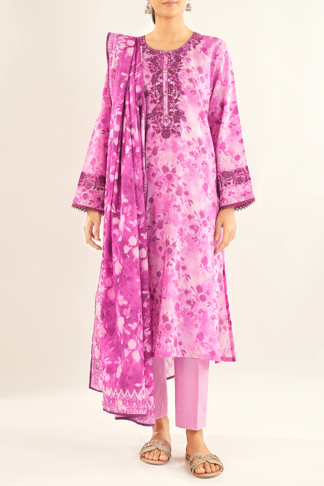Introducing Saya's Printed Embroidered Lawn Stitched Shirt, a perfect blend of style and comfort. This ready-to-wear shirt is crafted from premium lawn fabric, featuring intricate embroidery that adds a touch of elegance to your wardrobe. The breathable material ensures comfort, making it ideal for both casual and semi-formal occasions.