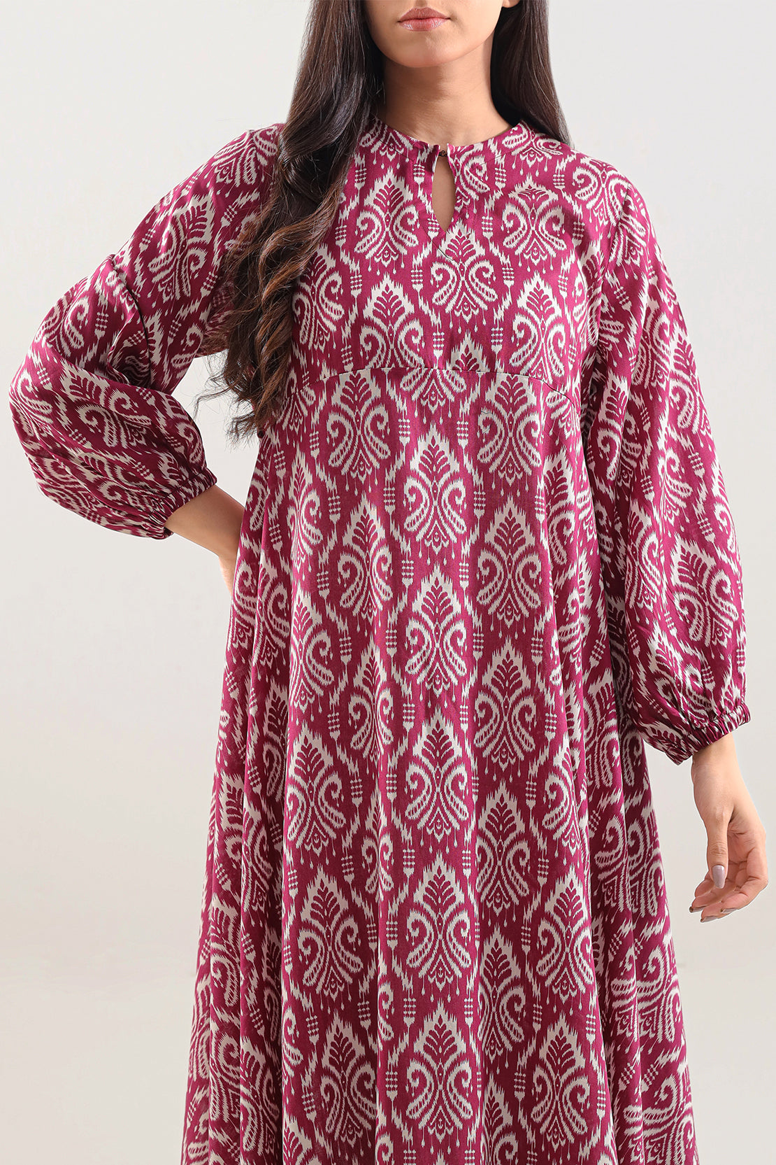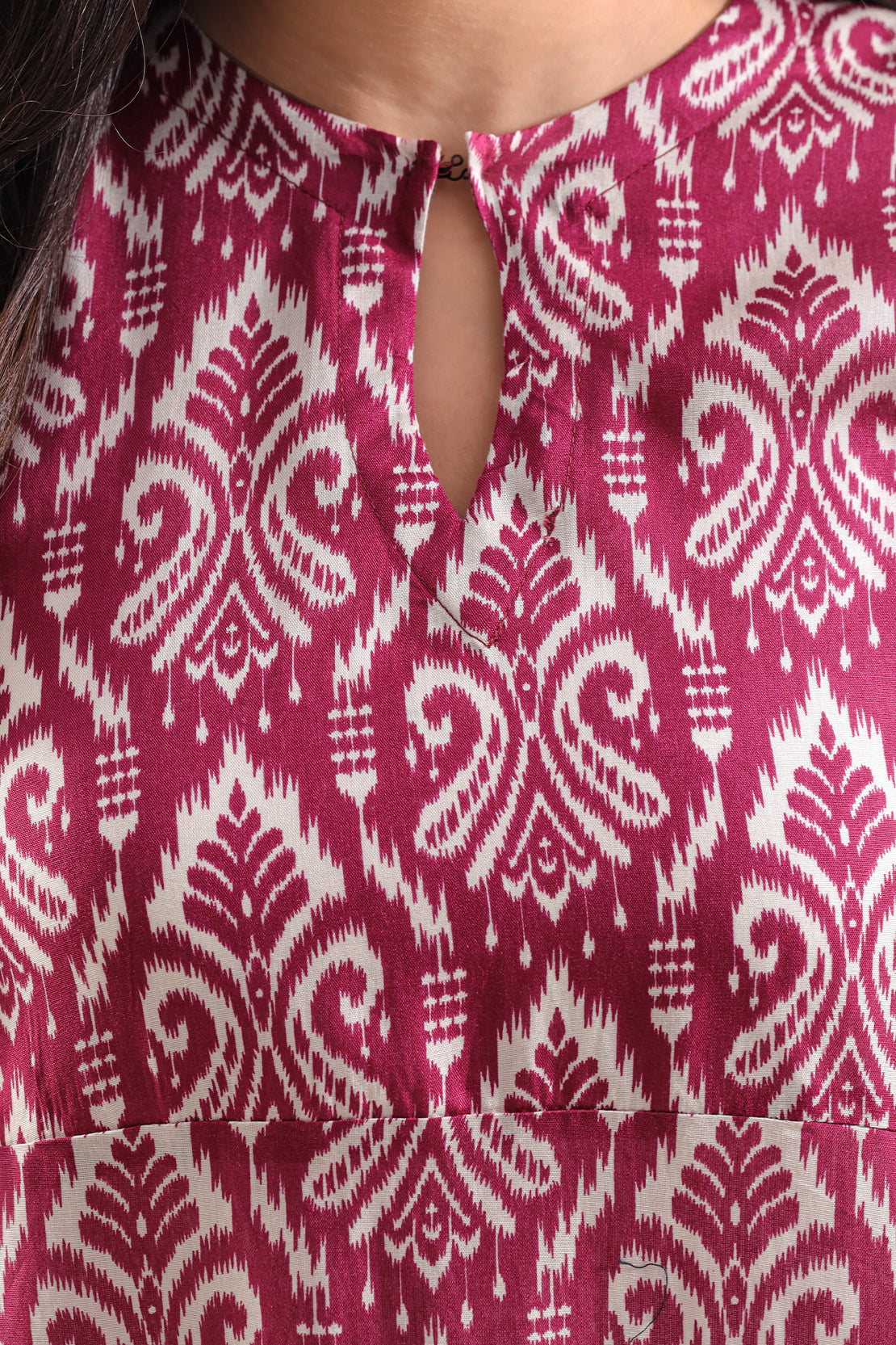 Graceful And Contemporary, This SAYA Printed Silk-Touch Stitched Dress In Deep Maroon Radiates Modern Elegance. The Silk-Touch Fabric Offers A Naturally Soft, Breathable Feel With A Luxurious Silky Sheen. Its Lightweight Drape Moves Gracefully While Maintaining Exceptional Comfort. The Printed Motifs Enhance The Rich Maroon Base, Adding Depth And Subtle Charm Without Overpowering. With Immaculate Stitching And A Polished Finish, This Dress Is Ideal For Festive Gatherings, Evening Soirées, Or Refined Day Events — A Perfect Balance Of Style, Comfort, And Sophistication.