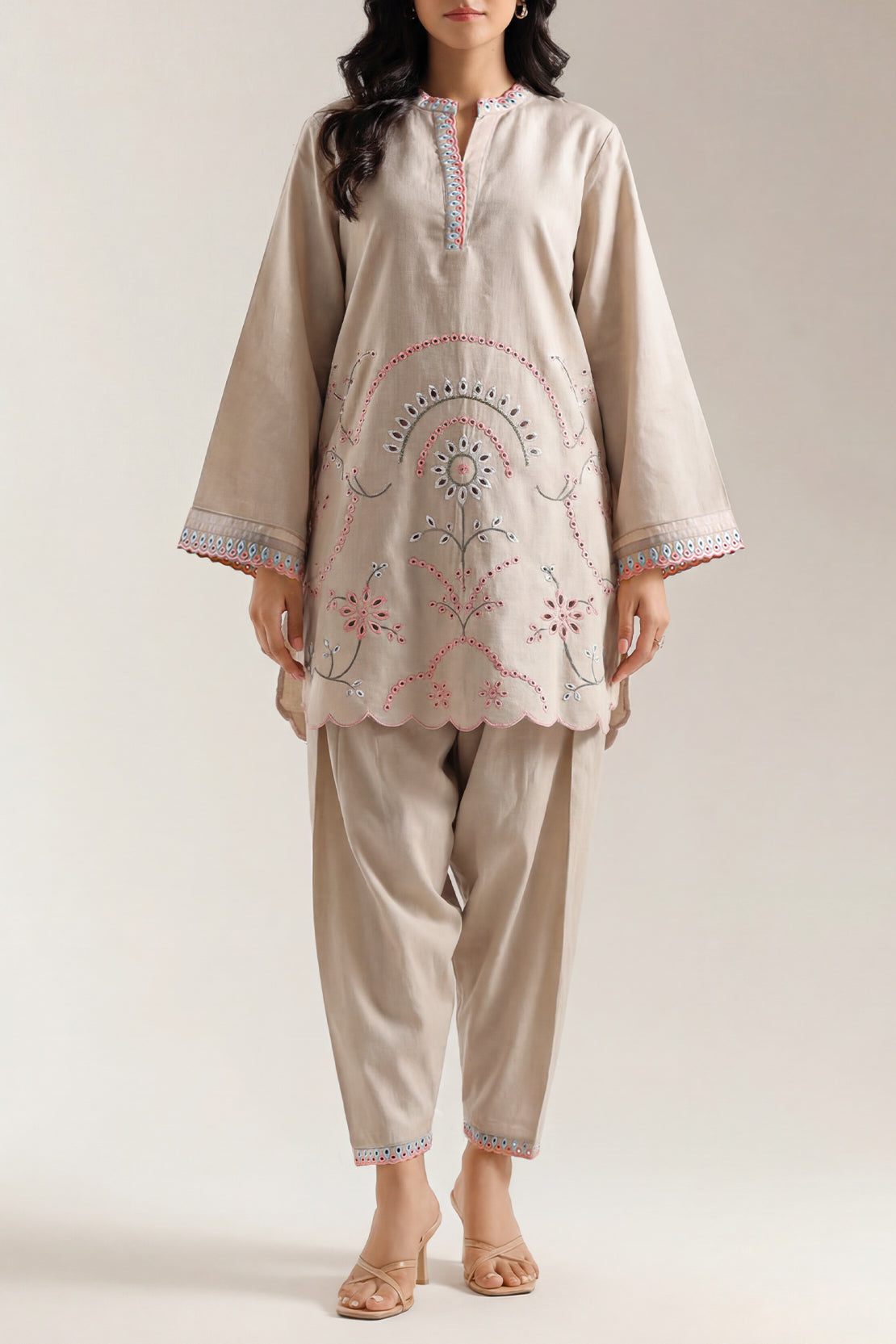 Solid Embroidered Cambric Stitched 2-Piece By SAYA Arrives In A Refined Beige Tone. Crafted From Lightweight, Soft Cambric Fabric That Breathes With Ease, The Shirt Features Subtle Tone-On-Tone Embroidery For A Touch Of Elegance. Paired With A Matching Ready-To-Wear Trouser, This Set Combines Polished Styling With Everyday Comfort—Ideal For Office Wear, Daytime Gatherings, Or Smart Casual Looks.