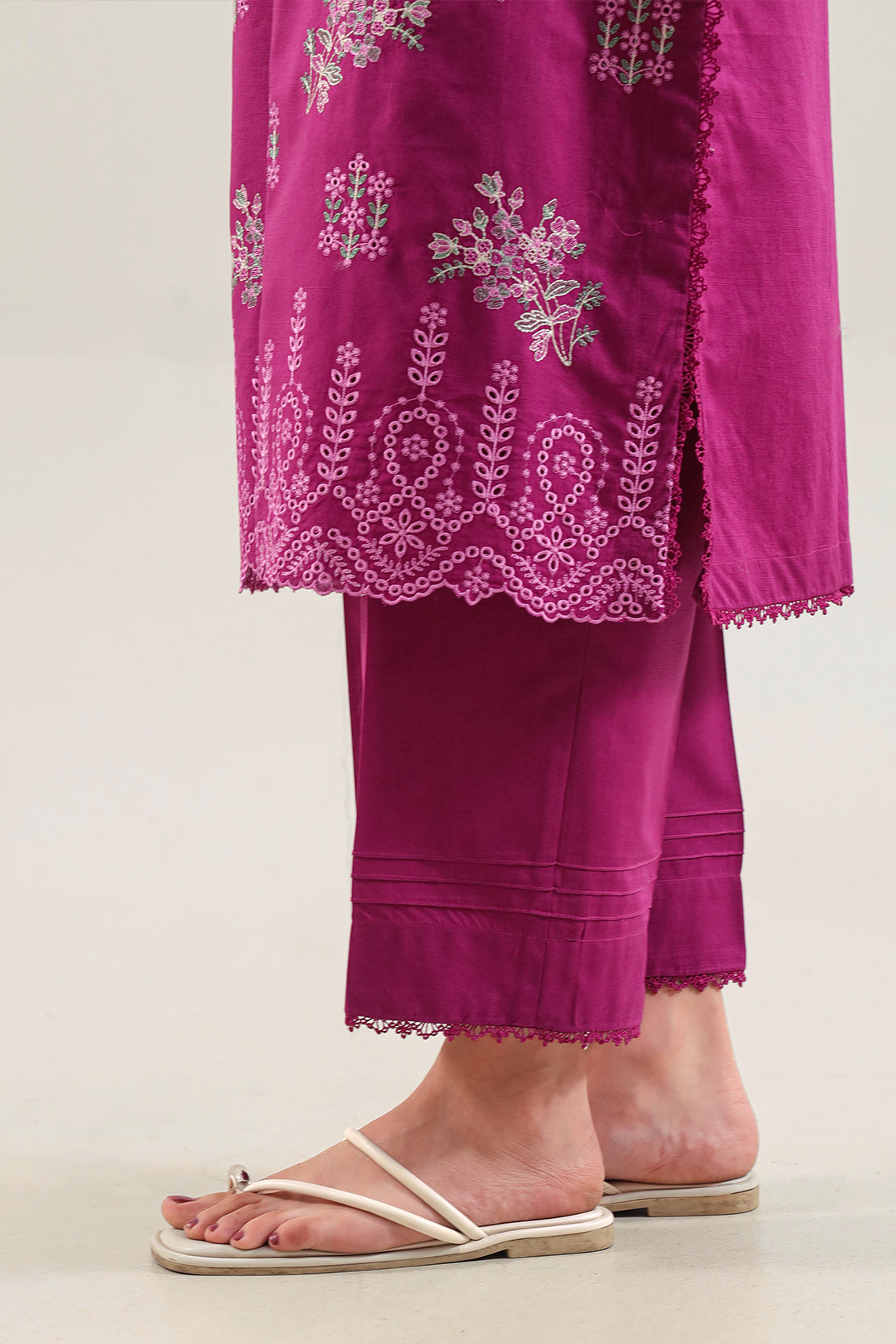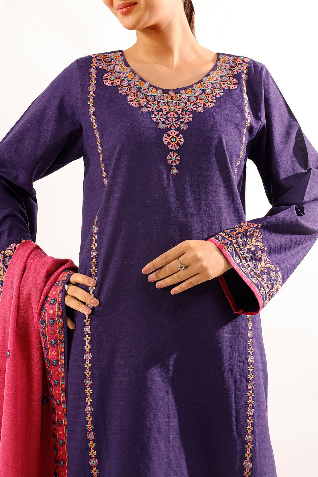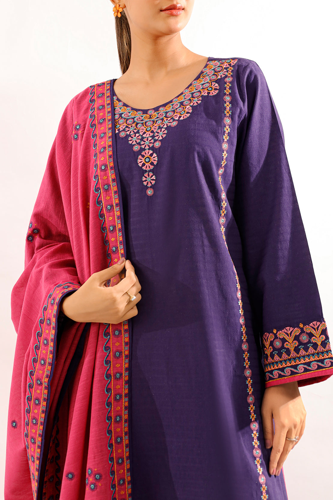 Solid Embroidered Slub Cotton Stitched 3 Piece
