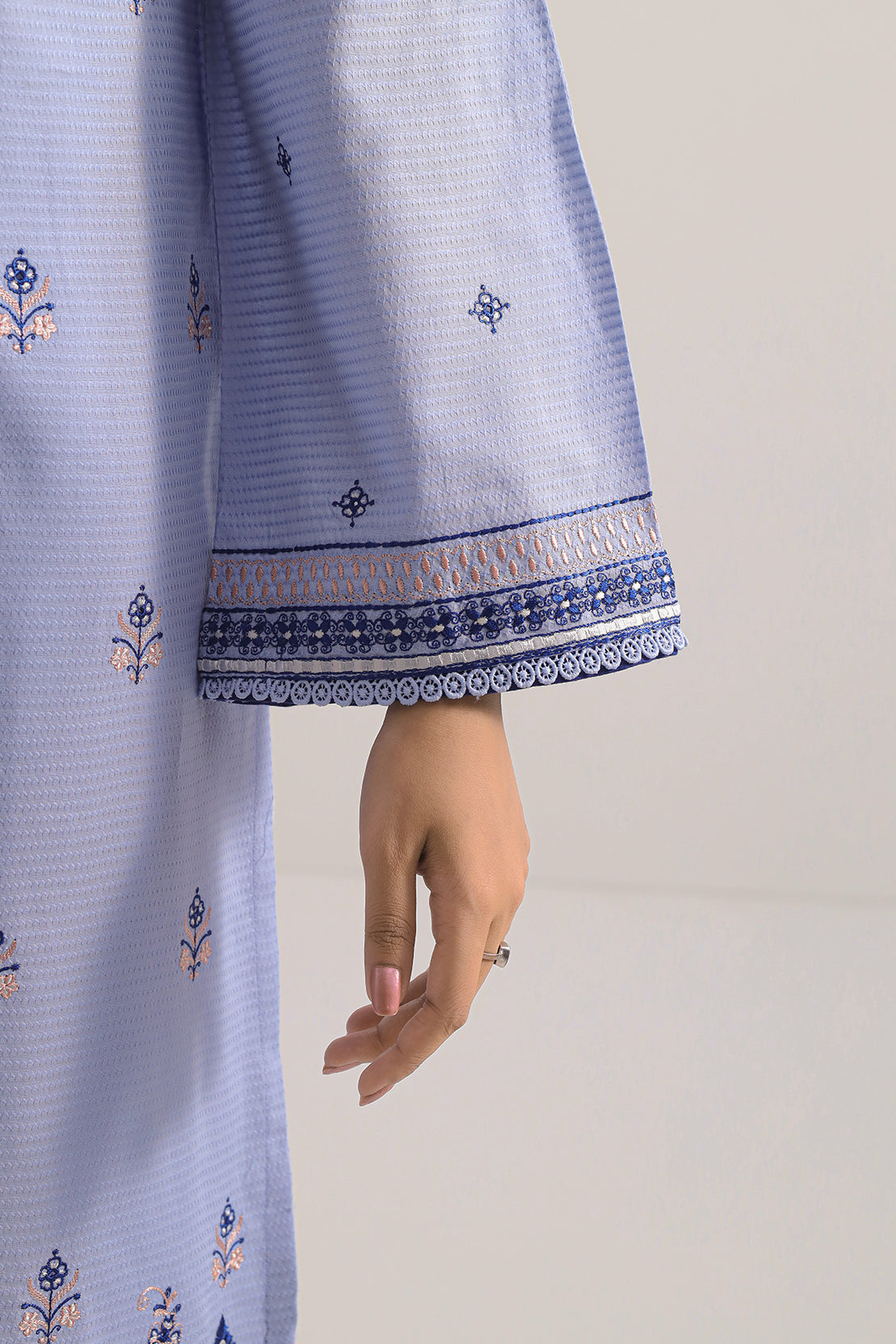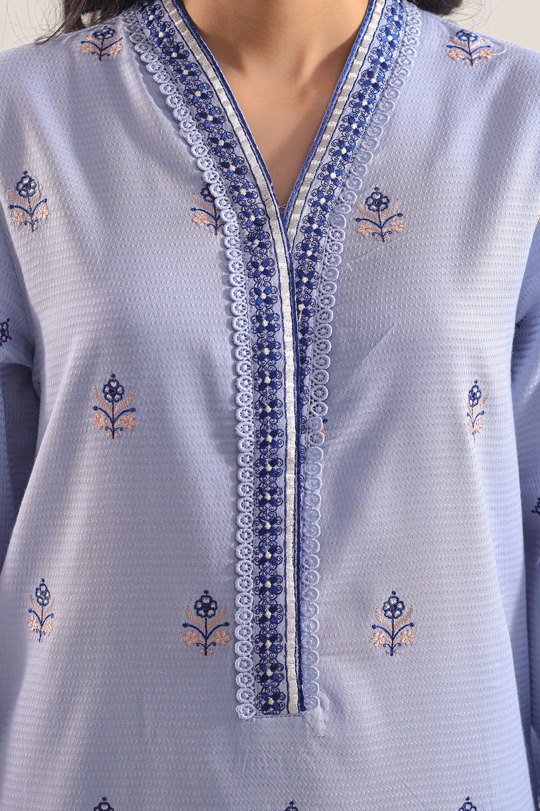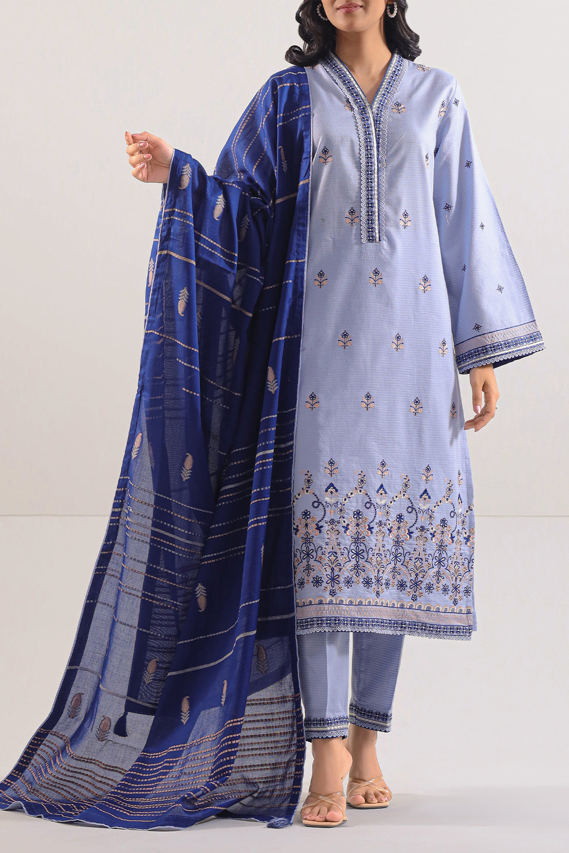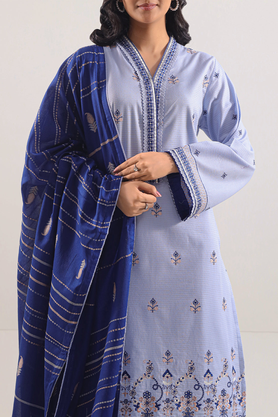 Blue Luxury Pret Embroidered Cotton Jacquard 3-Piece From SAYA Includes Ready-To-Wear Shirt, Trouser And Dupatta. The Premium Cotton Jacquard Provides Elegant Texture While Fine Embroidery On The Shirt Adds Refined Detail. Shirt Is Professionally Tailored With Clean Lines And Comfortable Fit; Trouser Matches With Sleek Cut; Dupatta Offers Graceful Layer And Coordinated Style. Perfect For Formal Occasions, Festive Gatherings Or Events Where You Aim For Timeless Elegance With Comfort.