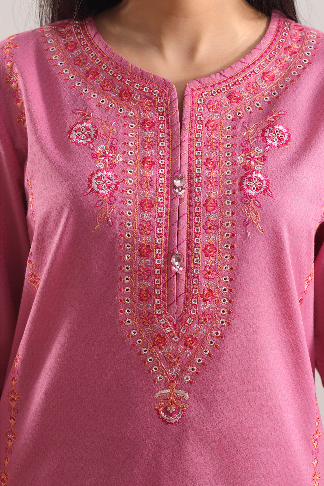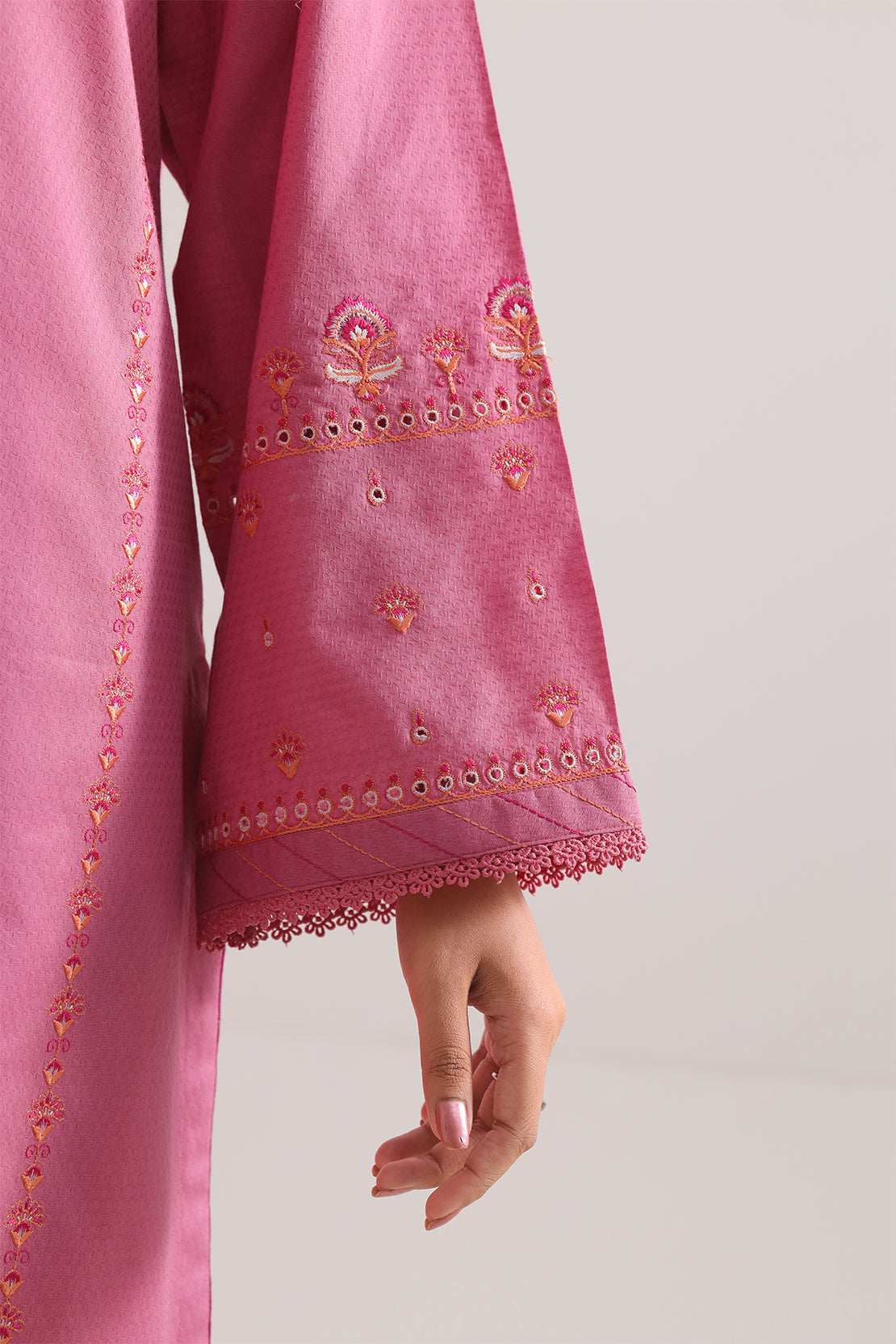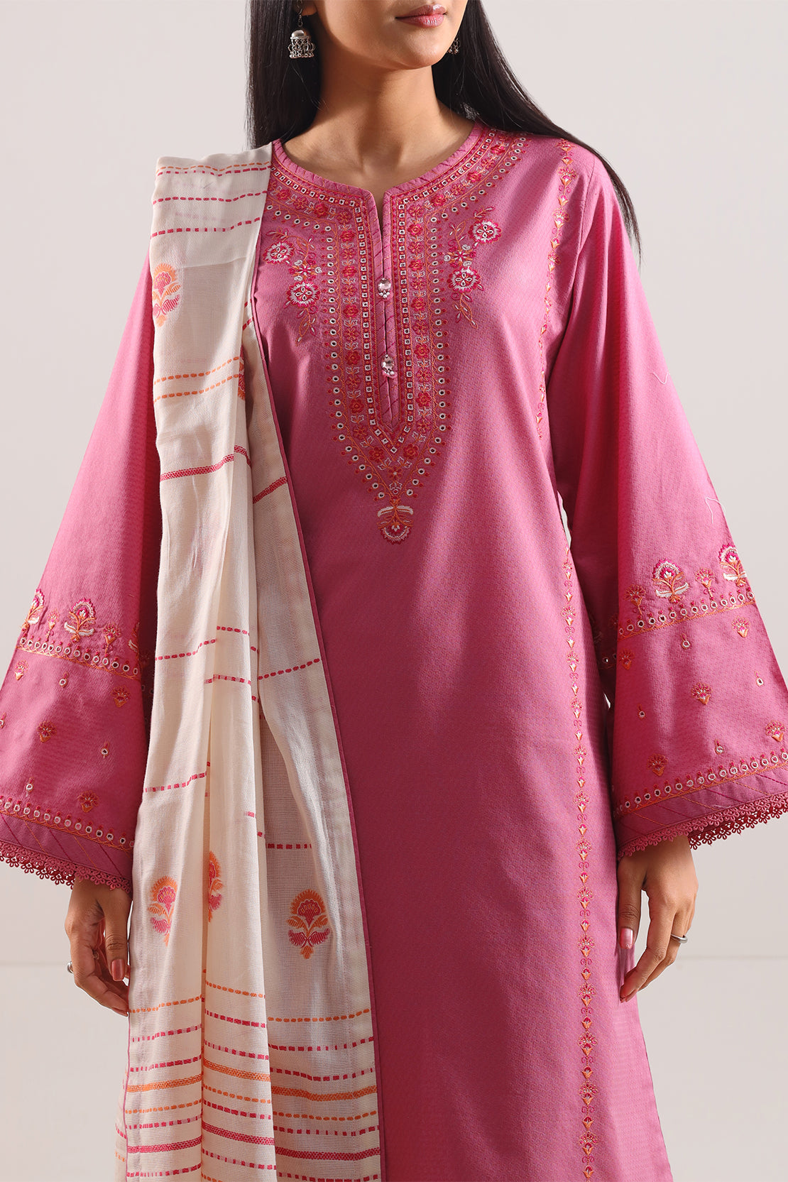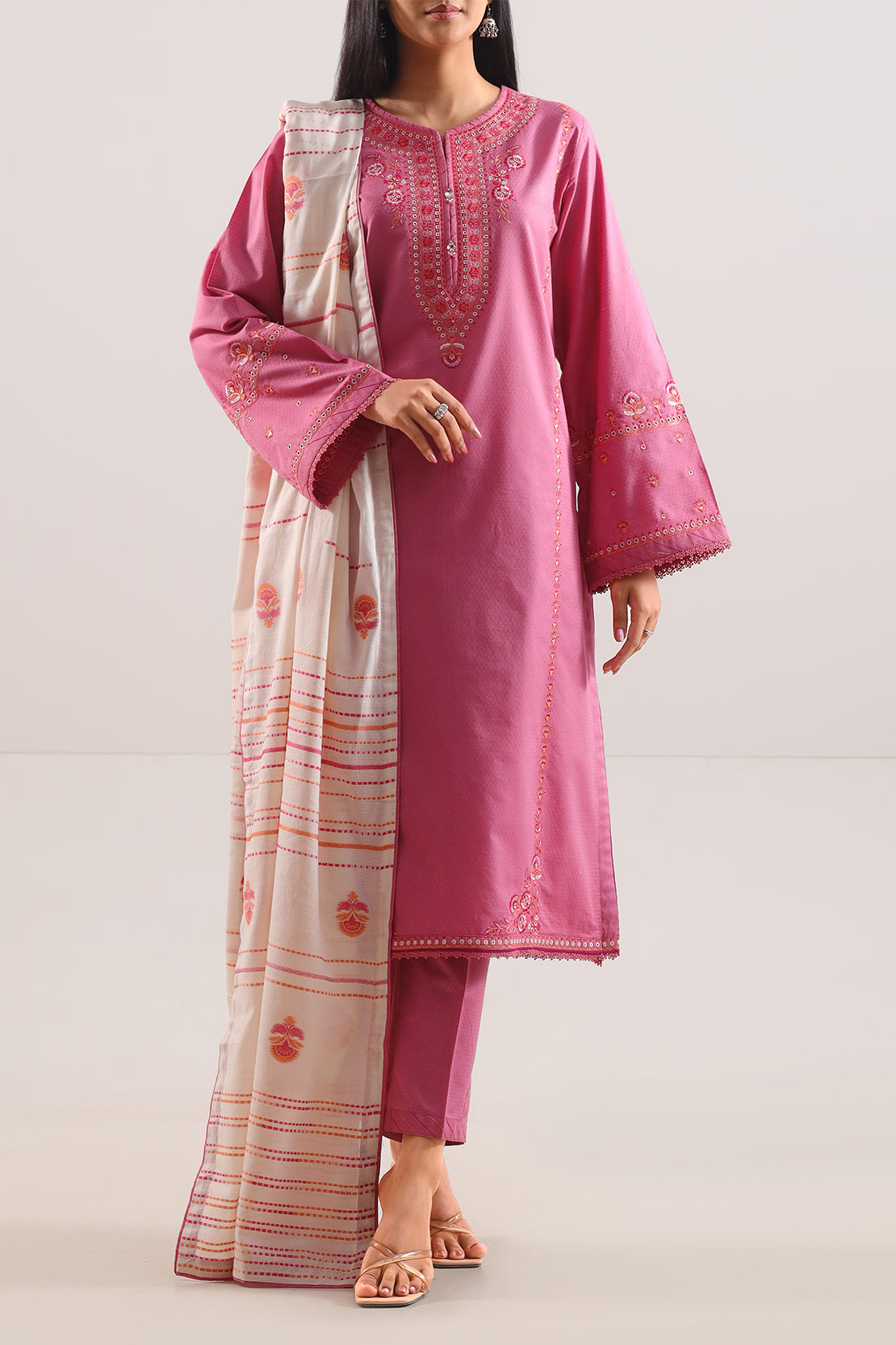 Soft Yet Striking, This SAYA Luxury Pret Embroidered Cotton Jacquard 3-Piece In Pink Offers Festive Elegance With Effortless Style. The Premium Cotton Jacquard Fabric Boasts A Subtle Texture That Adds Depth To The Gentle Pink Hue. Intricate Embroidery Delicately Embellishes The Ensemble, Enhancing Without Overpowering. Ready-To-Wear With Coordinated Shirt, Dupatta, And Trouser, The Set Comes Together With Impeccable Stitching And Clean Lines. Ideal For Weddings, Celebratory Gatherings, Or Elegant Day Events, This Ensemble Delivers A Perfect Blend Of Comfort, Luxury, And Poised Appeal.
