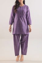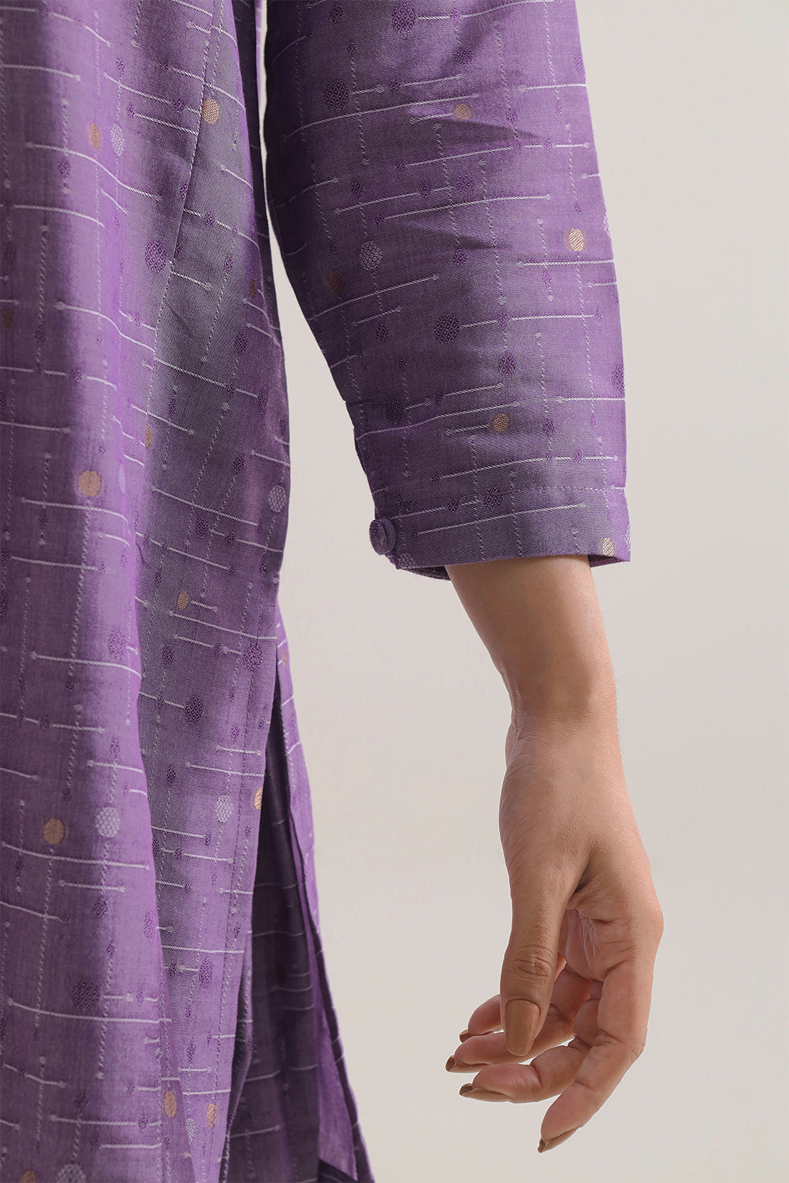 Regal And Elegant, This SAYA Cotton Jacquard Stitched 2-Piece In Majestic Purple Imbues Poise With Ease. Expertly Woven In Rich Cotton Jacquard, The Fabric Boasts A Distinctive Textured Weave That Captures Light And Adds Depth. The Shirt Is Meticulously Tailored With Sharp Seams And A Clean Finish, While The Coordinated Trouser Complements With A Harmonious Silhouette. Designed For Graceful Presence, This Ensemble Is Perfect For Day To Evening Events, Festive Gatherings, Or Sophisticated Soirées. A Statement Of Understated Luxury That Effortlessly Meets Fashion And Function.