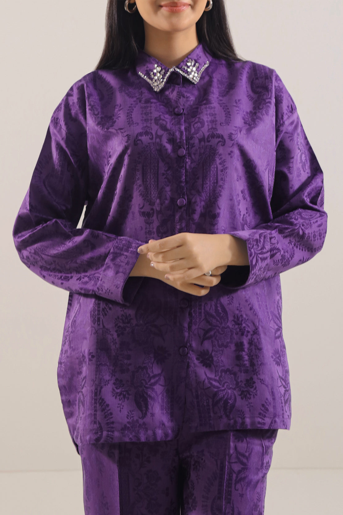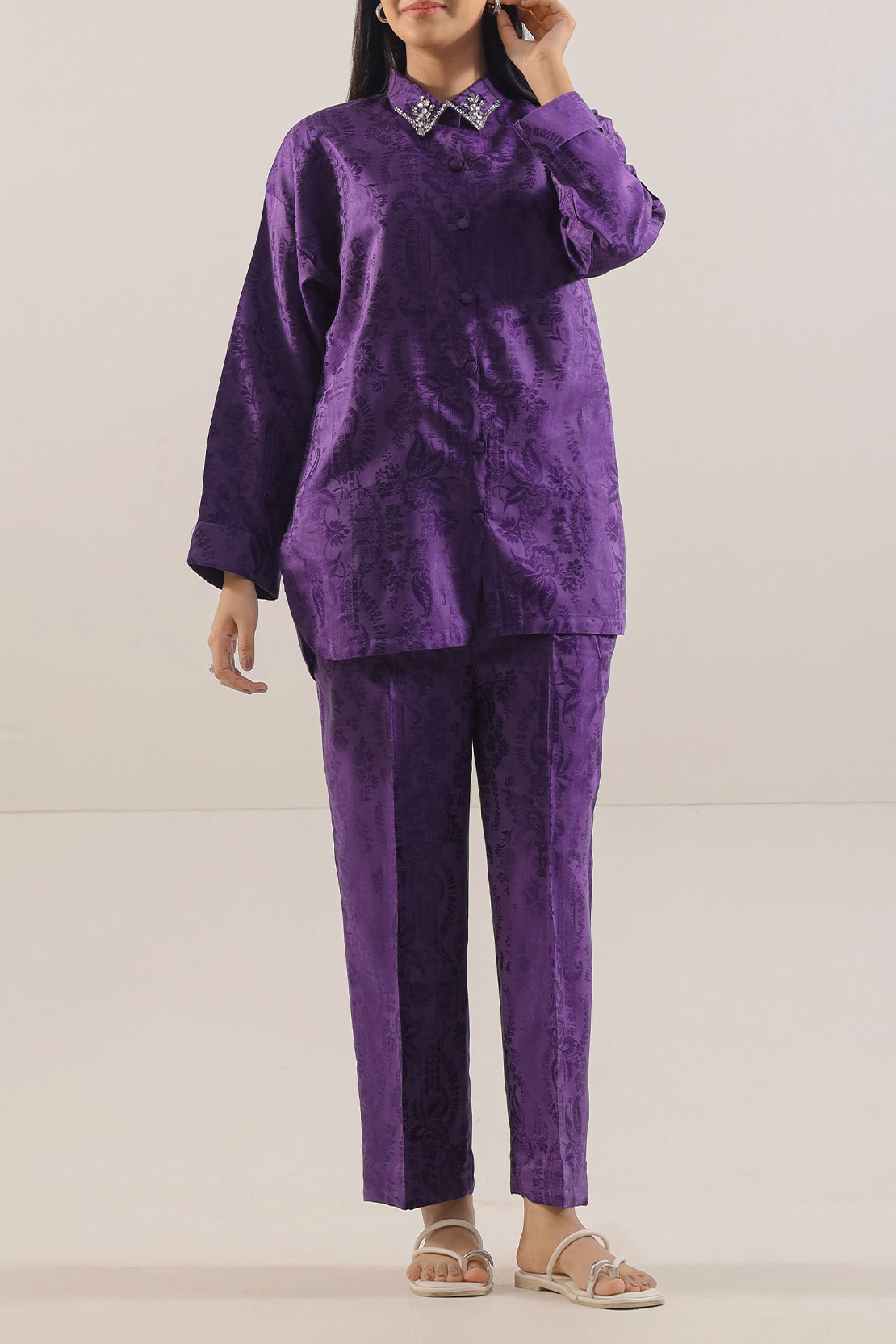 Cotton Jacquard Stitched 2-Piece By SAYA Arrives In A Rich Purple Tone. Crafted From Textured Jacquard Cotton That Blends Structure With Breathability, The Shirt Features Subtle Tonal Patterns And Clean Stitching For A Polished Look. Accompanied By A Matching Trouser, This Ready-To-Wear Ensemble Delivers Refined Comfort And Style. Ideal For Semi-Formal Occasions, Office Evenings, Or Elegant Daywear With Ease.