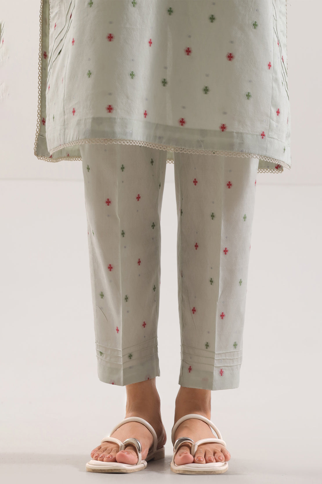 Cotton Jacquard Stitched 2-Piece By SAYA Radiates Refined Style In A Deep Mint Green Tone. The Textured Jacquard Cotton Fabric Offers Elegant Depth While Remaining Soft And Breathable. Its Ready-To-Wear Shirt Features Clean Structure, Subtle Weave Detail, And Precise Stitching. Paired With A Matching Trouser, This Ensemble Delivers A Polished Look Suitable For Semi-Formal Events, Office Wear, Or Elevated Daywear.