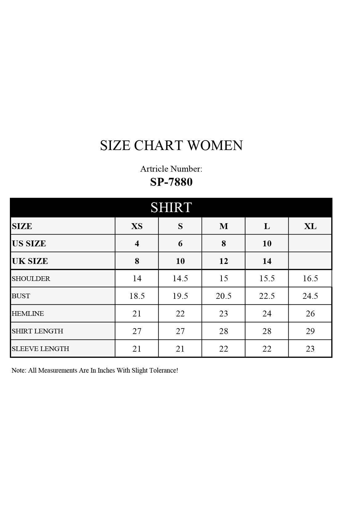 | Sleeve Length | 0.25 | 21 | 21 | 22 | 22 | 23 |