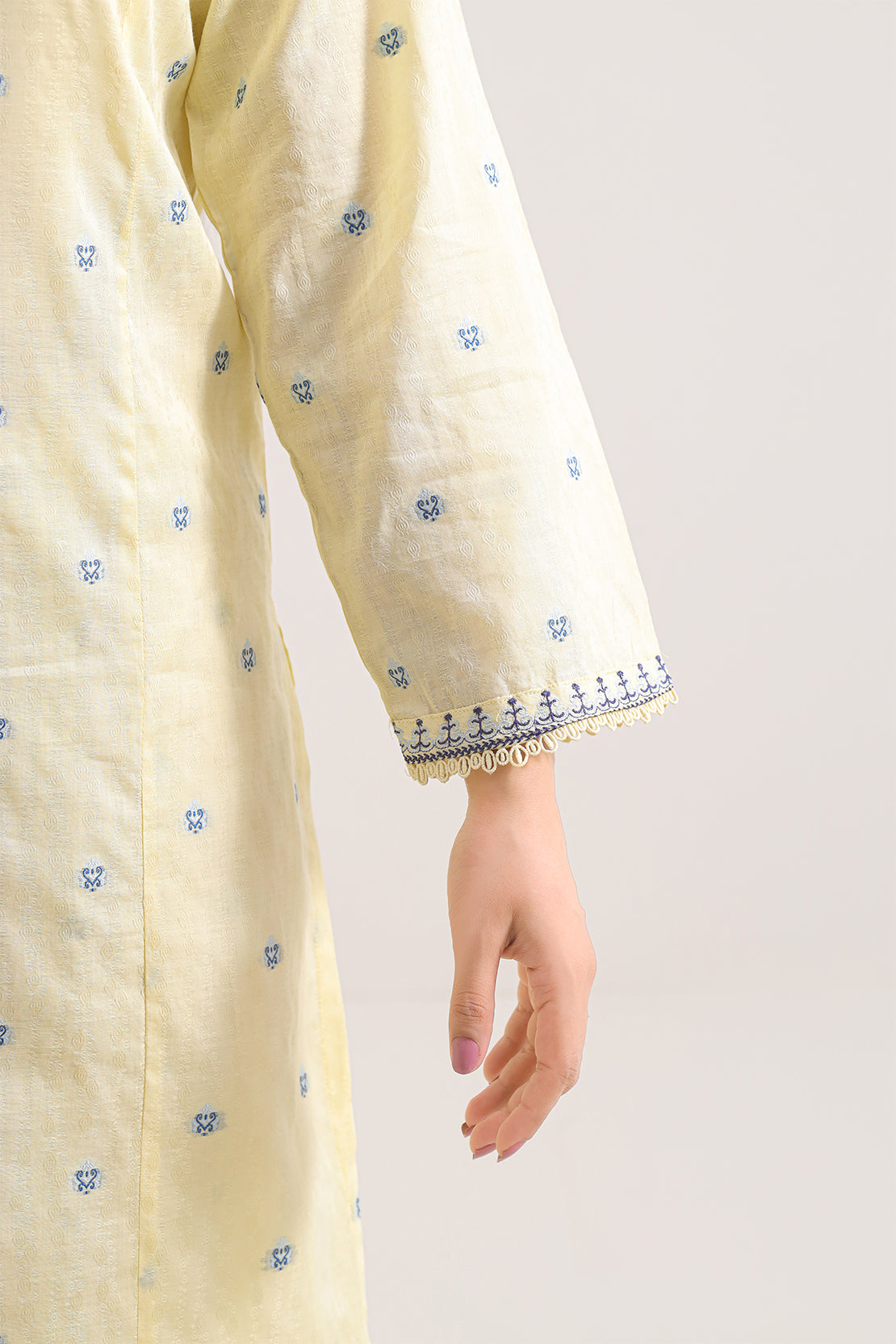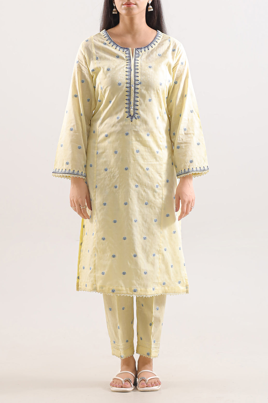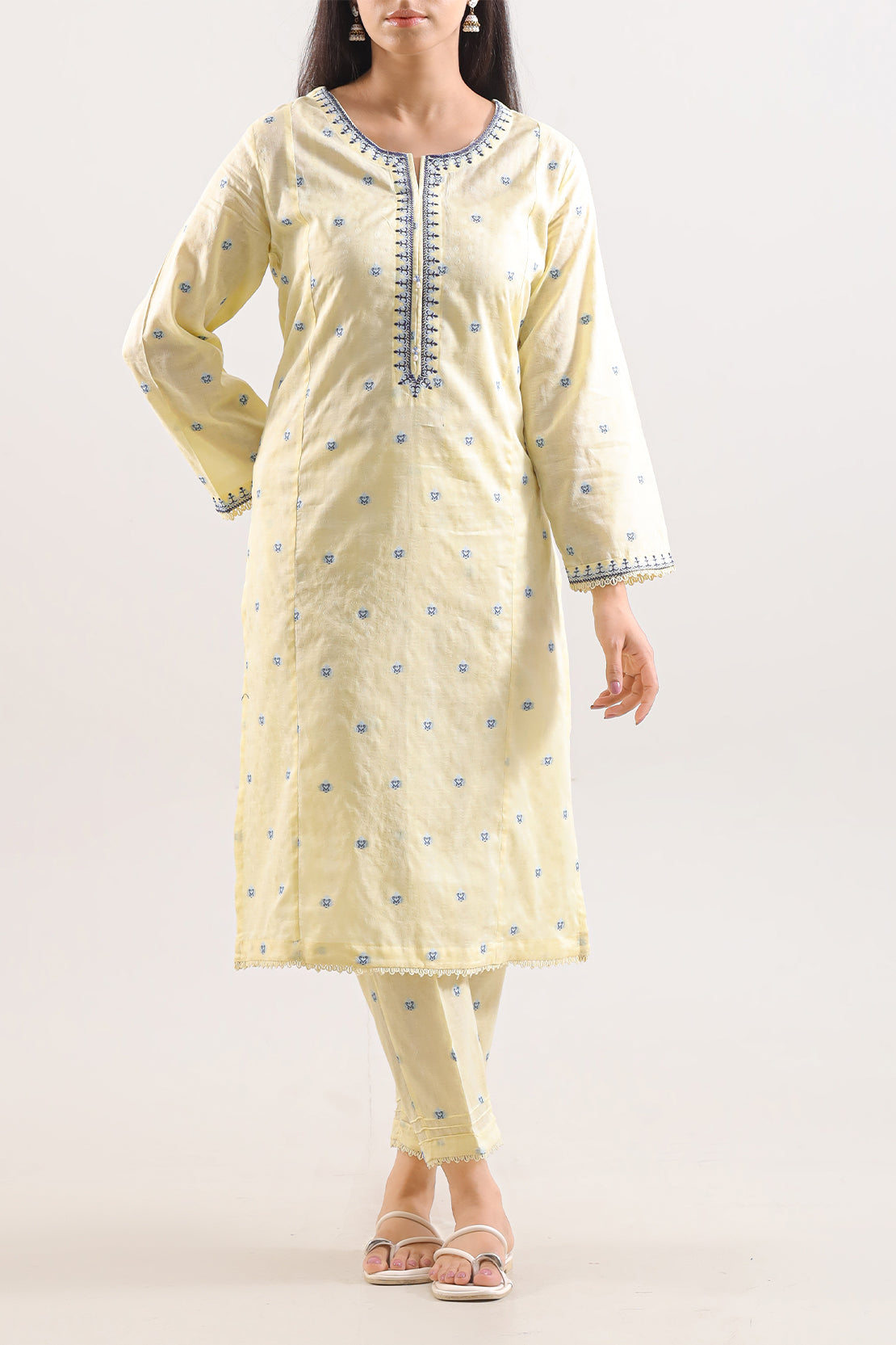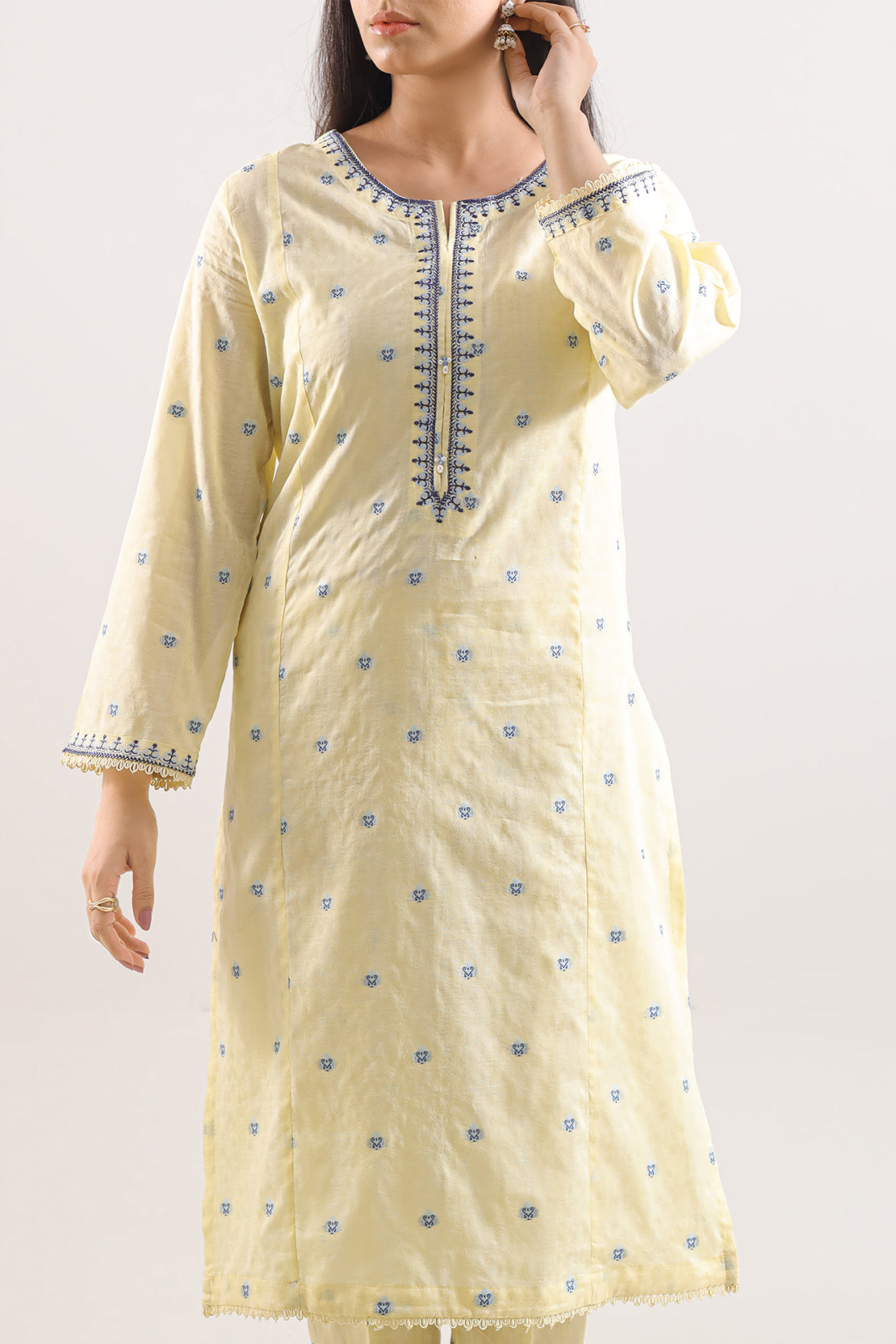 Elevate Your Wardrobe With This Elegant Light Yellow Embroidered Cotton Jacquard 2-Piece Set by SAYA. Crafted From Rich Cotton Jacquard Fabric, The Shirt Features Delicate Embroidery Across A Polished Ready-To-Wear Silhouette, Complemented By A Matching Trouser For A Cohesive Look. Ideal For Semi-Formal Occasions, Day Gatherings, Or Events Where You Seek Style And Comfort In Equal Measure.
