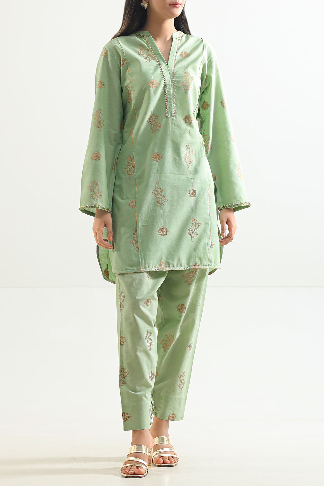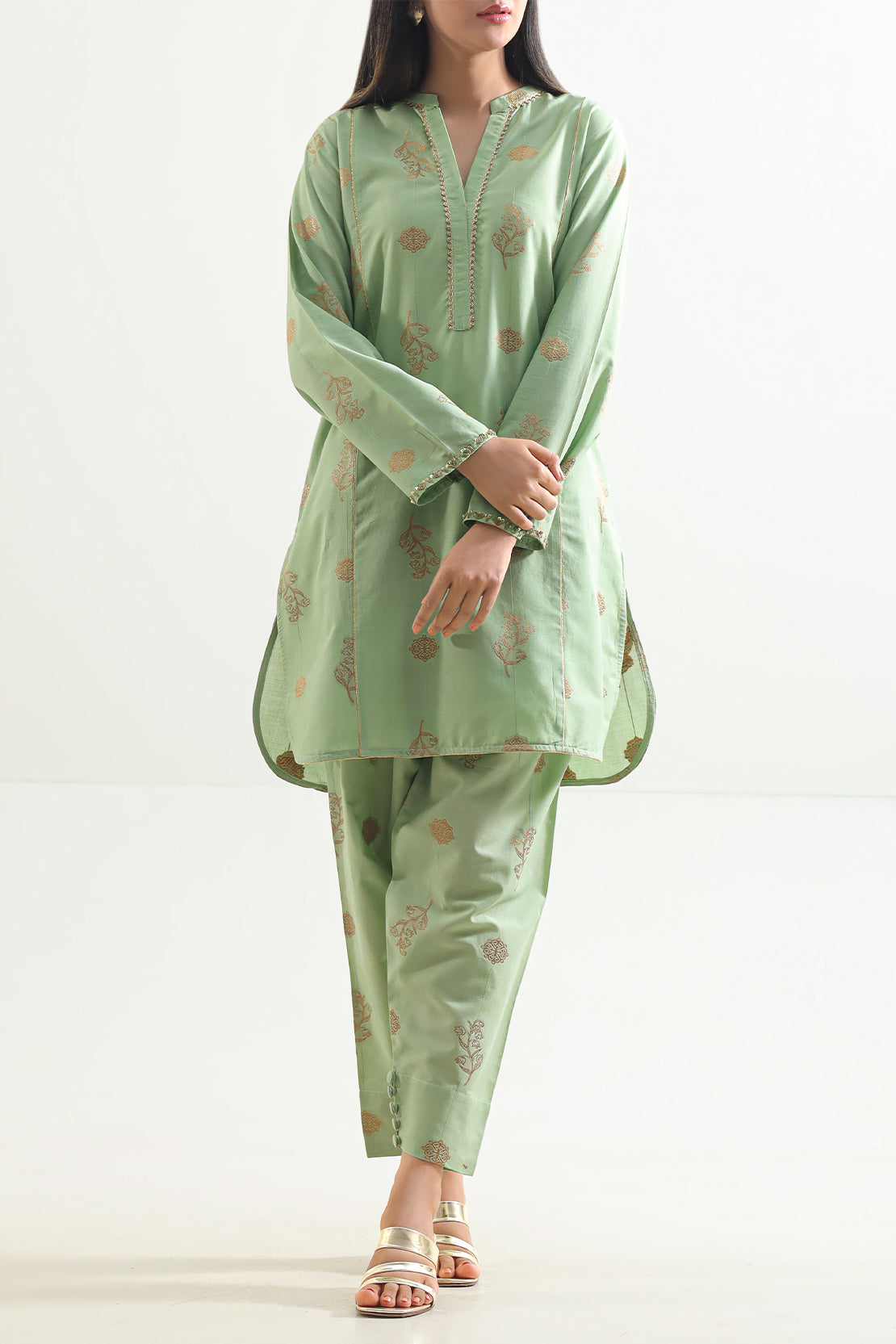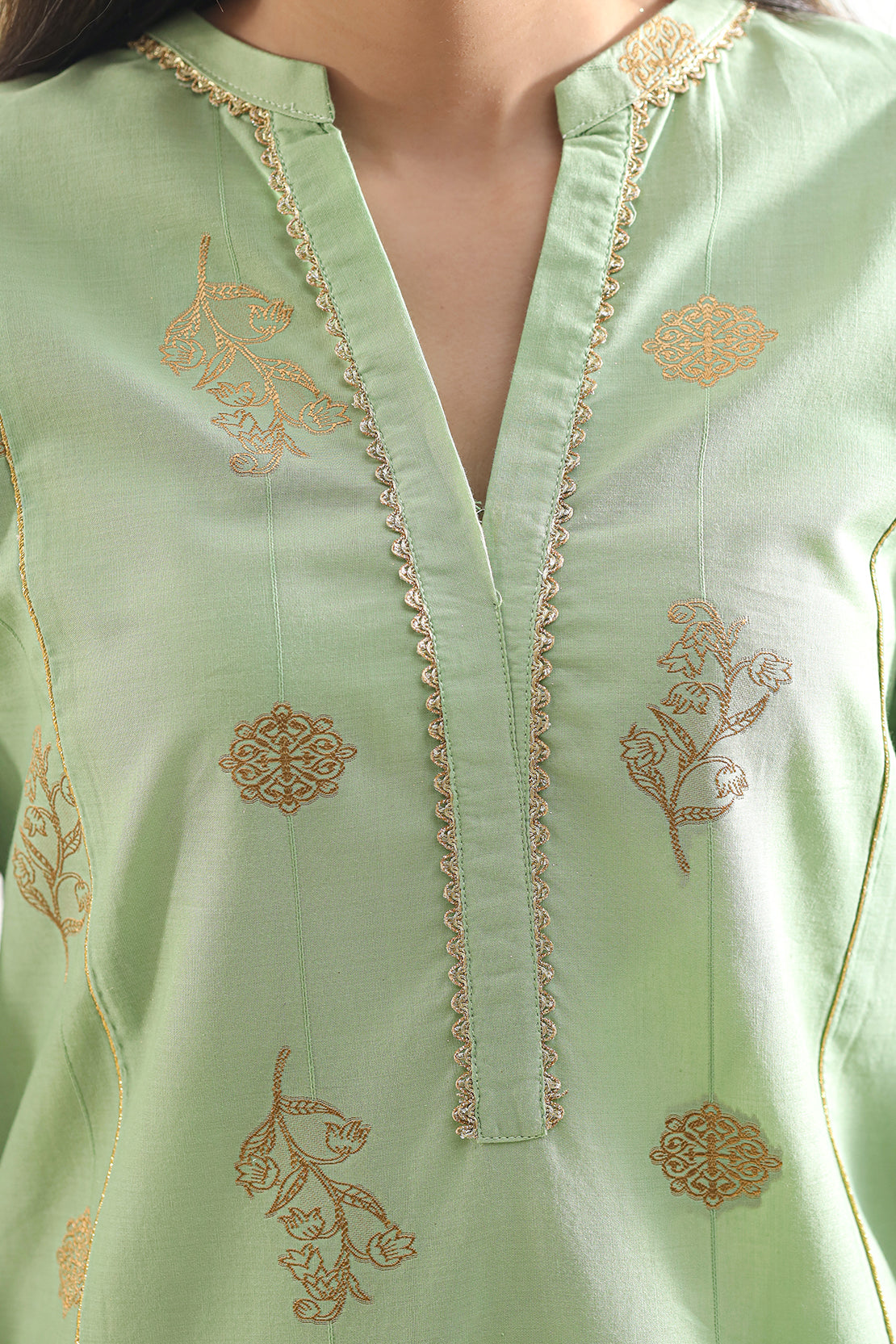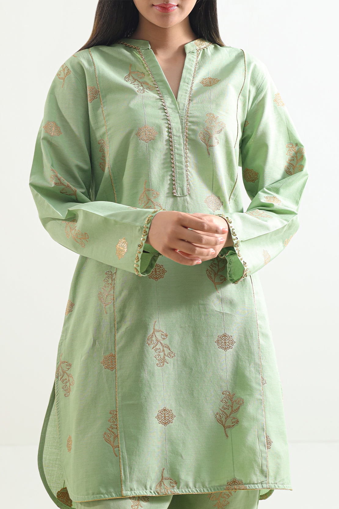 Elevate Your Wardrobe With SAYA’s Jacquard Cotton Stitched Shirt. Crafted From Cotton Jacquard Fabric In Pastel Mint, It Features A Subtle Textured Weave And Meticulous Tailoring. Lightweight Yet Structured, It Gracefully Merges Timeless Texture With Tranquil Sophistication—Perfect For Smart Daywear, Refreshing Casual Looks, Or Sleek Everyday Refinement.