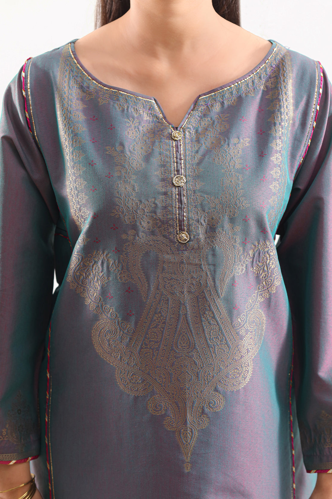 Regal Charm Meets Everyday Grace In This SAYA Luxury Pret Cotton Jacquard 3‑Piece Ensemble. The Ready‑To‑Wear Shirt Boasts Classic Jacquard Texture With Refined Embellishments, Complemented By A Coordinating Neckpiece And Tailored Trouser. Crafted From Soft, Breathable Cotton For Structured Comfort, It’s Ideal For Weddings, Semi‑Formal Gatherings, Or Festive Celebrations With Polished Sophistication.