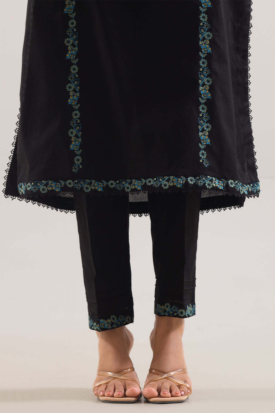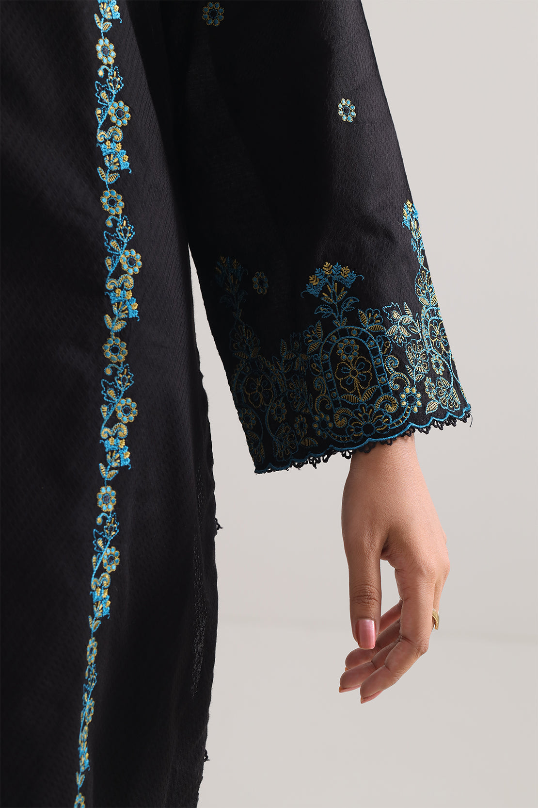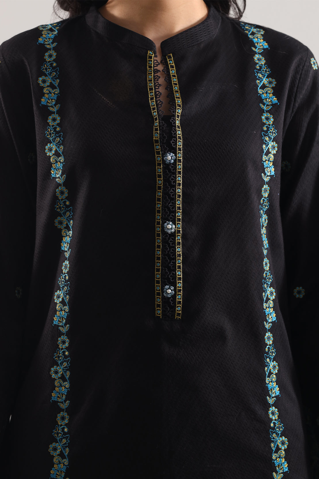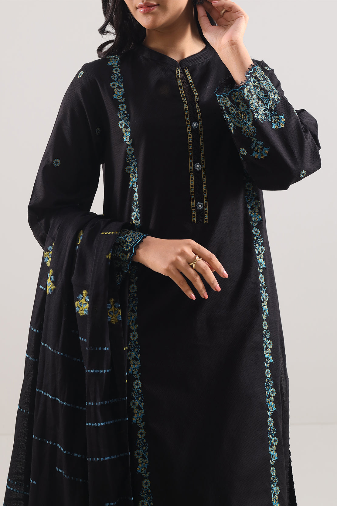 Step Into Distinct Elegance With This Black-Toned Luxury Pret Cotton Jacquard Stitched 3-Piece Set From SAYA. Crafted In Rich Cotton Jacquard Fabric, It Runds With Intricate Embroidery On A Ready-To-Wear Shirt, A Matching Jacquard Dupatta That Flows Effortlessly, And Tailored Dyed Trousers That Provide Poise Without Effort. Perfectly Suited To Formal Occasions, Daytime Festivities, Or Timeless Evening Dressing That Speaks Of Grace And Luxe Comfort.