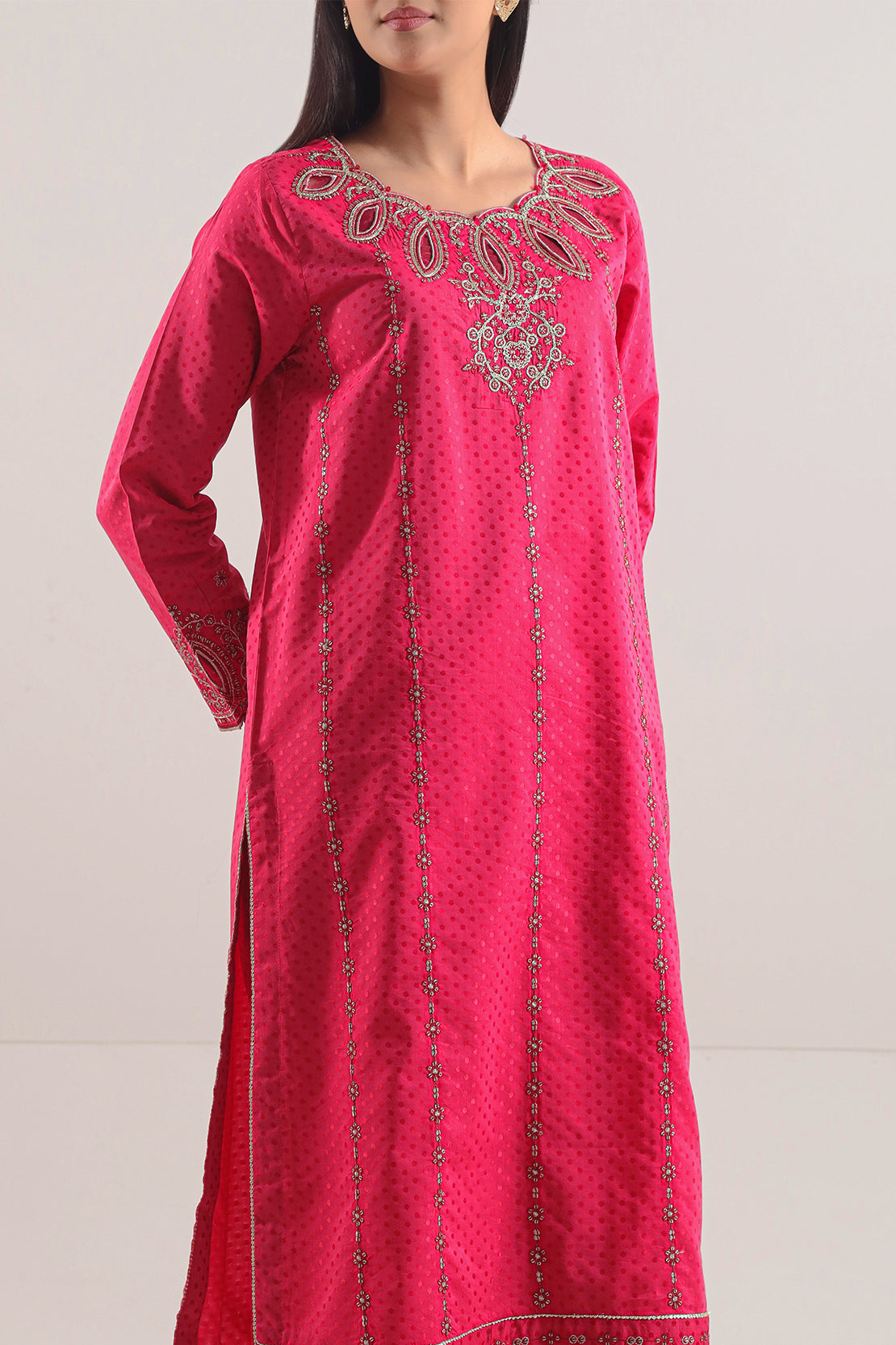 Elevate Your Wardrobe With This Luxury Pret Embroidered Self-Jacquard 2-Piece Set By SAYA, Crafted From Premium Self-Jacquard Fabric With Delicate Thread Embroidery Enhancing Its Textured Weave. The Ready-To-Wear Shirt Features Refined Detailing And Polished Tailoring, Perfectly Paired With A Coordinated Trouser Providing Comfort And Structured Fit. Ideal For Semi-Formal Gatherings, Refined Daytime Events, Or Effortless Festive Statements Where Elegance Meets Everyday Sophistication.