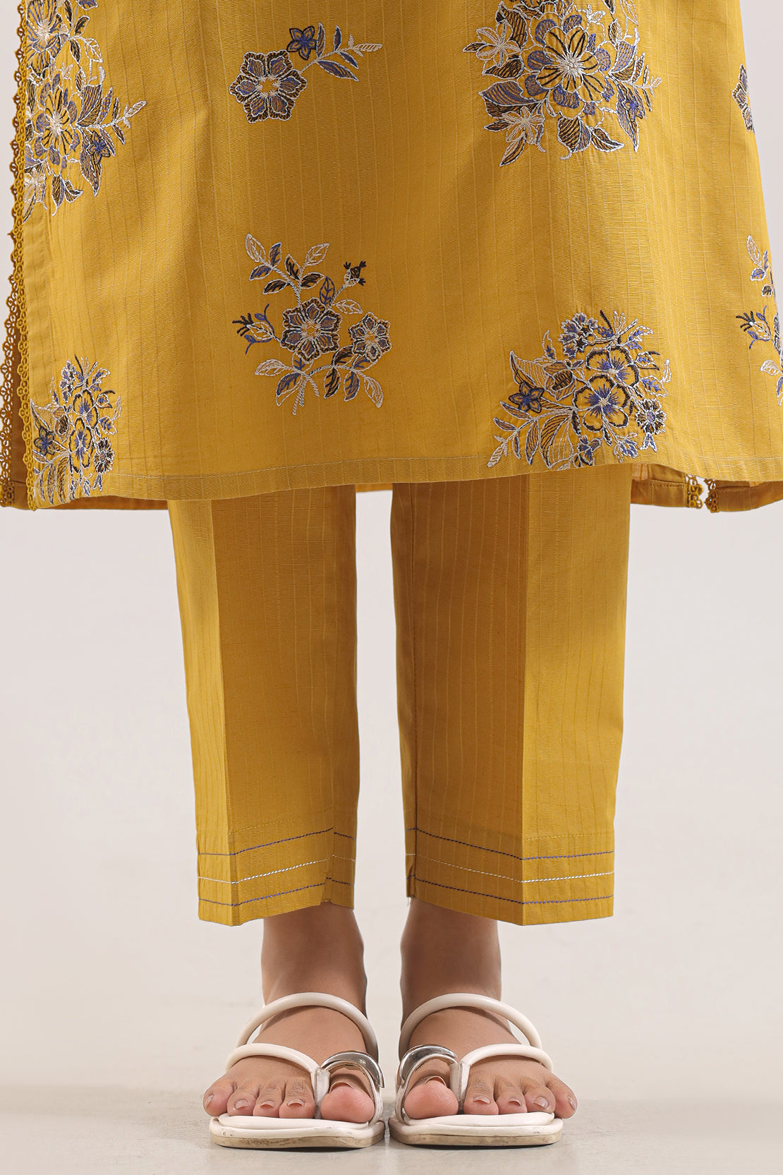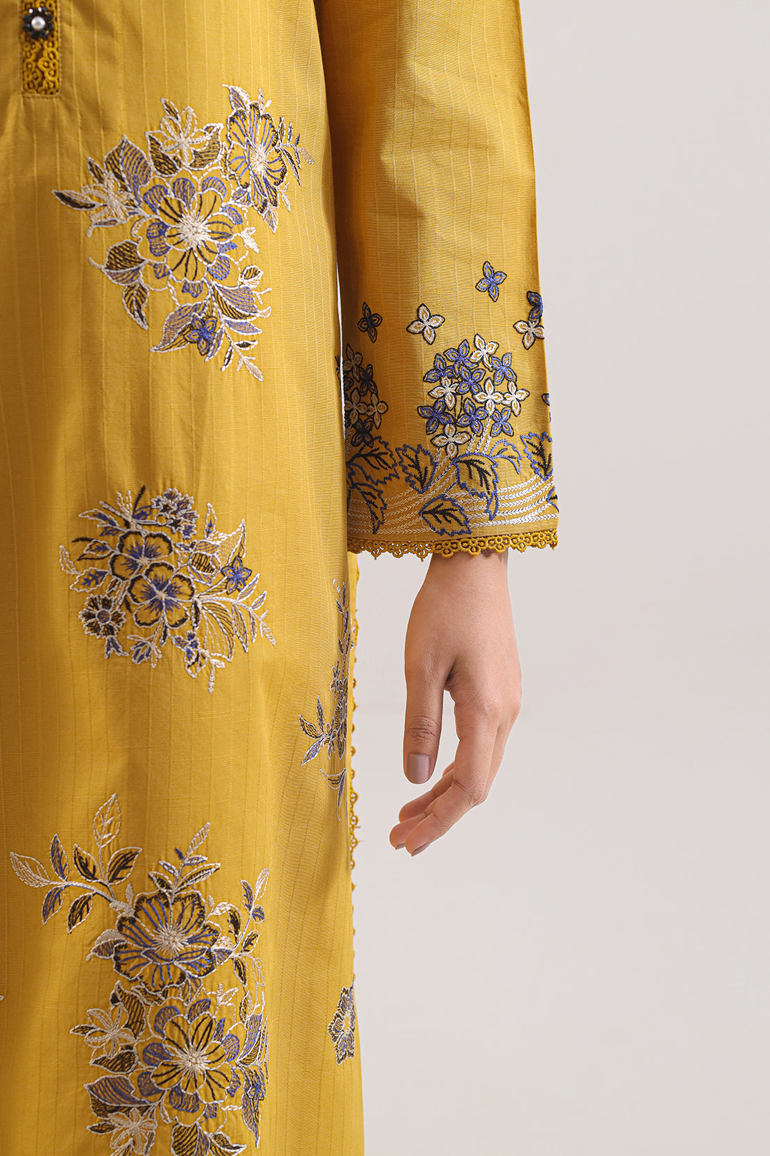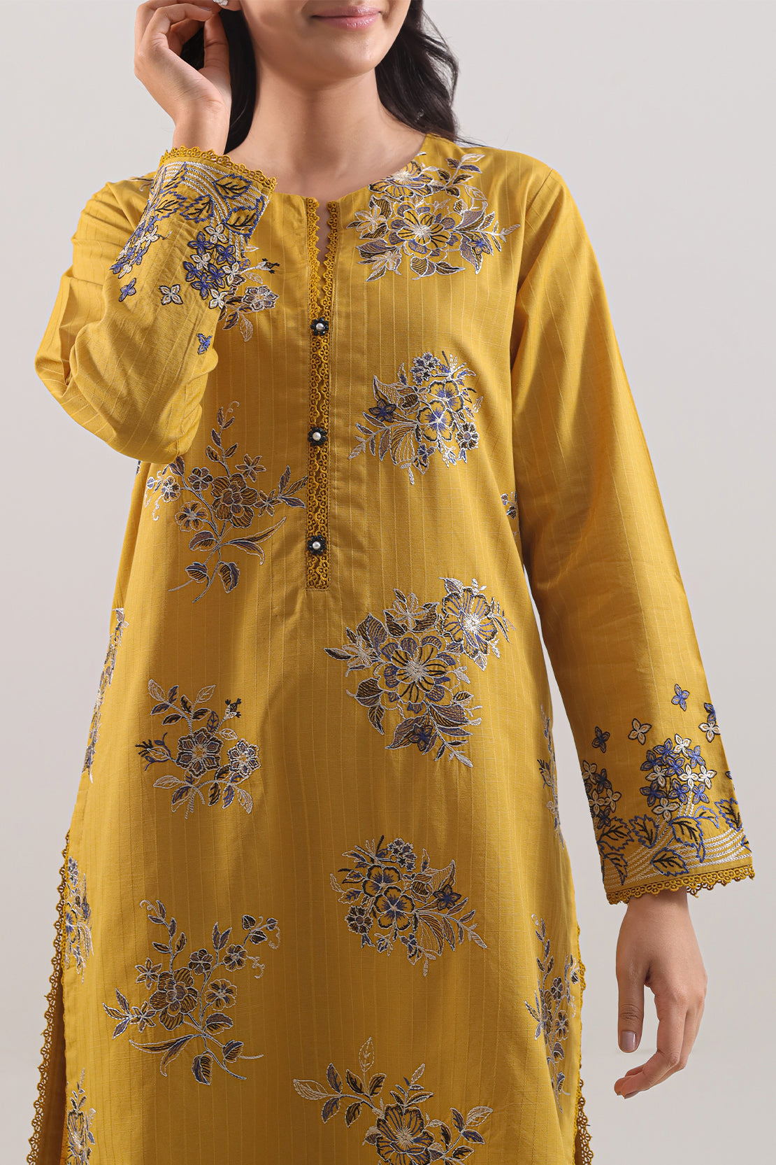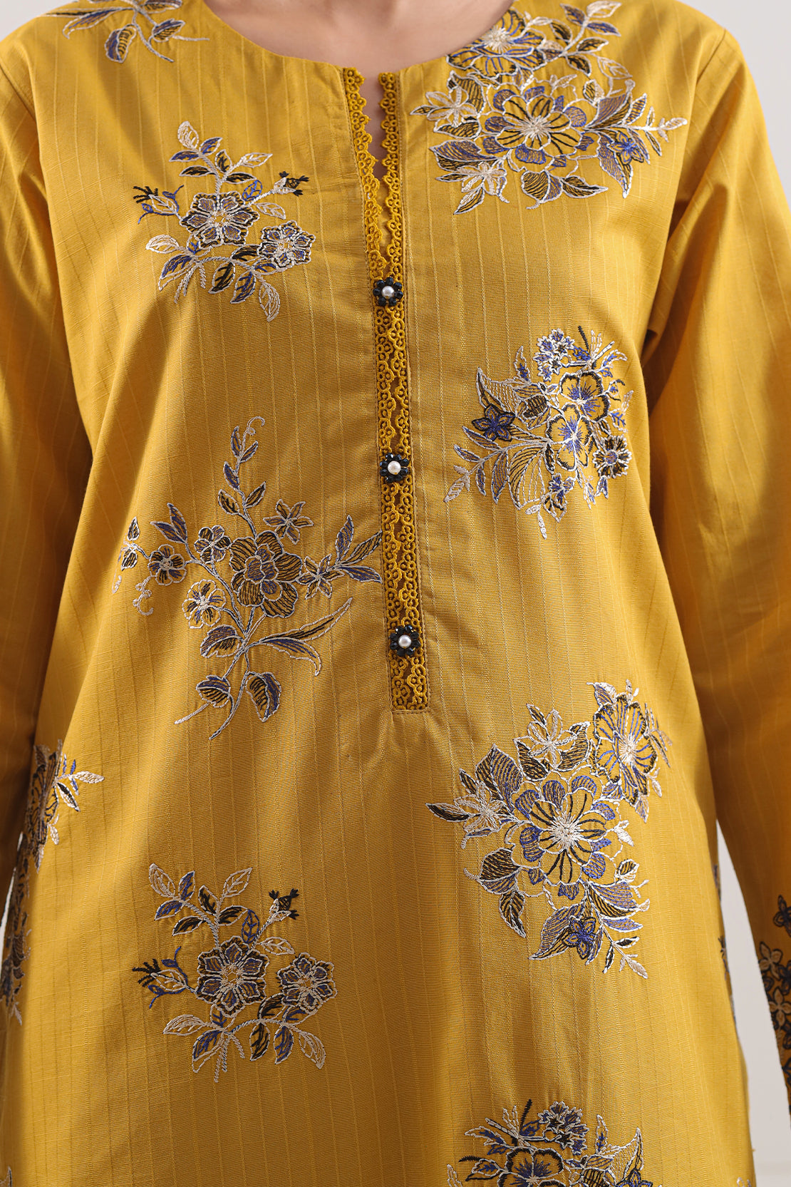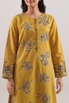 Elevate your ensemble with the SAYA Luxury Pret Embroidered Slub Cotton 2-Piece Set, crafted from slub cotton that offers refined texture and soft drape. The ready to wear embroidered shirt comes in a rich mustard tone with expert stitching, paired with a dyed trouser for a complete look. Perfect for semi formal occasions or stylish daywear.