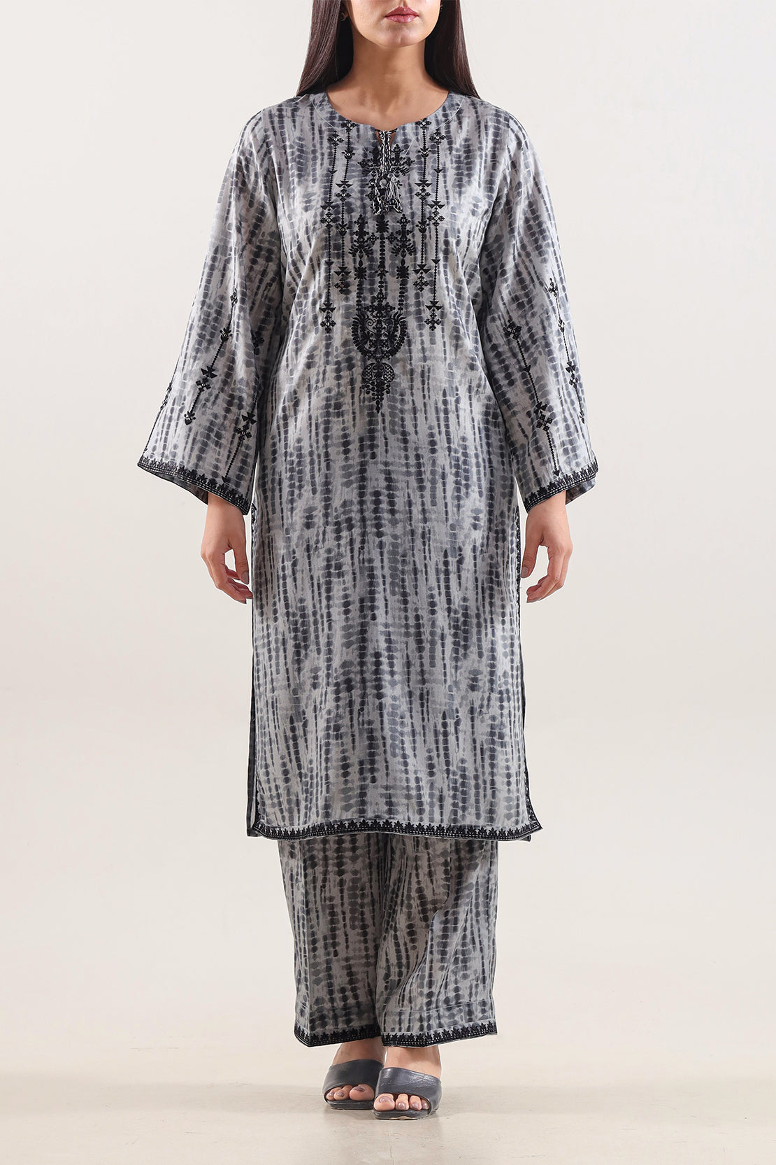 Elevate Your Wardrobe With This Exquisitely Designed Two-Piece From SAYA, Crafted In Lawn Fabric — A Fine, Lightweight Known For Its Breathability And Refined Texture. The Shirt Features Intricate Arabic-Inspired Embroidery That Adds A Touch Of Cultural Sophistication Without Overpowering The Subtle Print. The Matching Trouser Complements With A Straight Cut And Seamless Stitching, Delivering A Polished, Coordinated Look. Perfect For Daytime Festivities, Semi-Formal Events, Or Elegant Summer Gatherings, This Set Combines Comfort, Quality Craftsmanship, And Timeless Style.