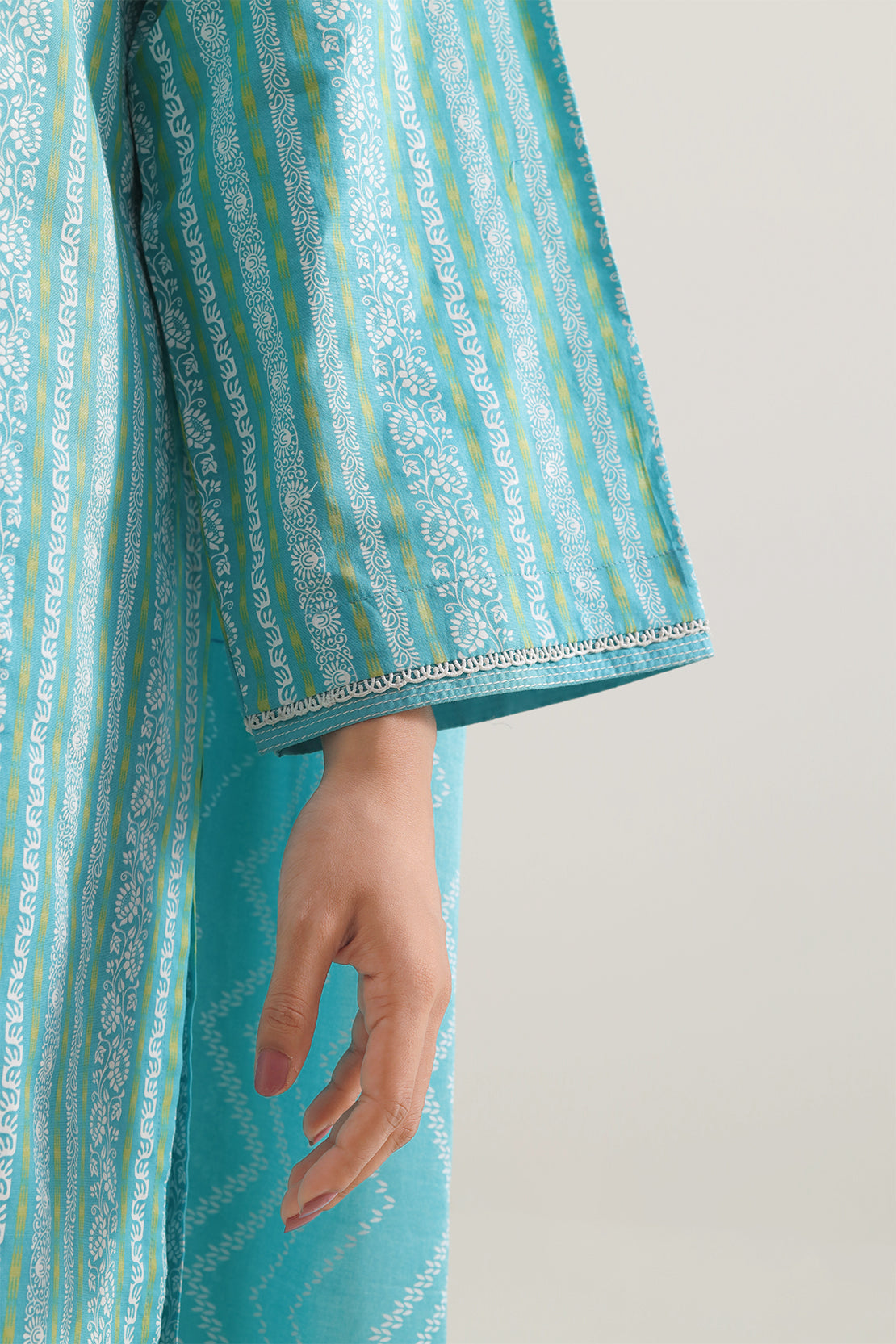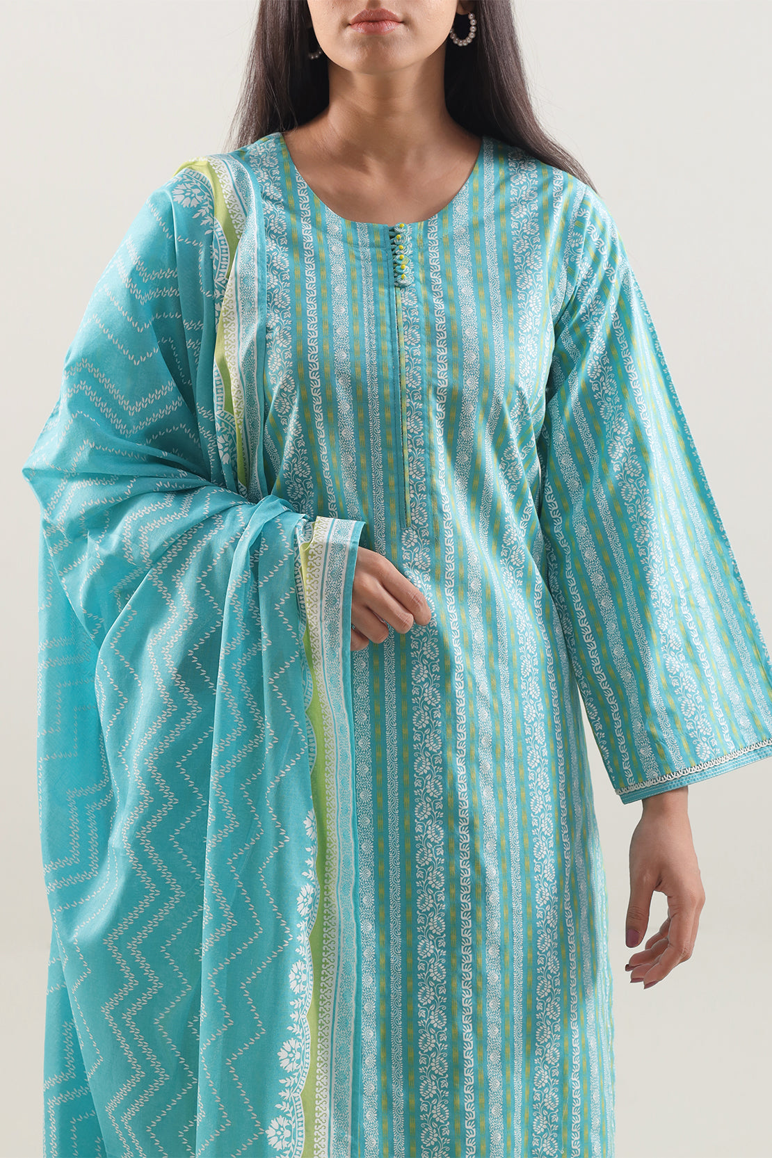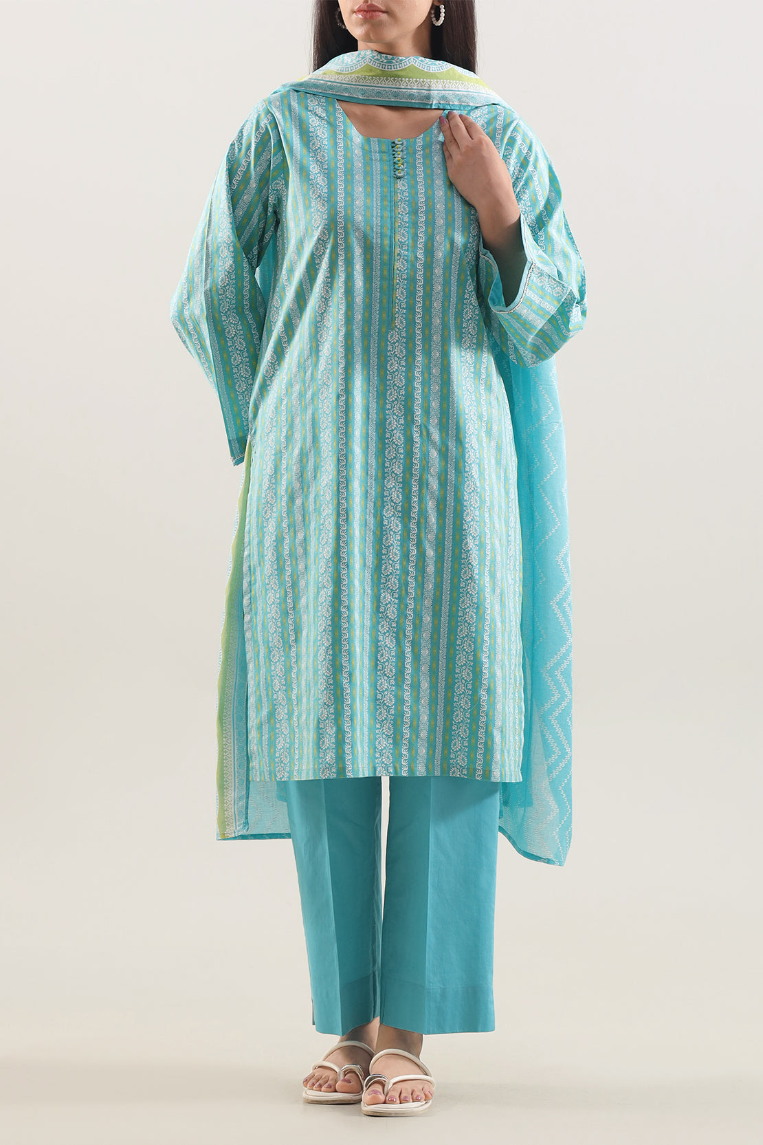 Elevate your wardrobe with this refined three piece ensemble from SAYA, crafted in ultra soft lawn fabric that offers exceptional breathability and a comfortable hand. The shirt features an elegant all over print in soothing tones, thoughtfully paired with a coordinating printed dupatta that adds visual flow and refinement. The set is completed with a trouser cut for structure and ease of movement ideal for daytime gatherings, smart casual occasions or festive lunches. This offering seamlessly blends fabric quality, print appeal and ready to wear convenience.