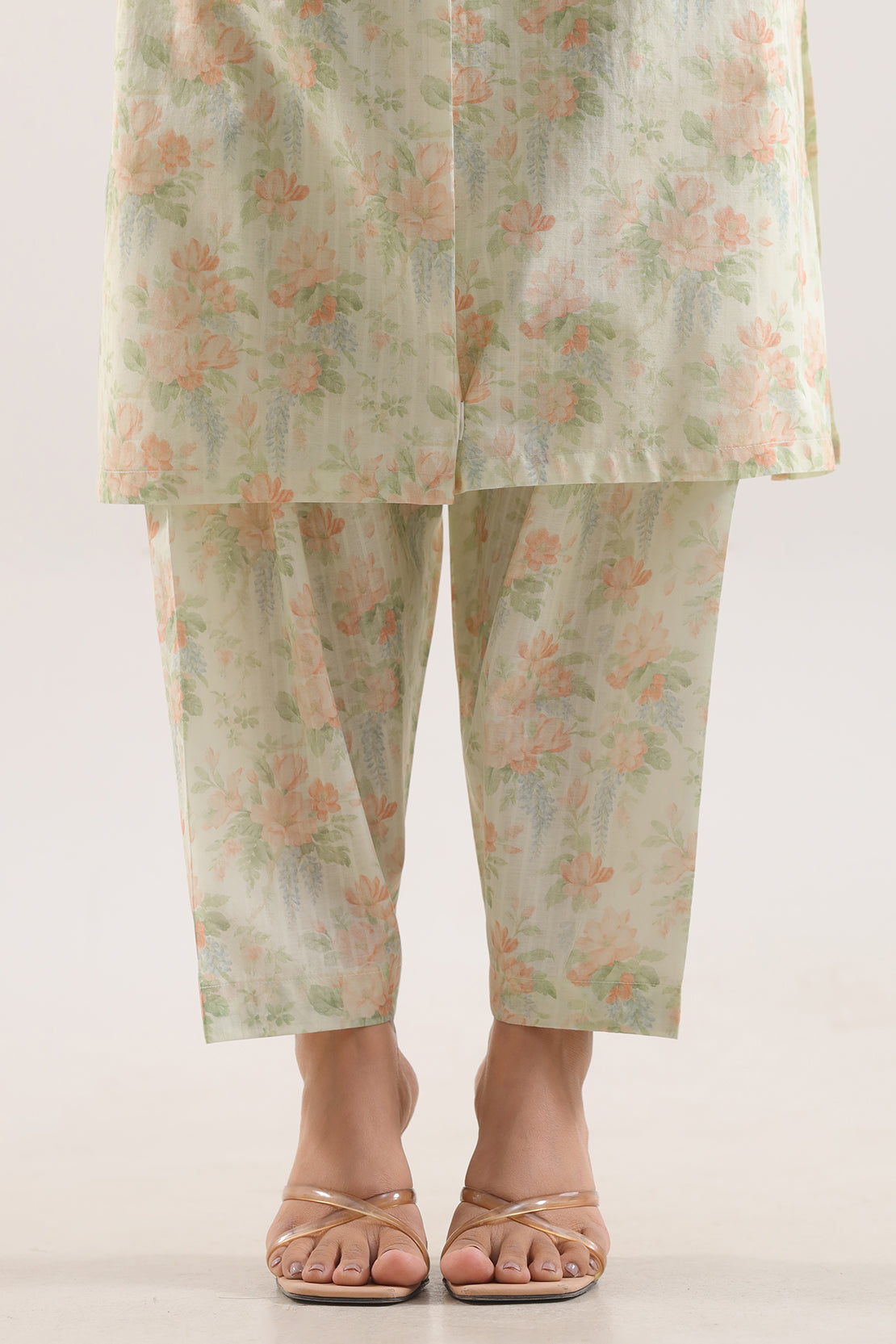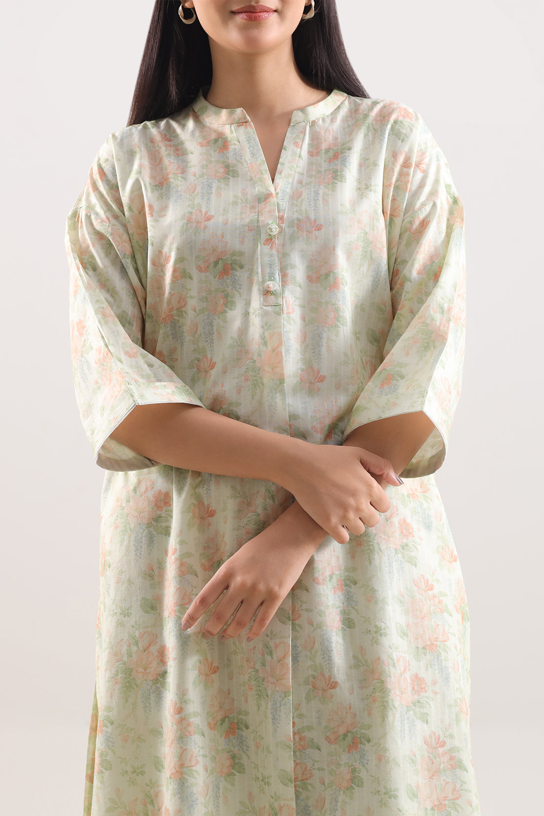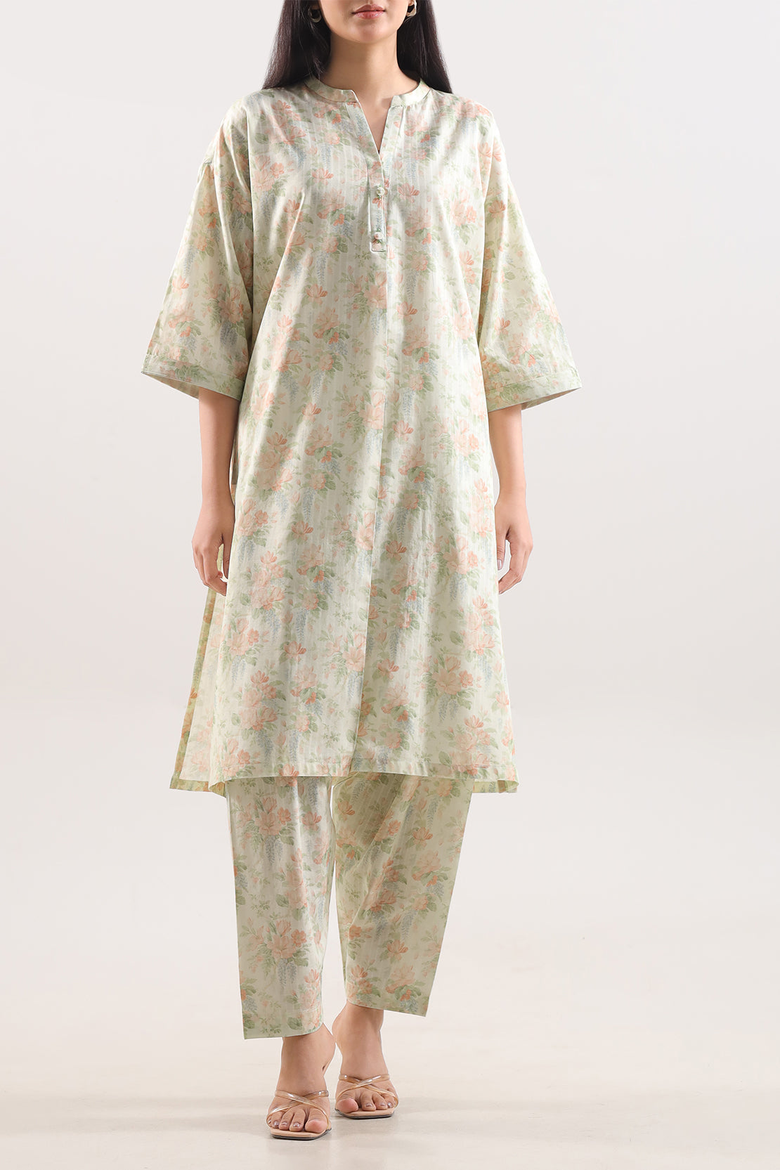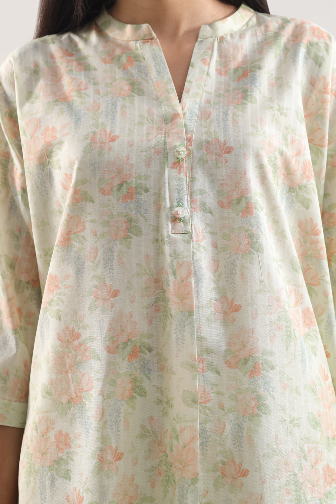 Printed Self-Strip Lawn Stitched 2-Piece Set By SAYA Is Crafted From Lightweight, Breathable Lawn Fabric — A Fine Plain-Weave Material Known For Its Soft, Feel And Excellent Air Circulation. The Subtle Self-Stripe Print Adds Sophisticated Texture While Maintaining A Refined, Elegant Look. This Ready-To-Wear Ensemble Features A Tailored Shirt And Matching Trouser, Both Cut For A Flattering Yet Comfortable Fit That Works Perfectly For Daytime Gatherings, Casual Events, Or Smart-Casual Outings. The Lawn Material Offers Exceptional Quality: Durable Yet Delicate, With A Lightweight Drape That Enhances Wearability In Warm Climates
