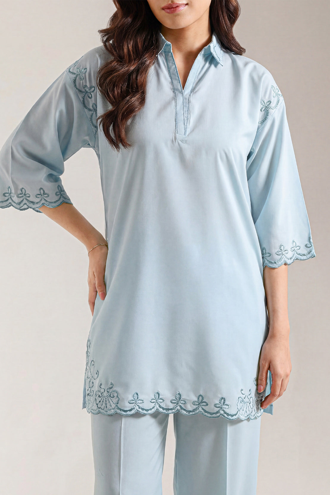 Solid Easy-Care Weave Stitched 2-Piece By SAYA Shines In A Soothing Mint Green Tone. Crafted From Low-Maintenance Polyester Blend With A Soft Weave That Resists Wrinkles, It Offers Effortless Elegance All Day. The Shirt Features Delicate Embroidery, Neat Collar, And Crisp Stitching, While The Trouser Delivers Structure And Comfort. Ideal For Office Wear Or Smart Casual Occasions Where Polished Style And Ease Are Equally Valued.